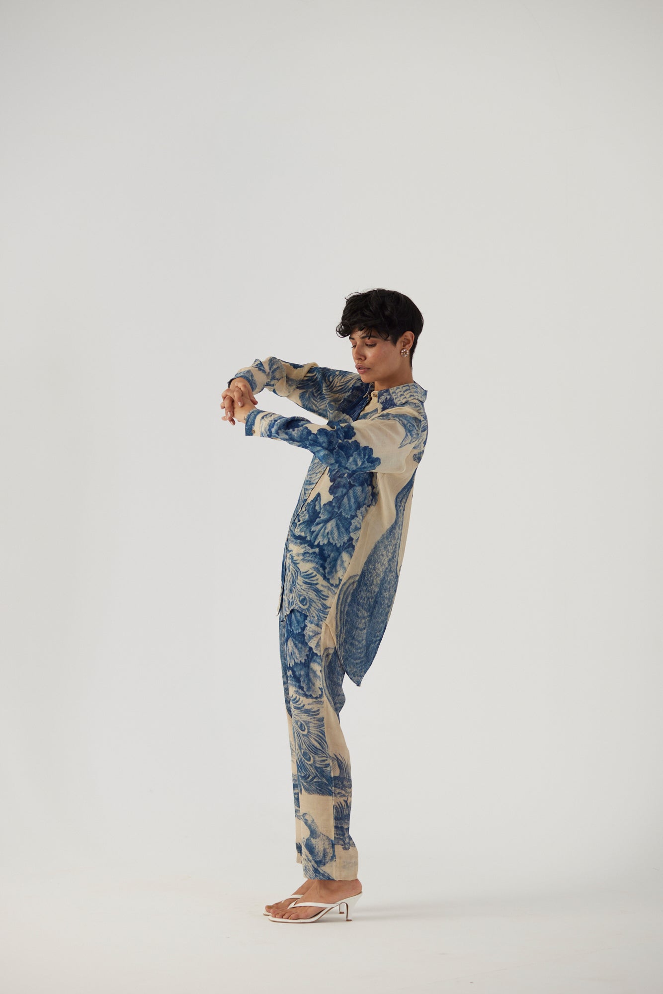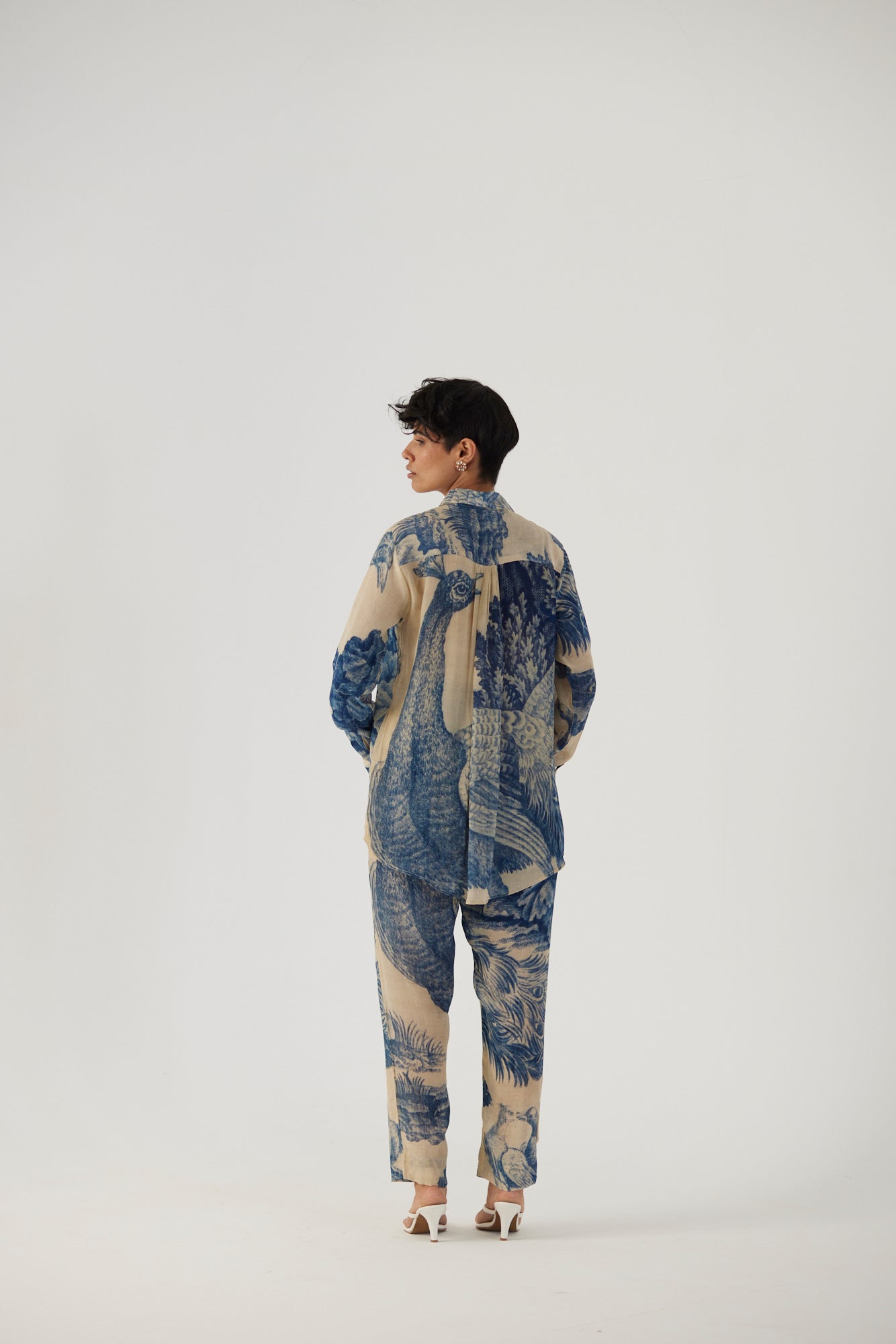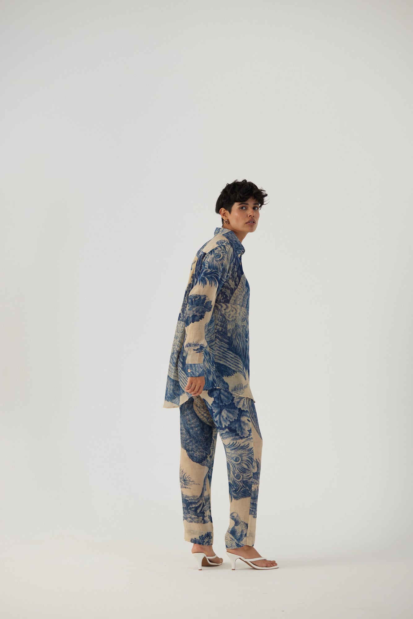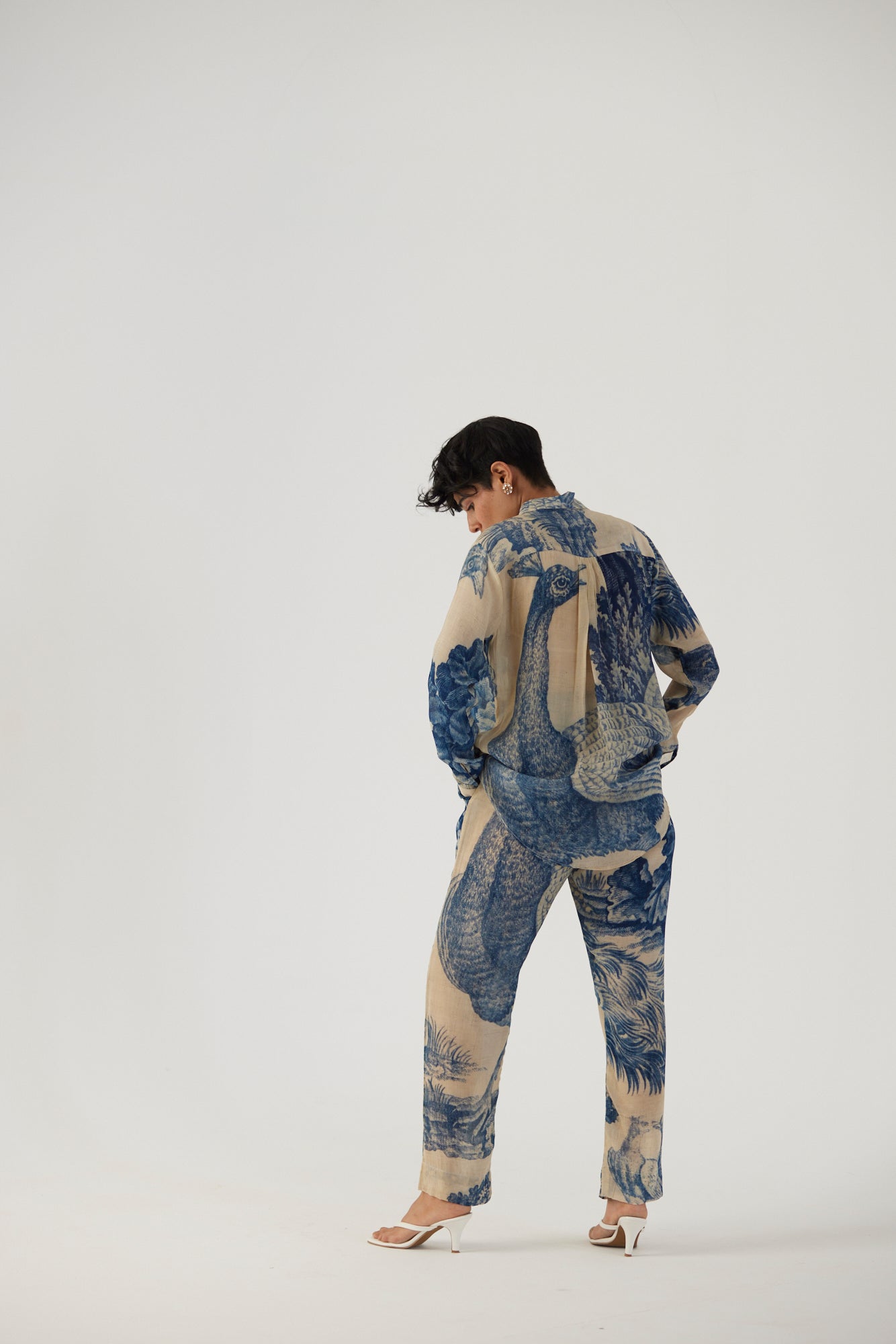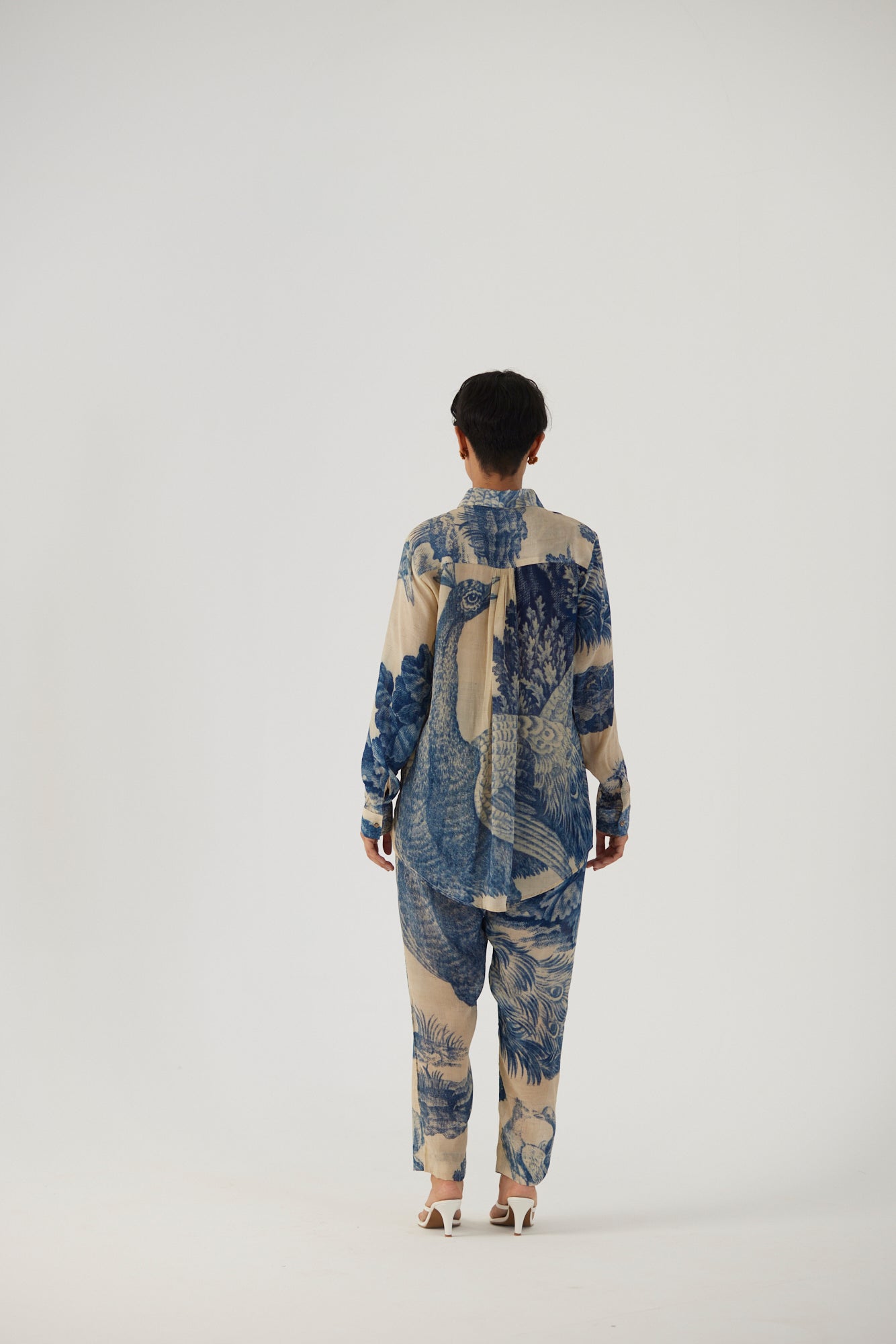 This print features a MOR(peacock) with intricate details and bold lines in the indigo colour.
