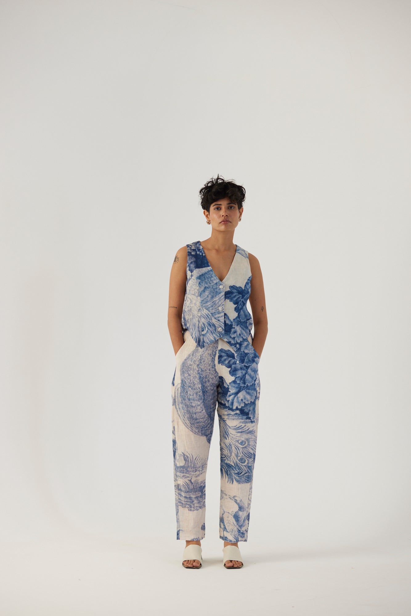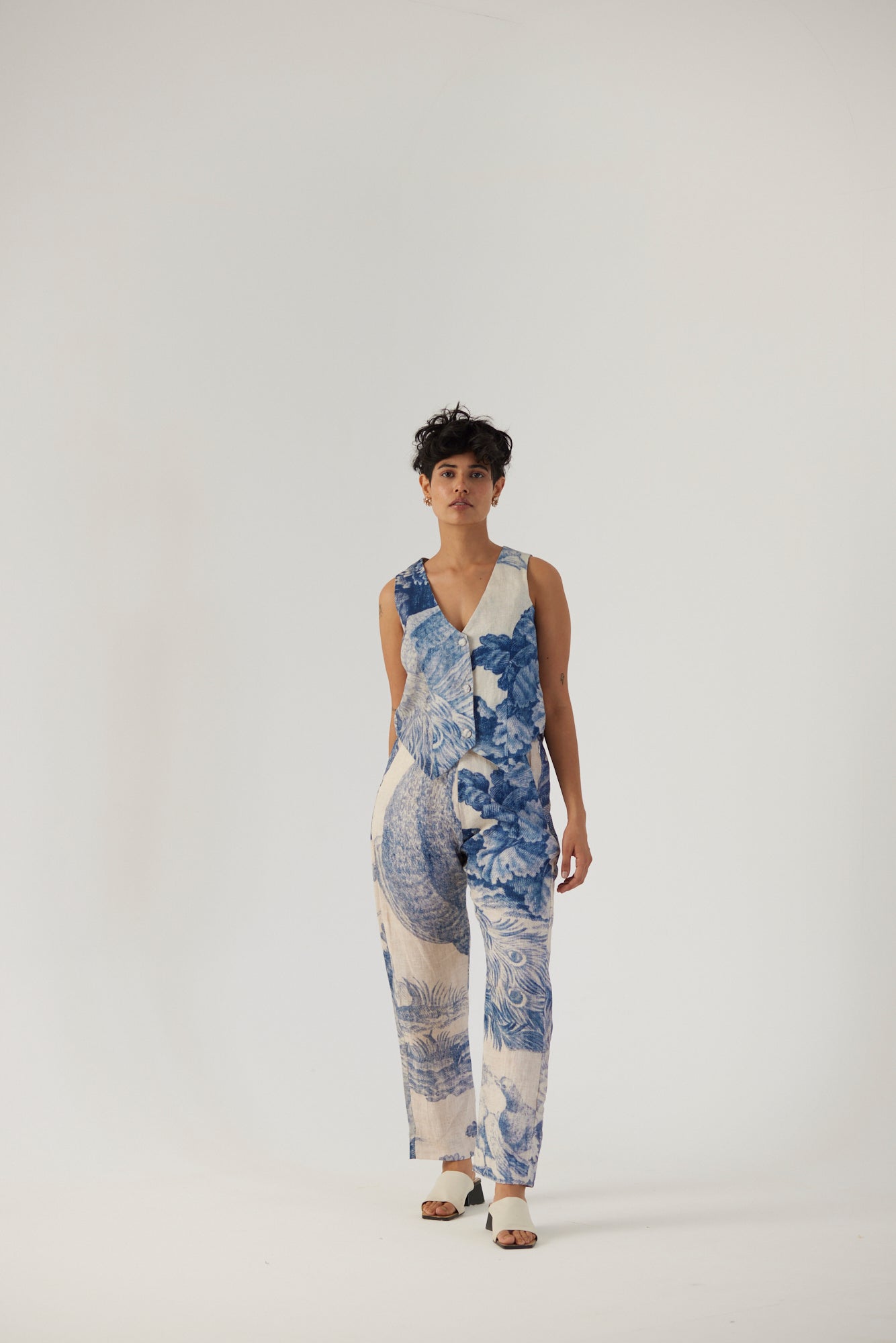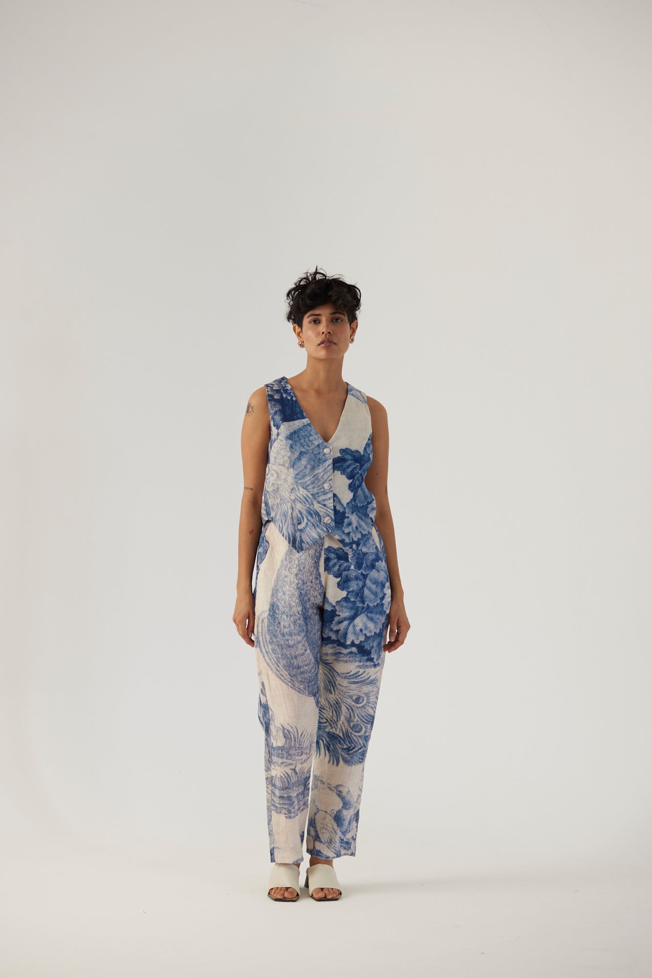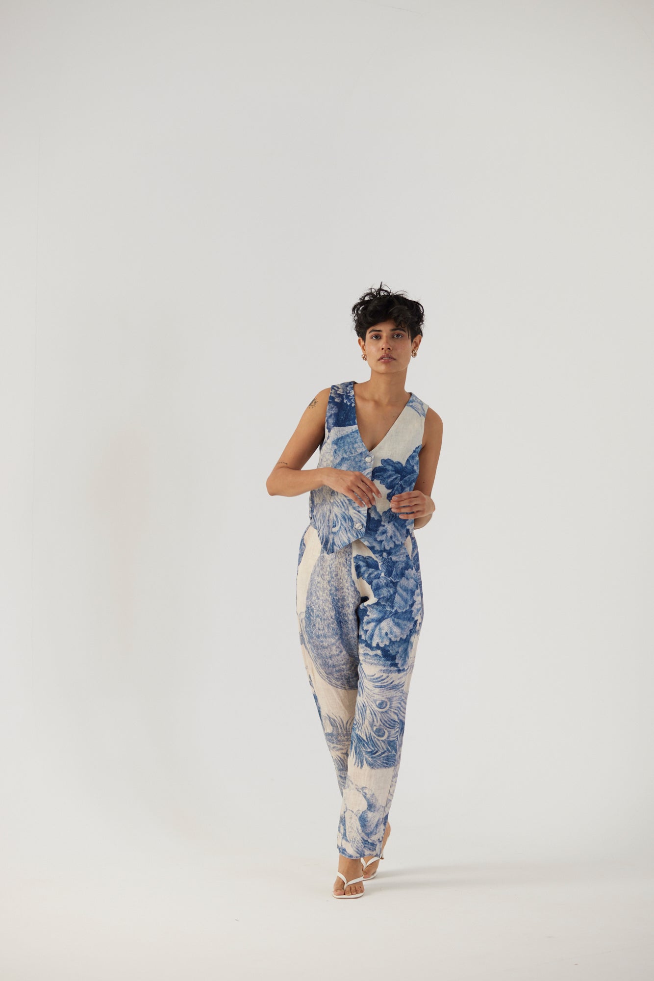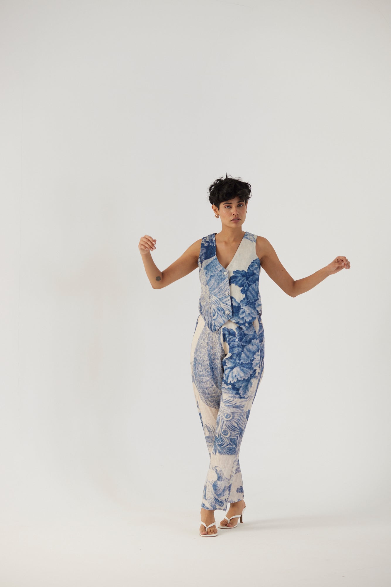 This print features a MOR(peacock) with intricate details and bold lines in the indigo colour. The print is carefully printed on linens. The jacket is of short sleeveless waistcoat in a V- neckline.