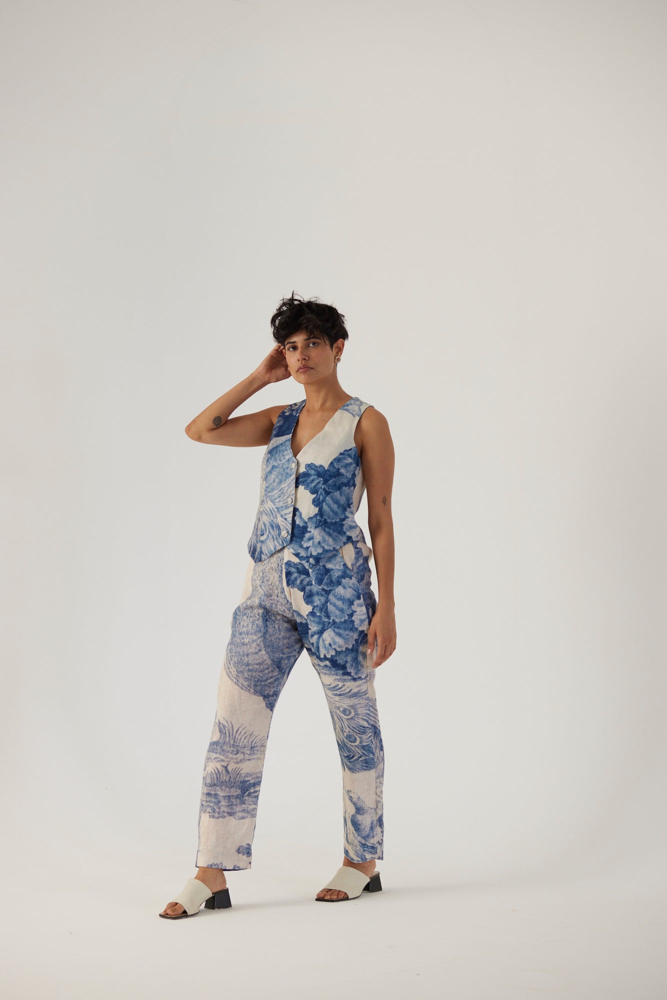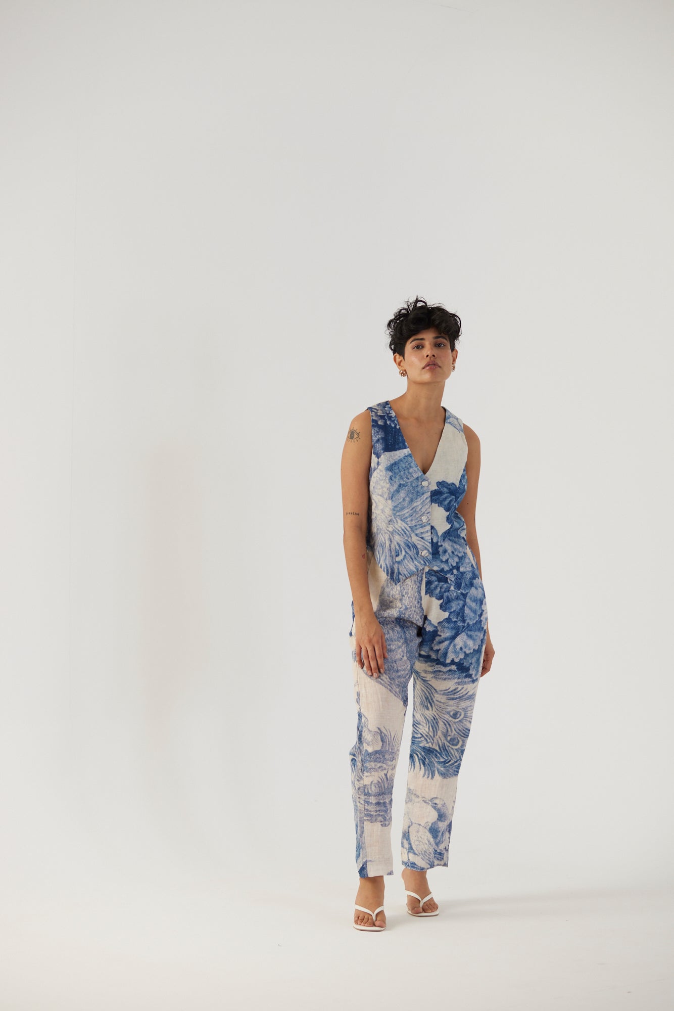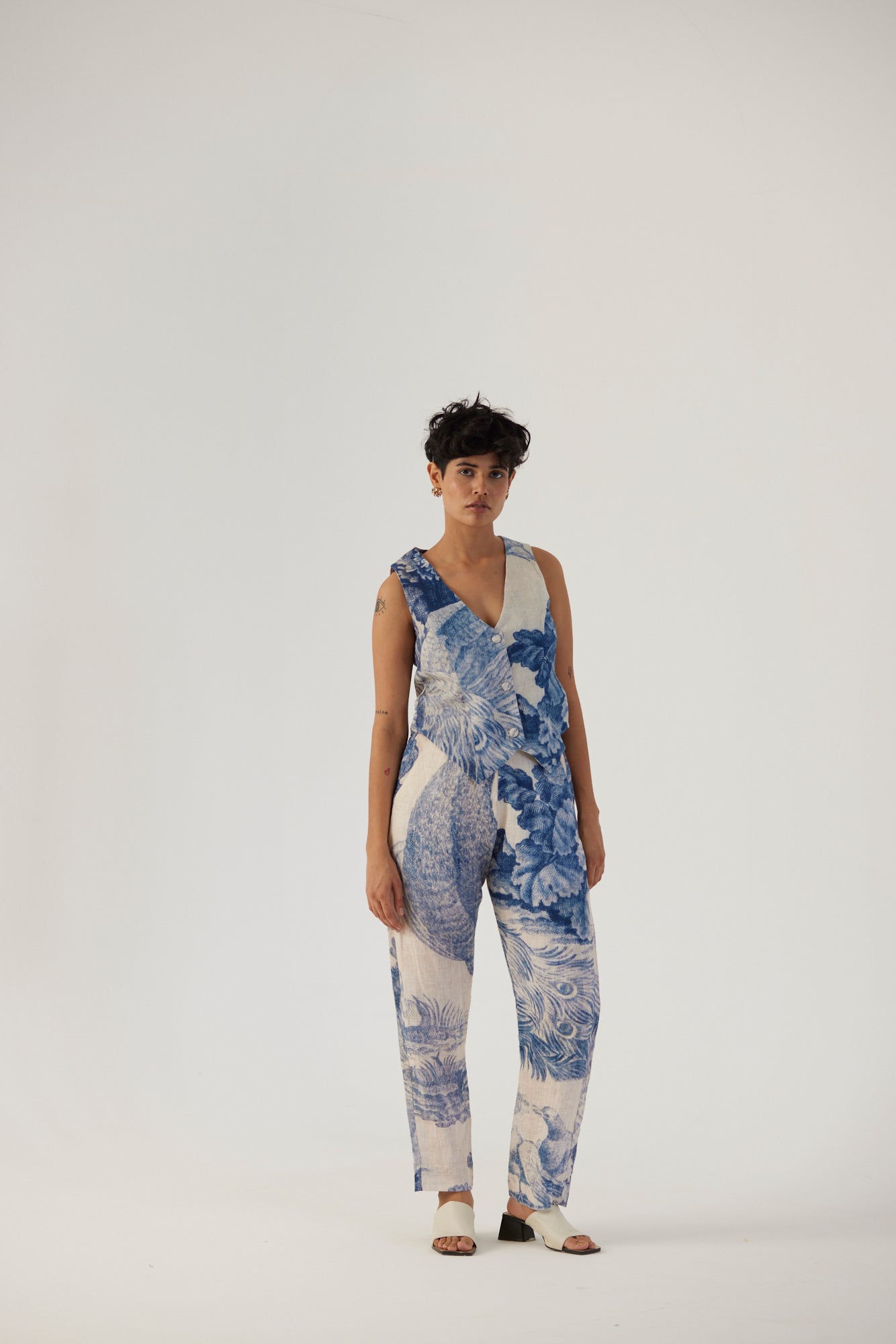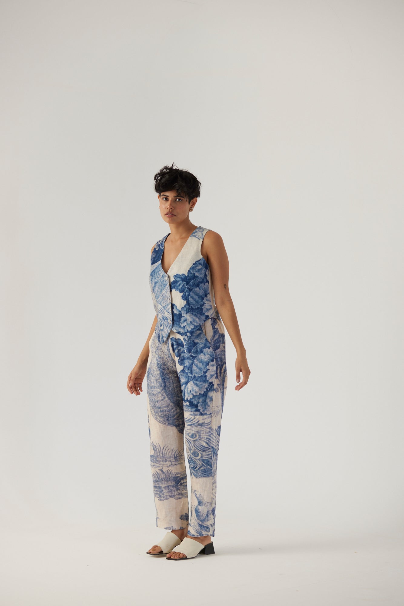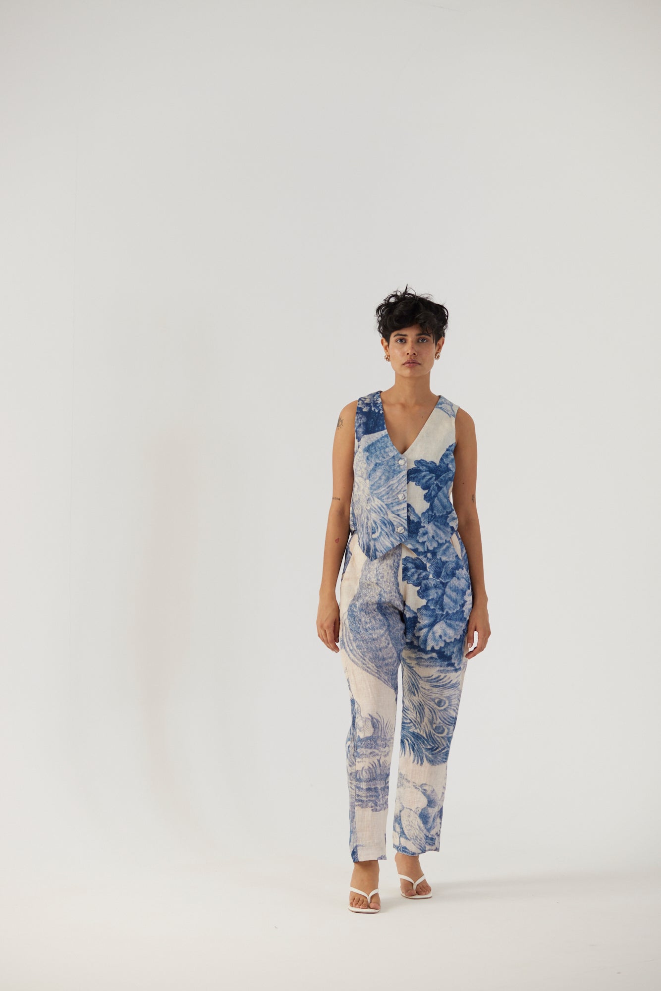 This print features a MOR(peacock) with intricate details and bold lines in the indigo colour. The print is carefully printed on linens. The jacket is of short sleeveless waistcoat in a V- neckline.