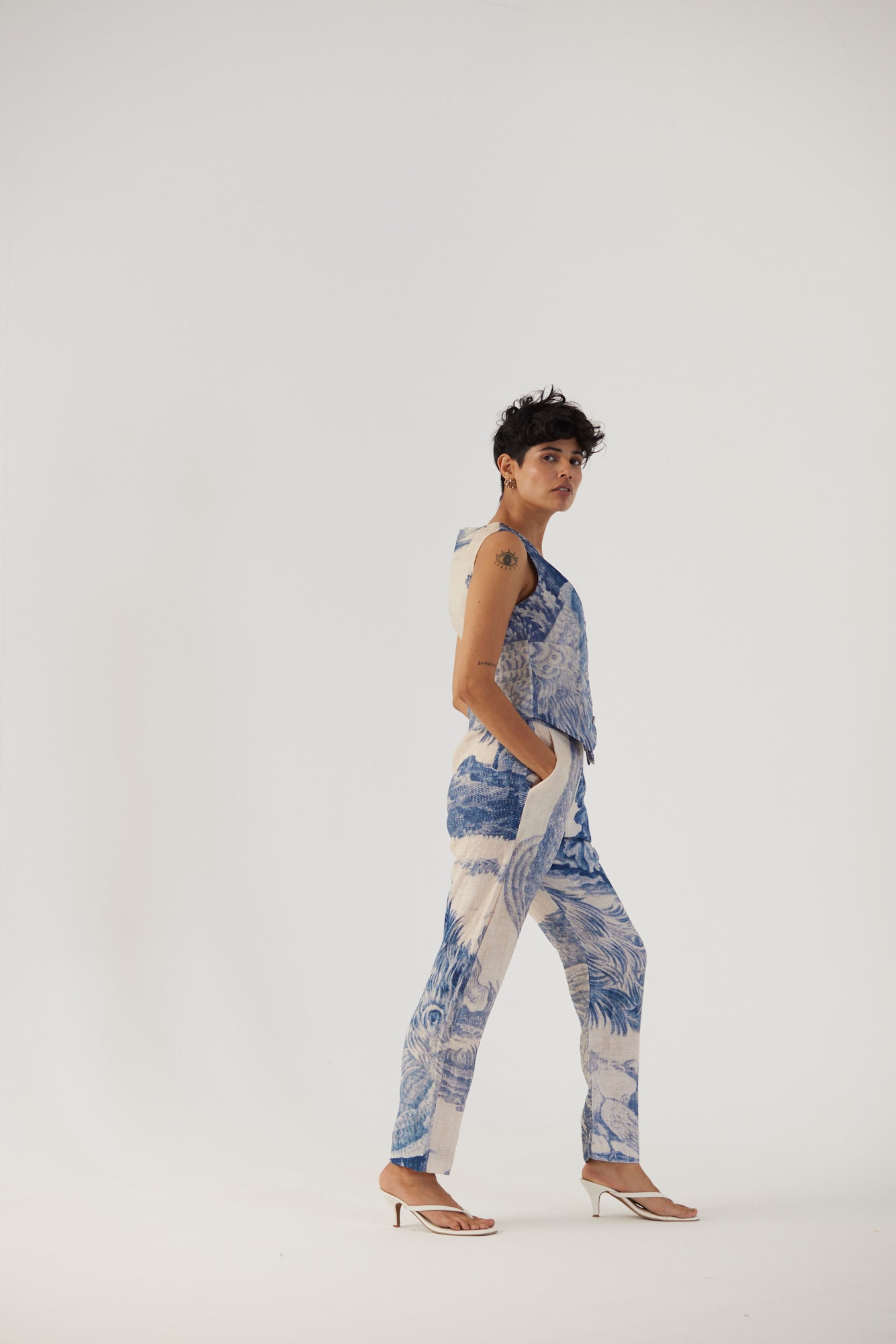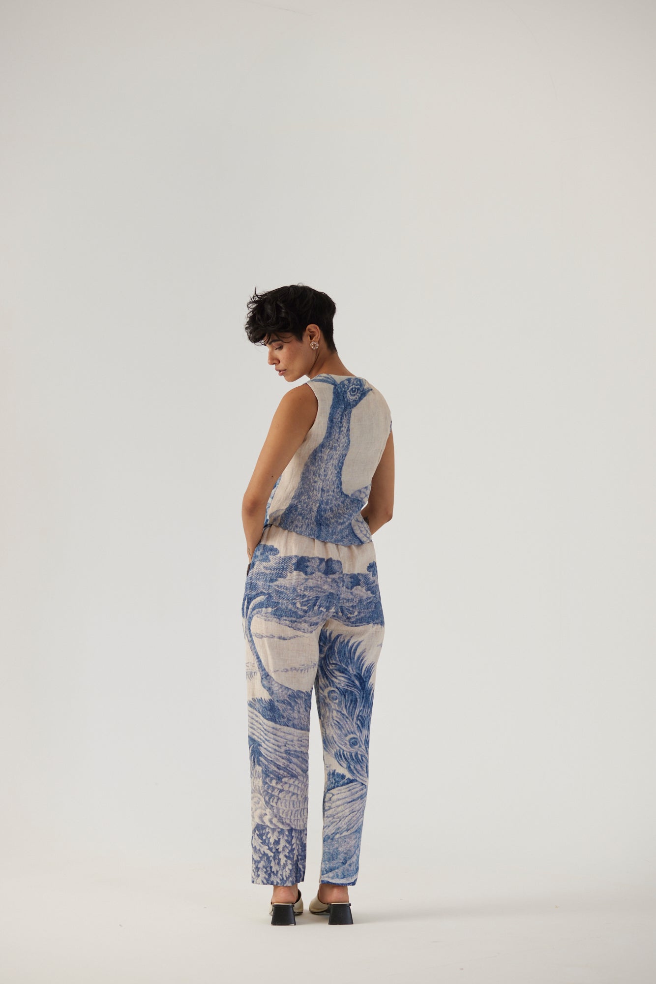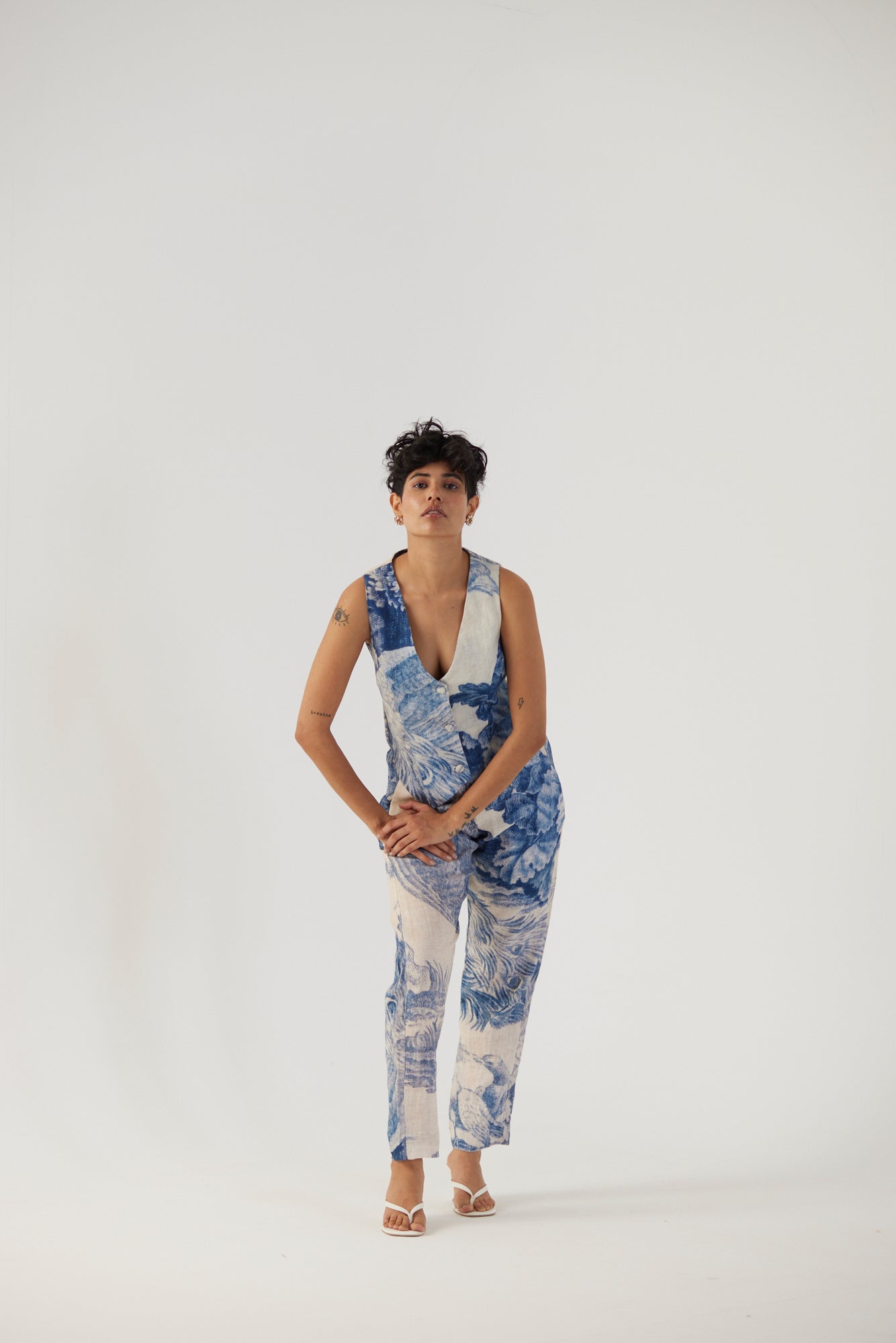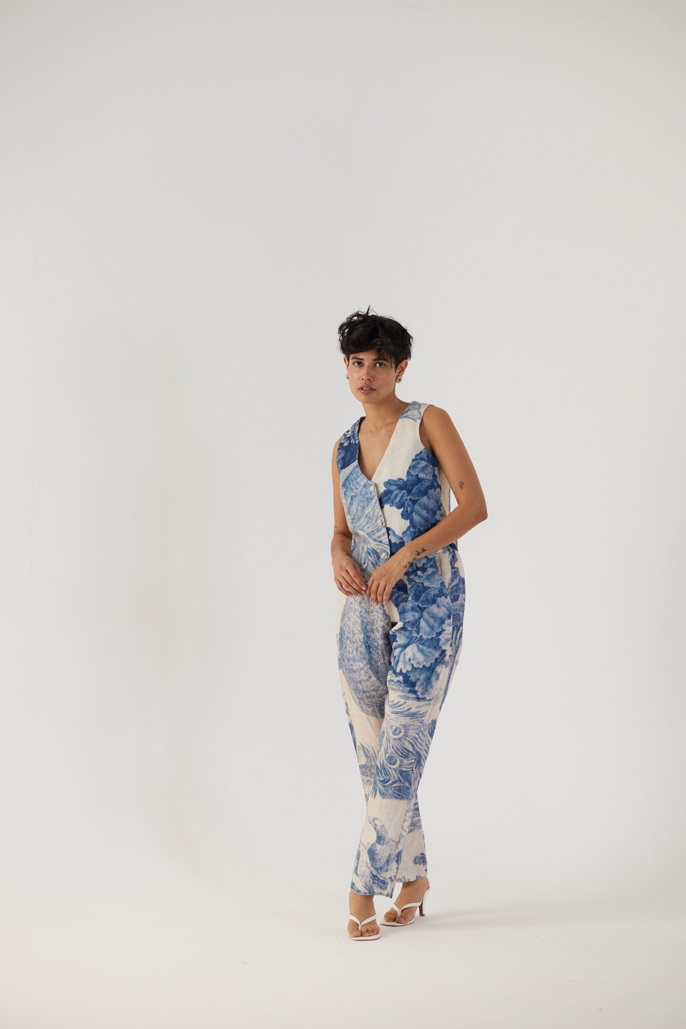 This print features a MOR(peacock) with intricate details and bold lines in the indigo colour. The print is carefully printed on linens. The jacket is of short sleeveless waistcoat in a V- neckline.