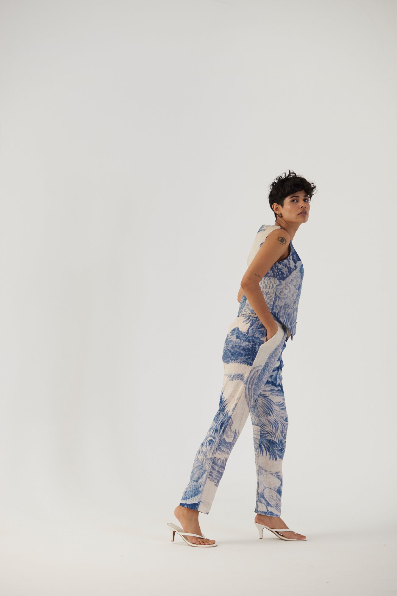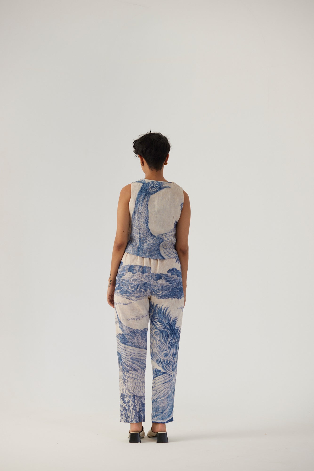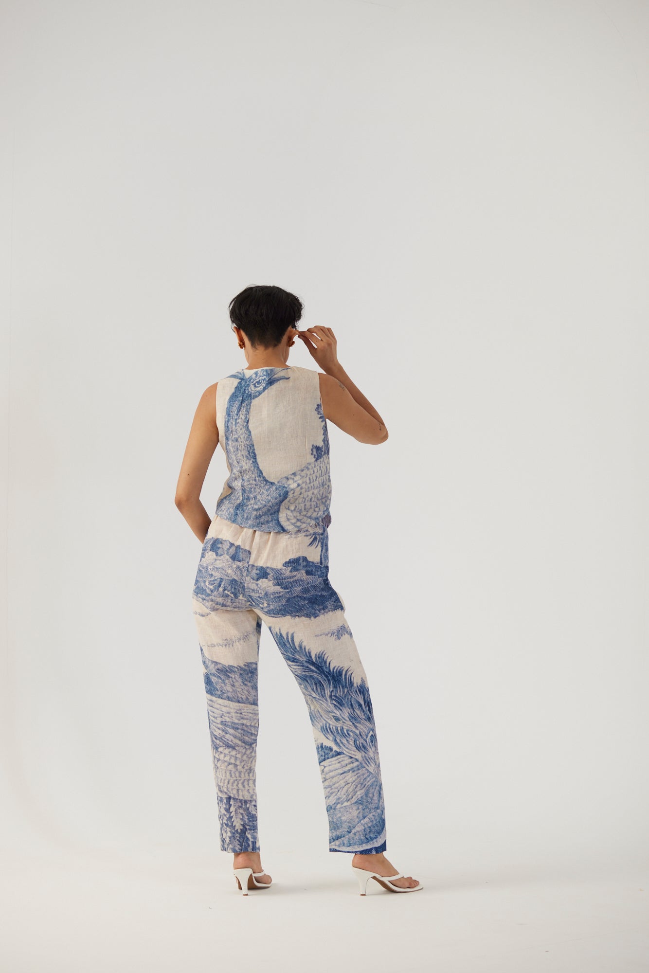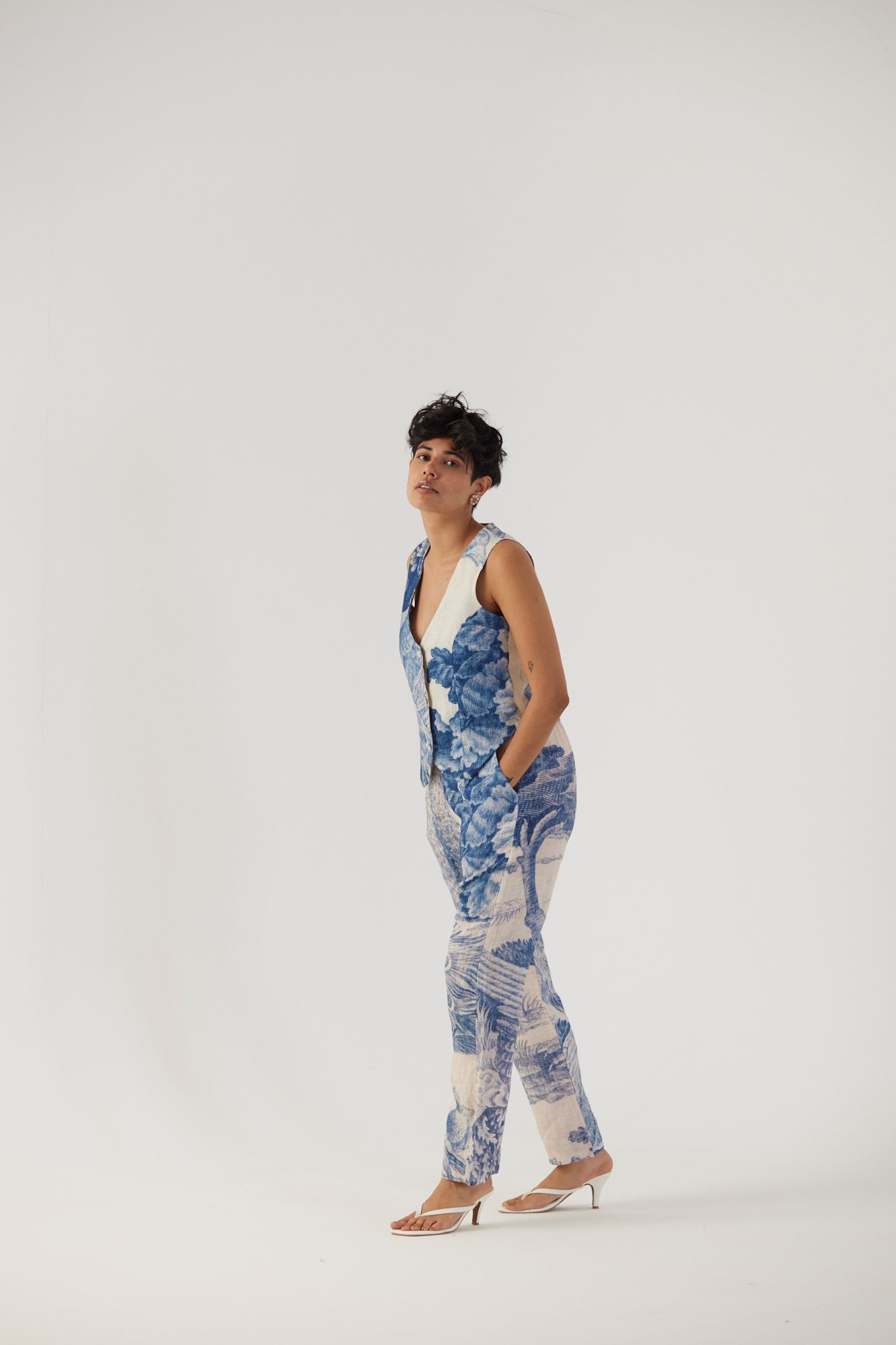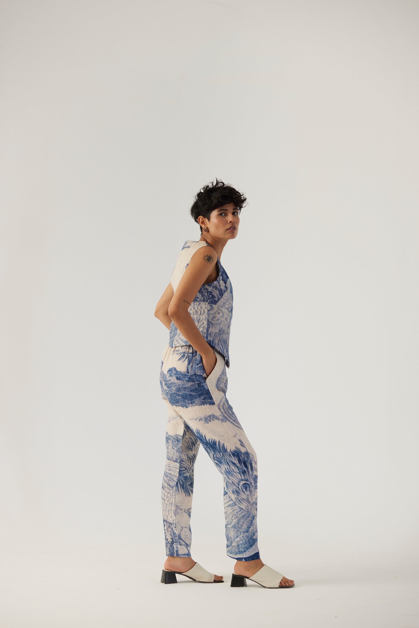 This print features a MOR(peacock) with intricate details and bold lines in the indigo colour. The print is carefully printed on linens. The jacket is of short sleeveless waistcoat in a V- neckline.