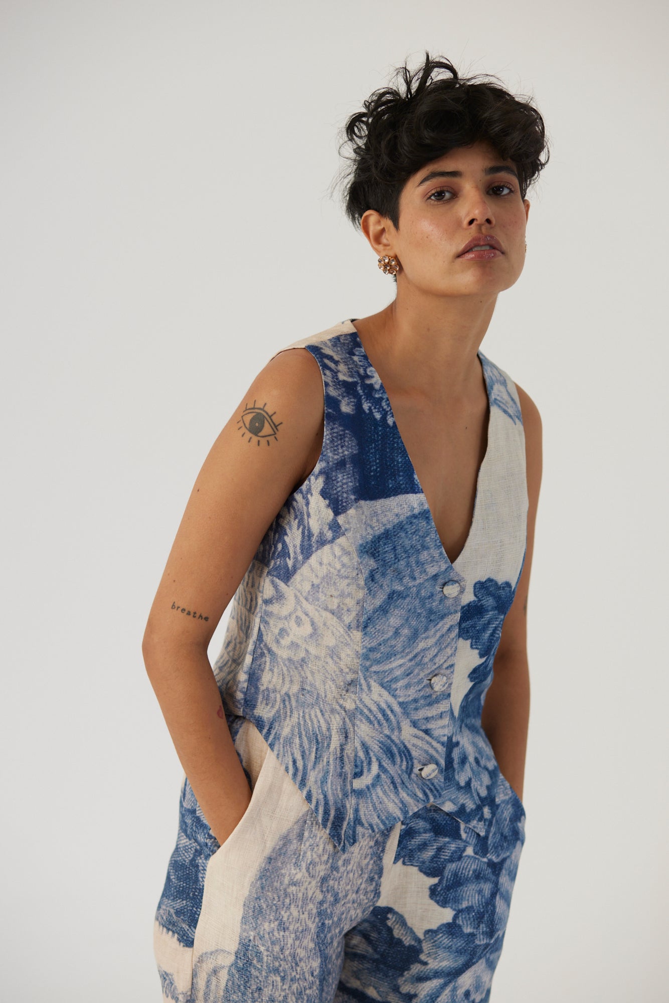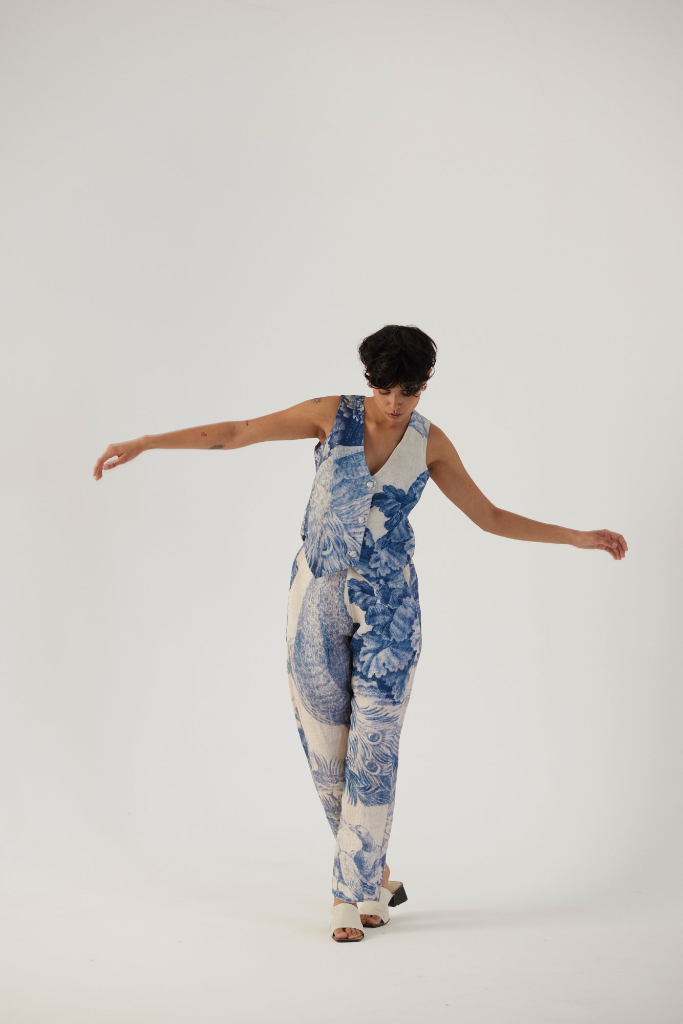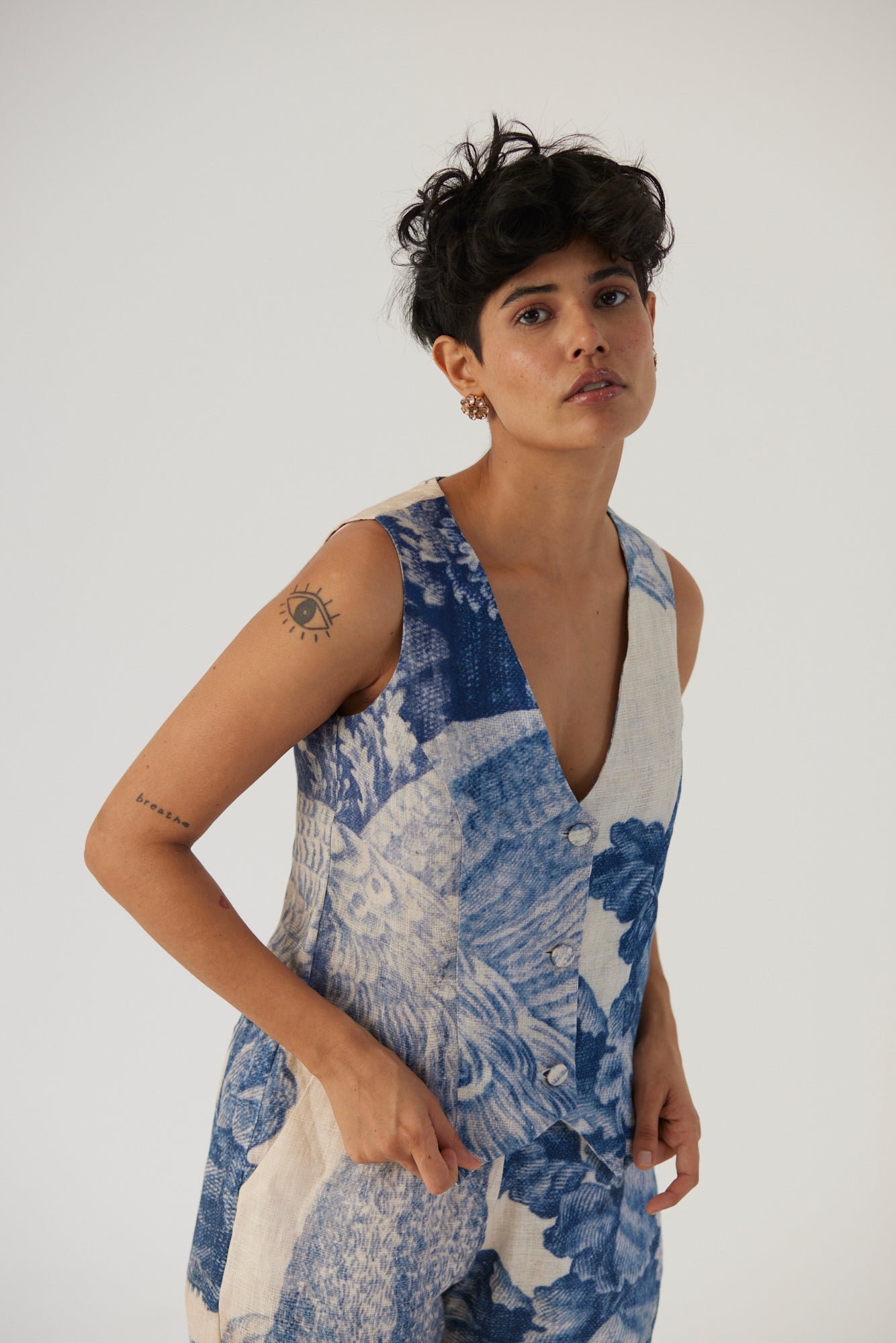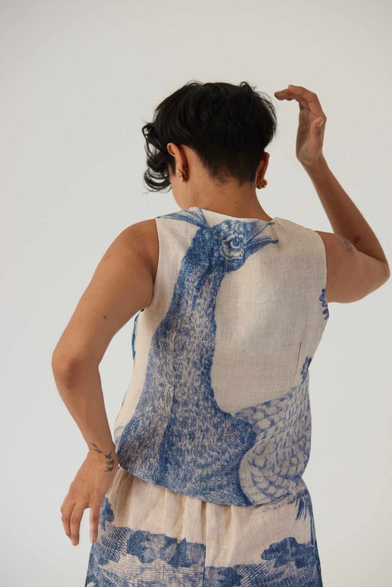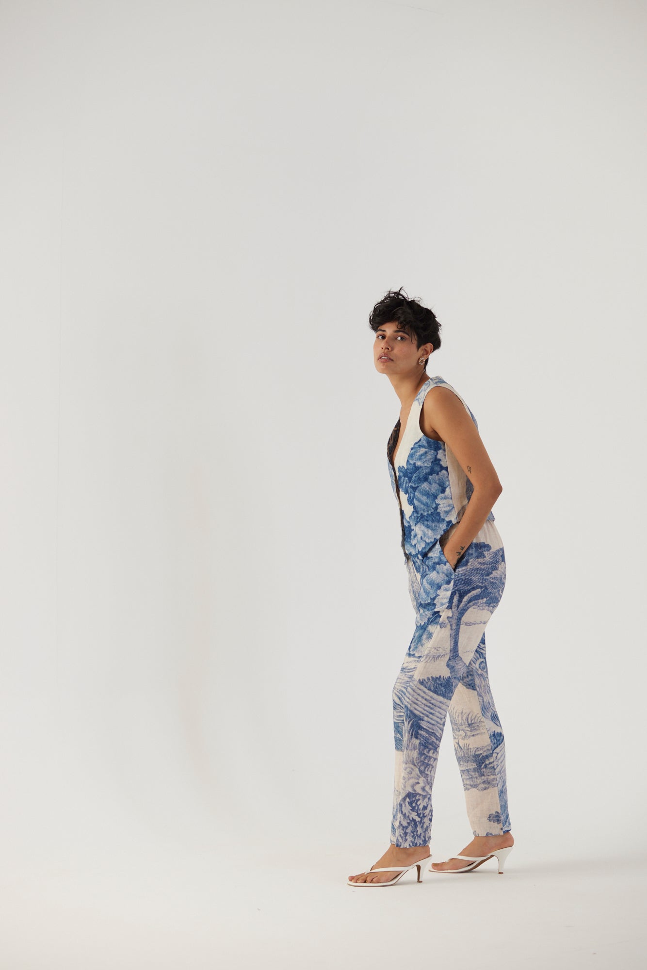 This print features a MOR(peacock) with intricate details and bold lines in the indigo colour. The print is carefully printed on linens. The jacket is of short sleeveless waistcoat in a V- neckline.