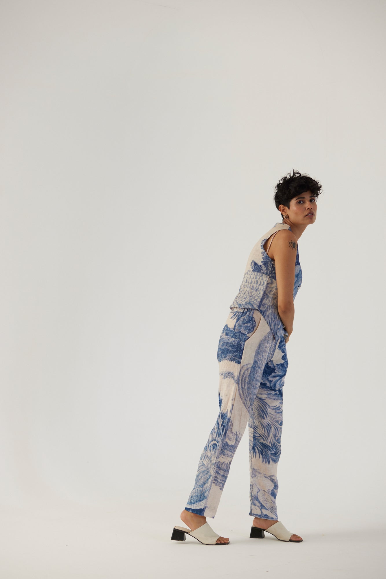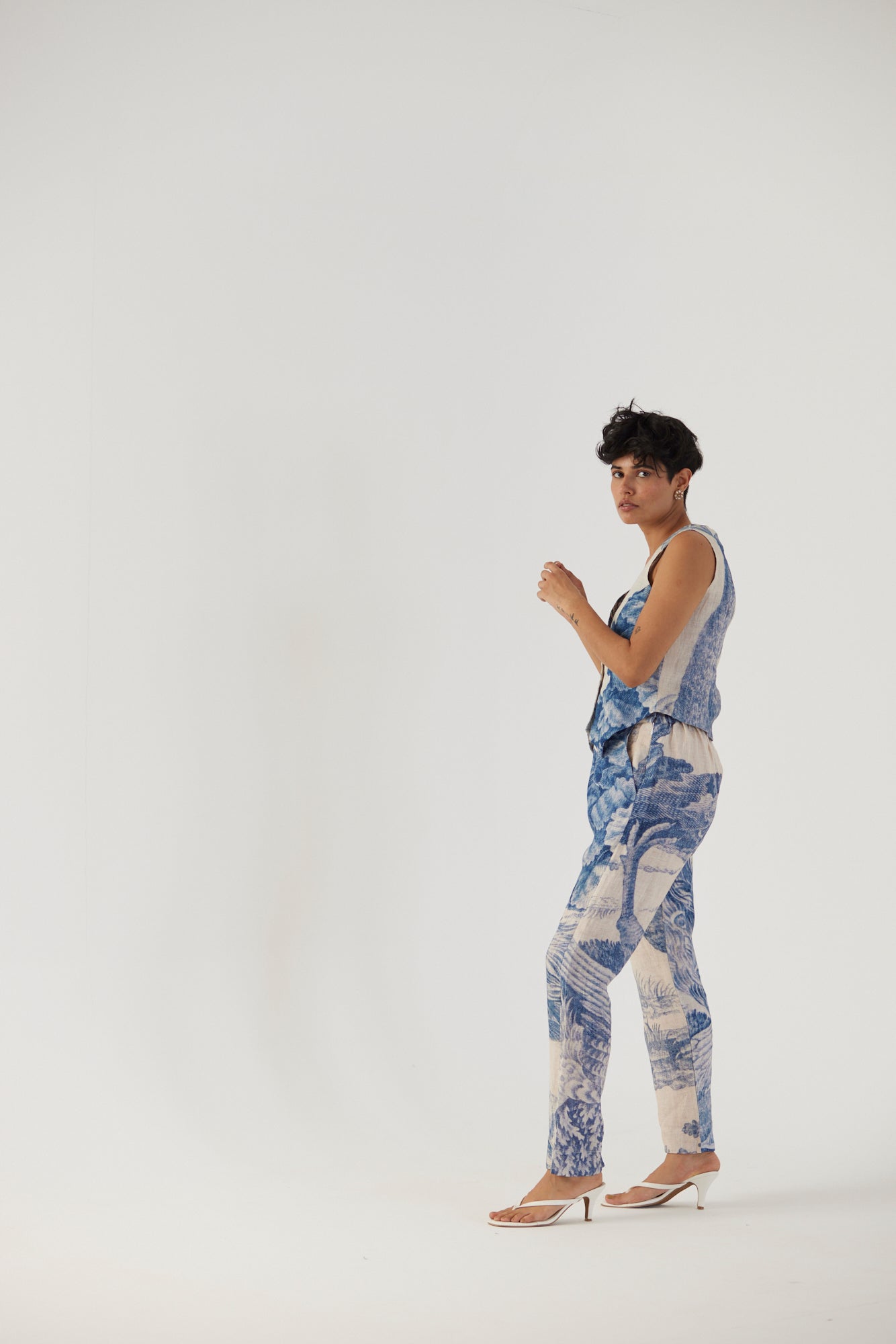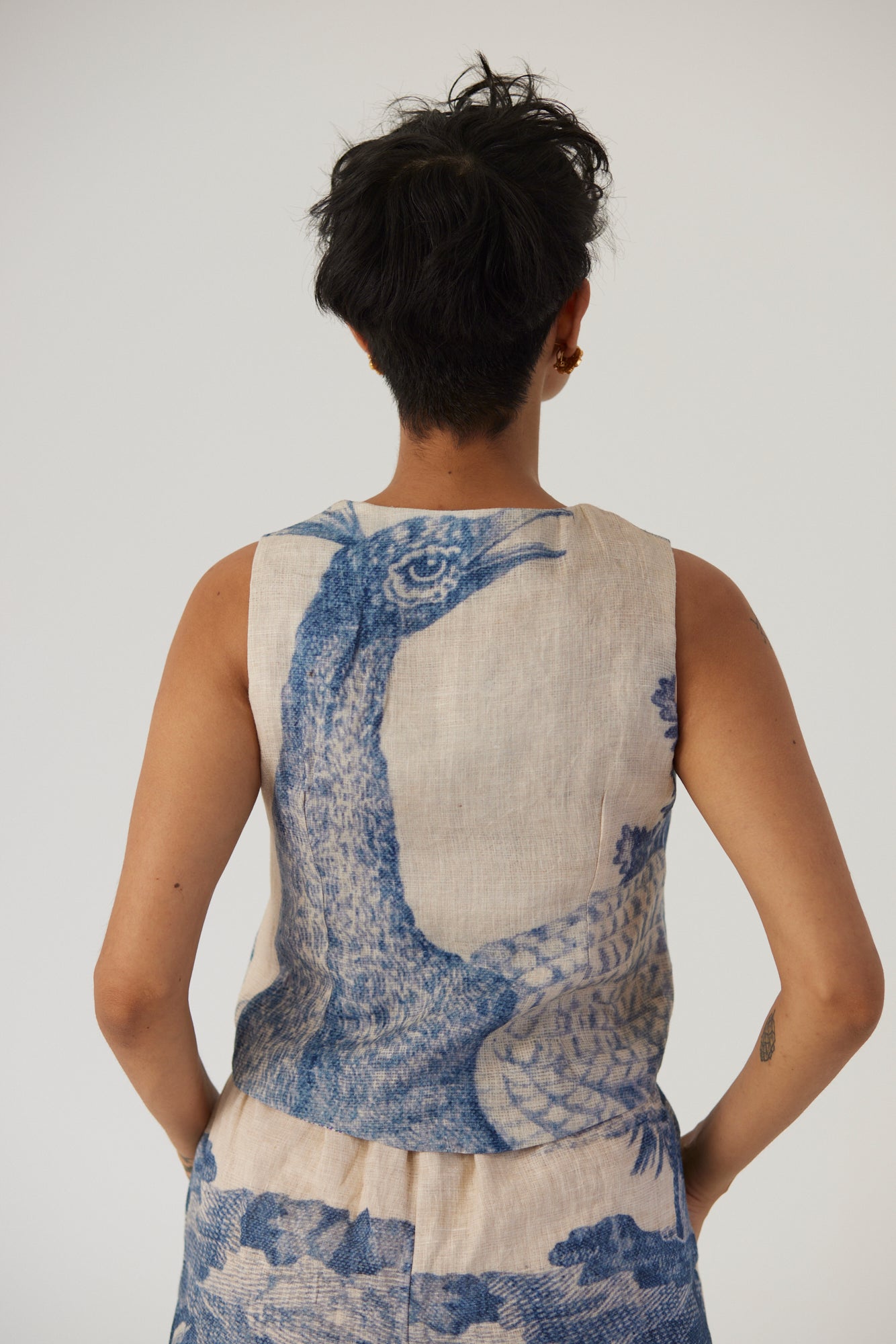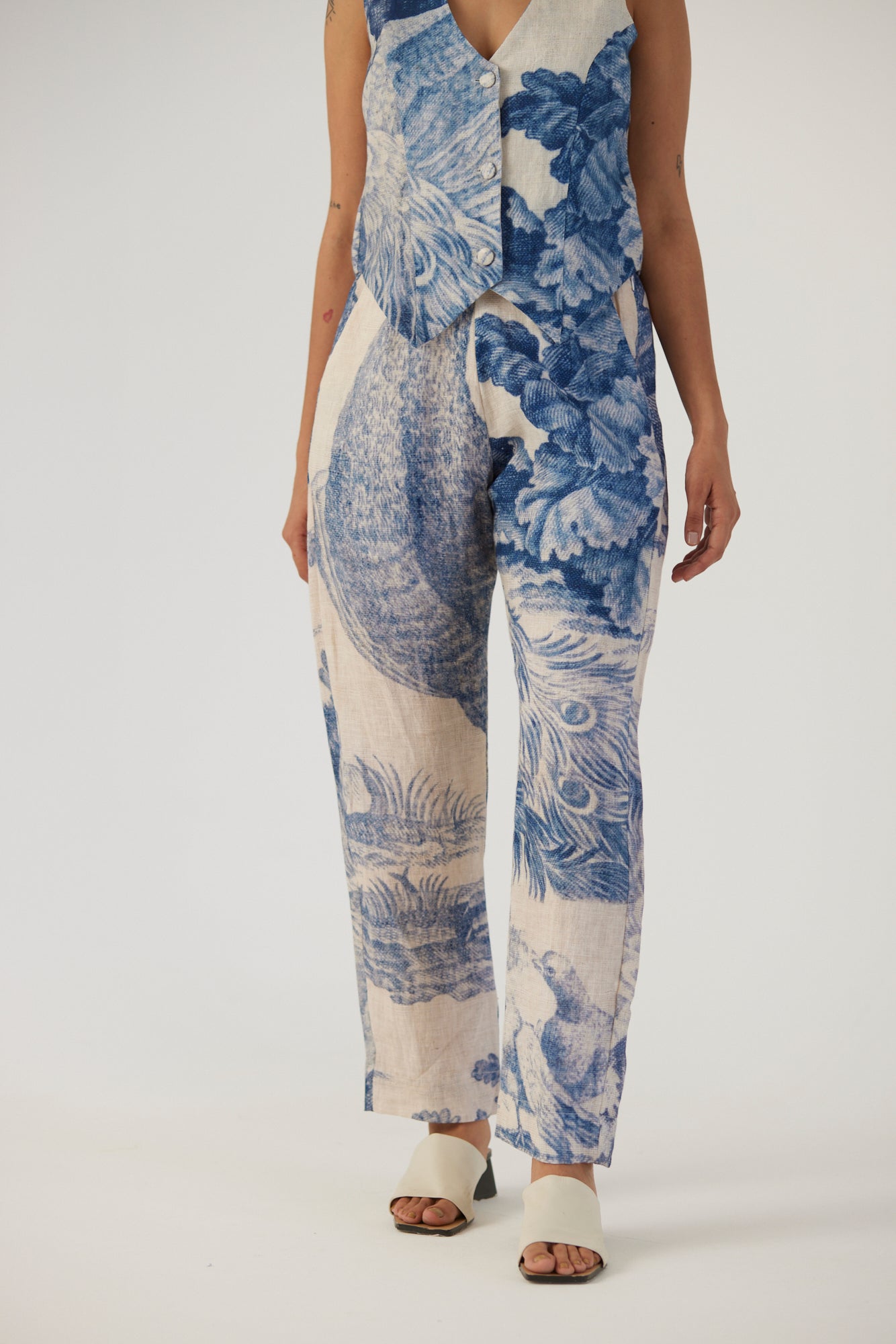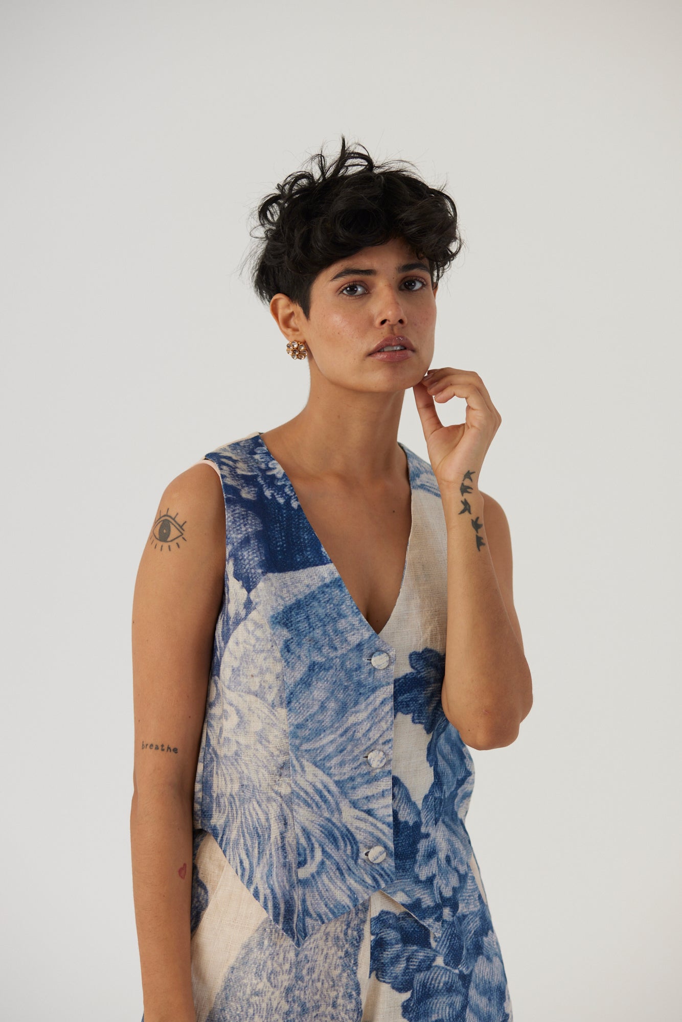This print features a MOR(peacock) with intricate details and bold lines in the indigo colour. The print is carefully printed on linens. The jacket is of short sleeveless waistcoat in a V- neckline.