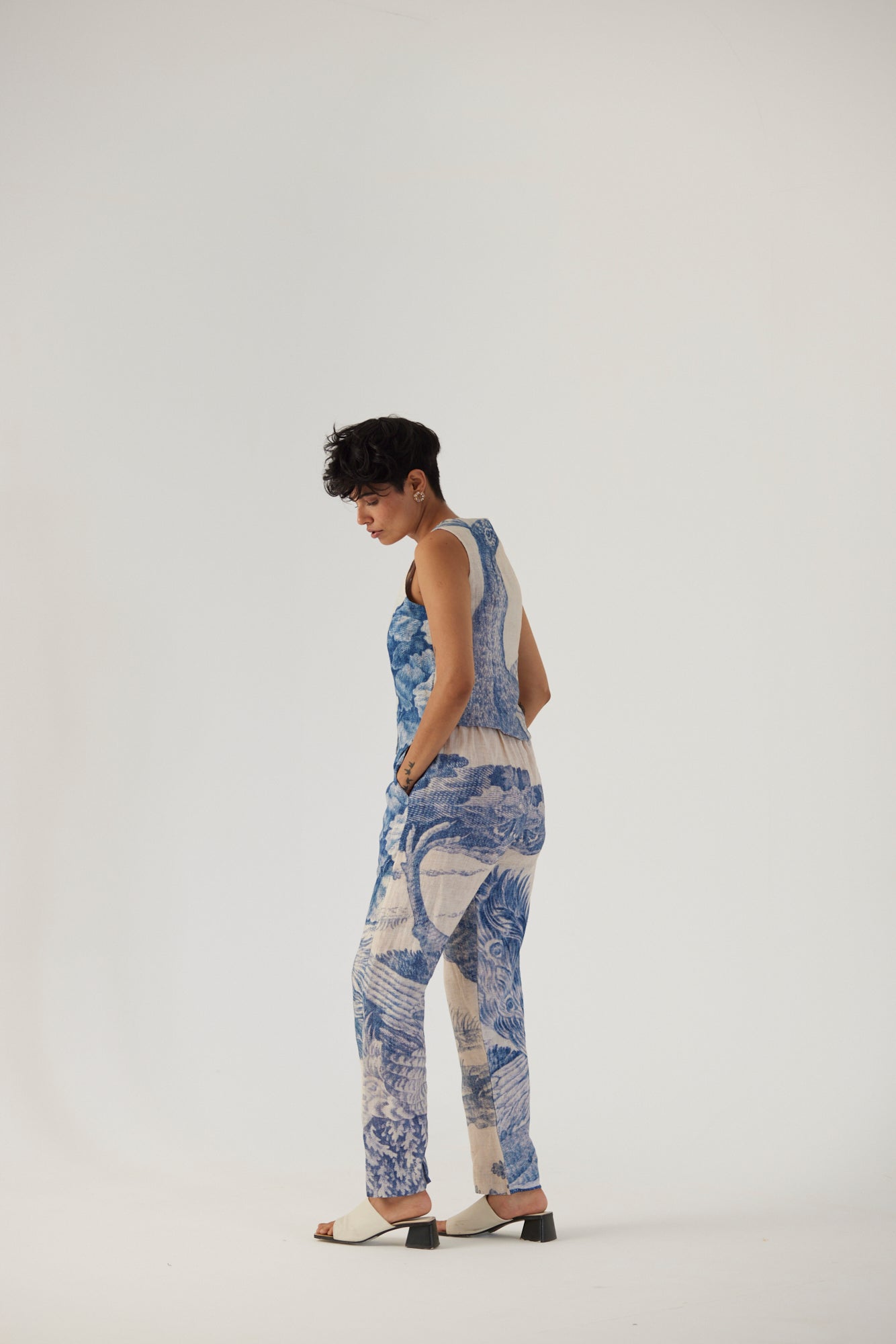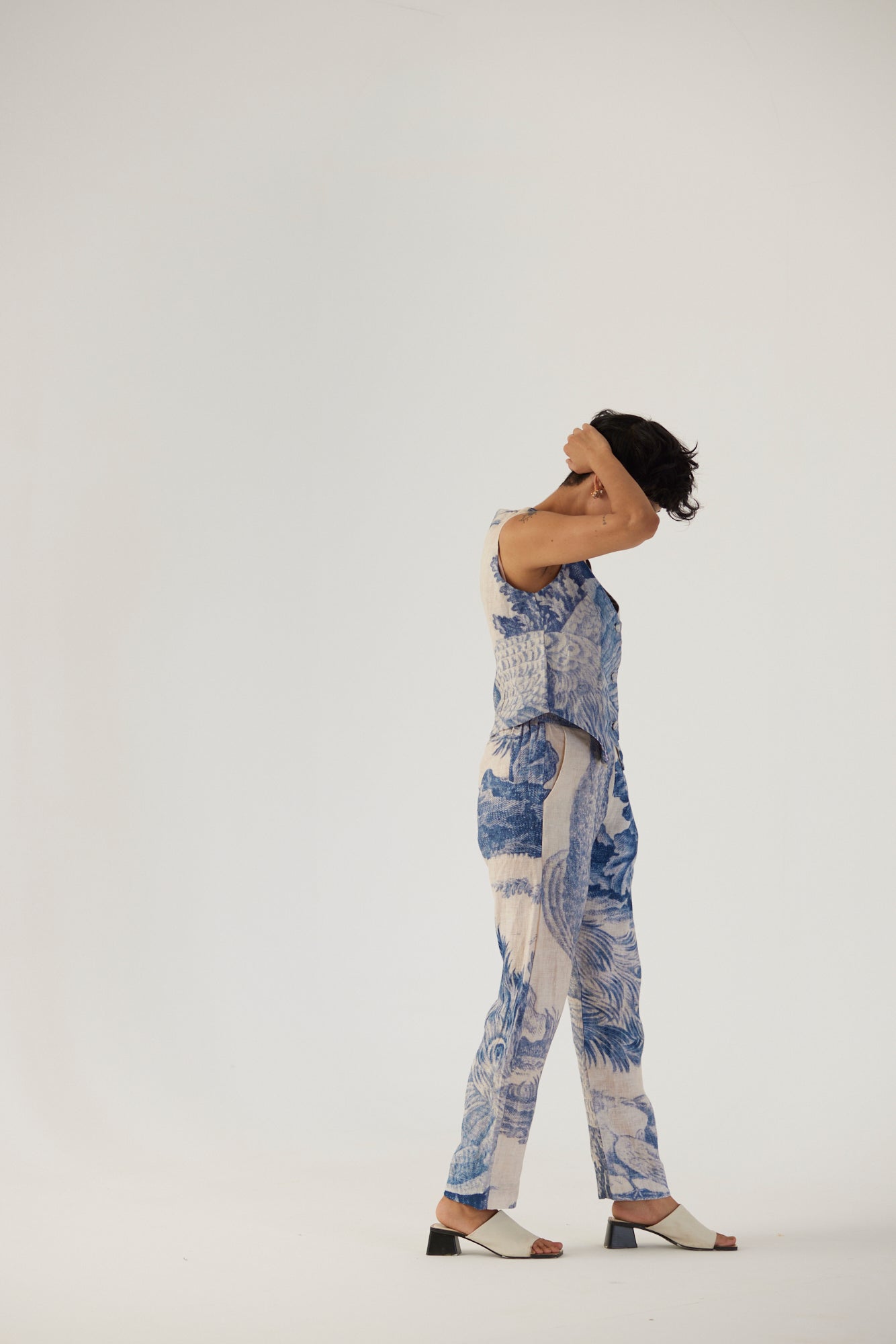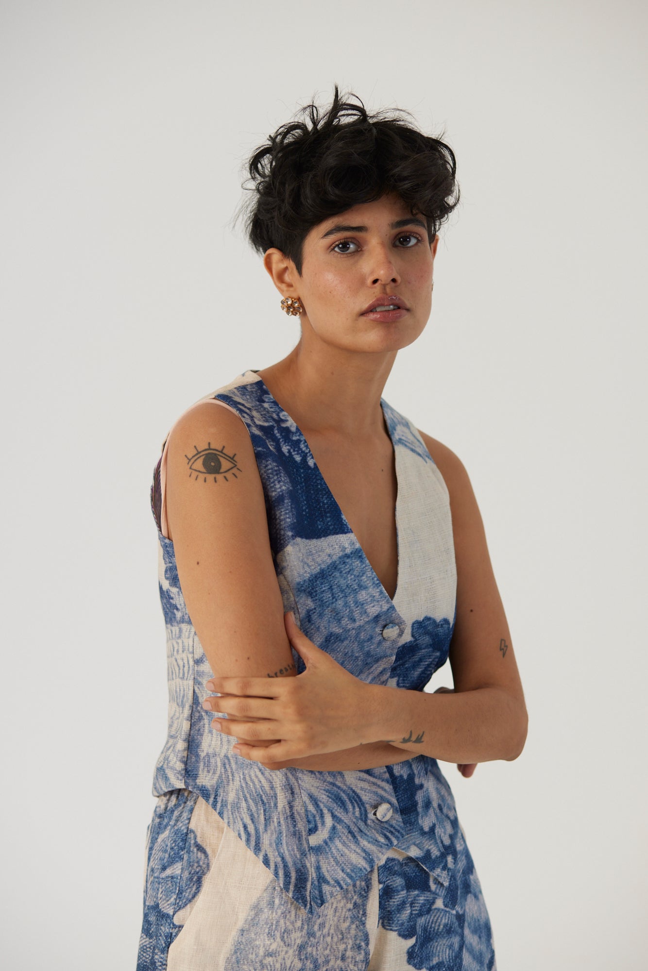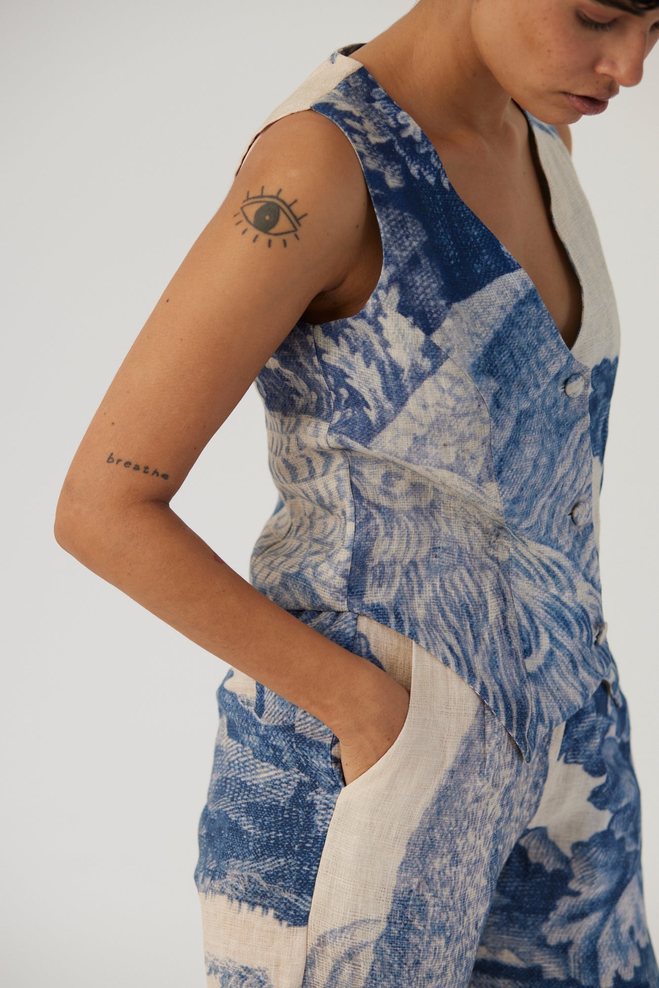 This print features a MOR(peacock) with intricate details and bold lines in the indigo colour. The print is carefully printed on linens. The jacket is of short sleeveless waistcoat in a V- neckline.