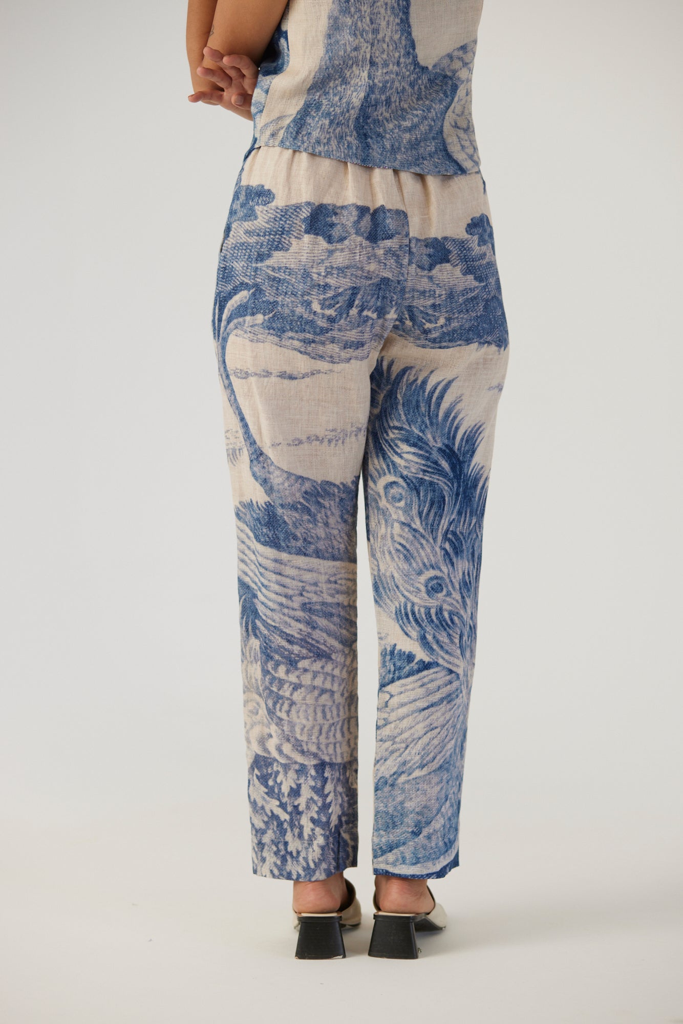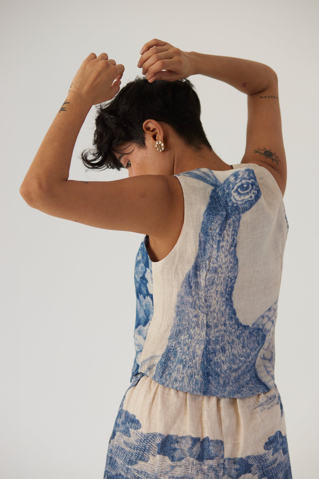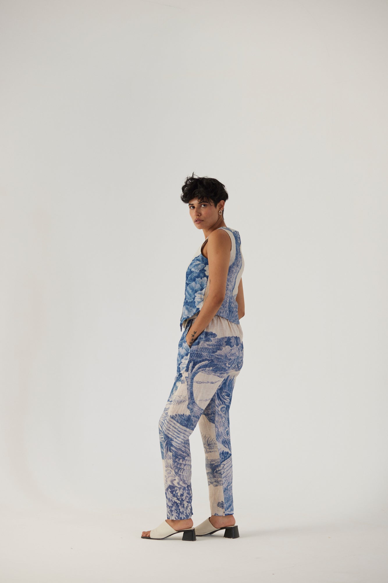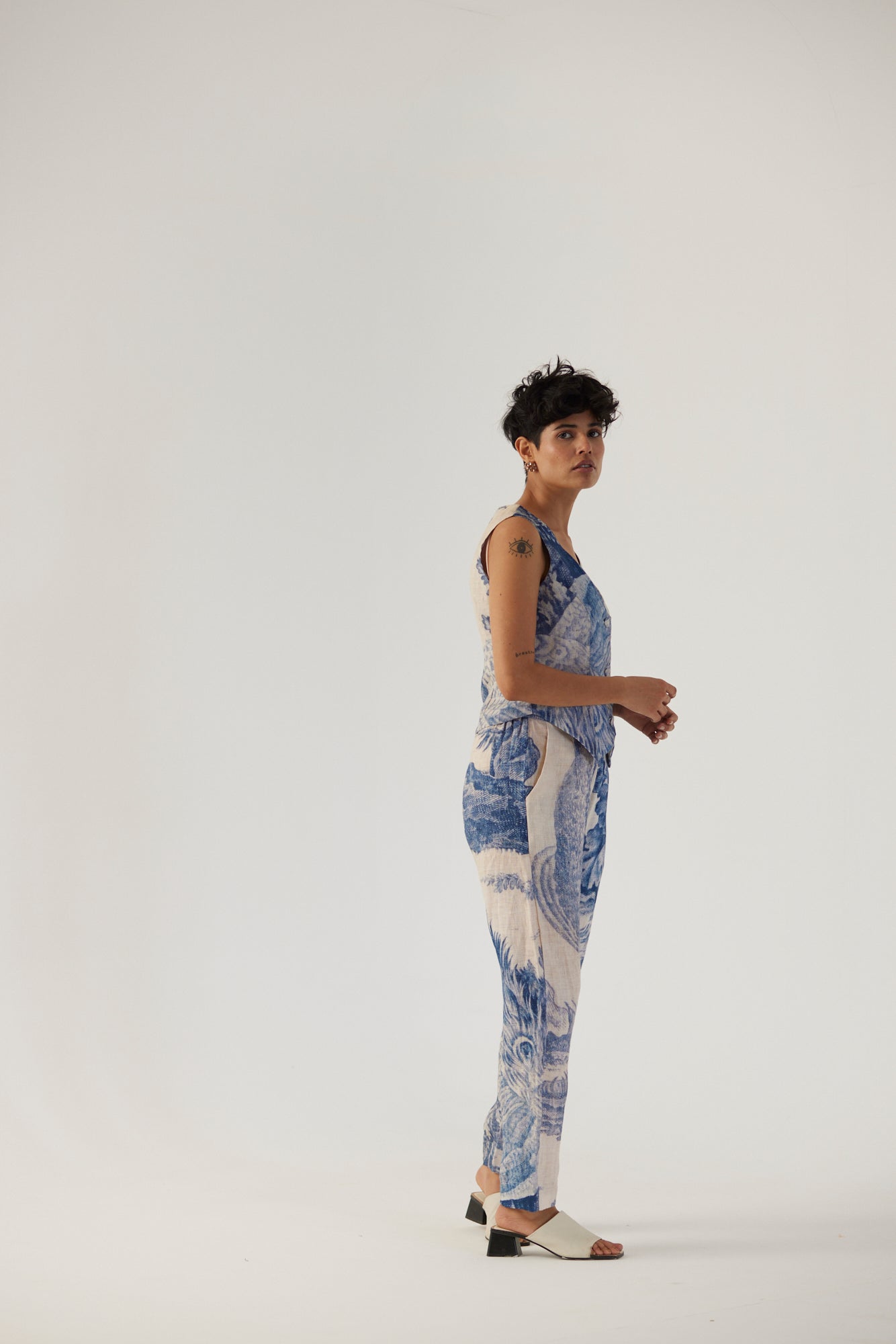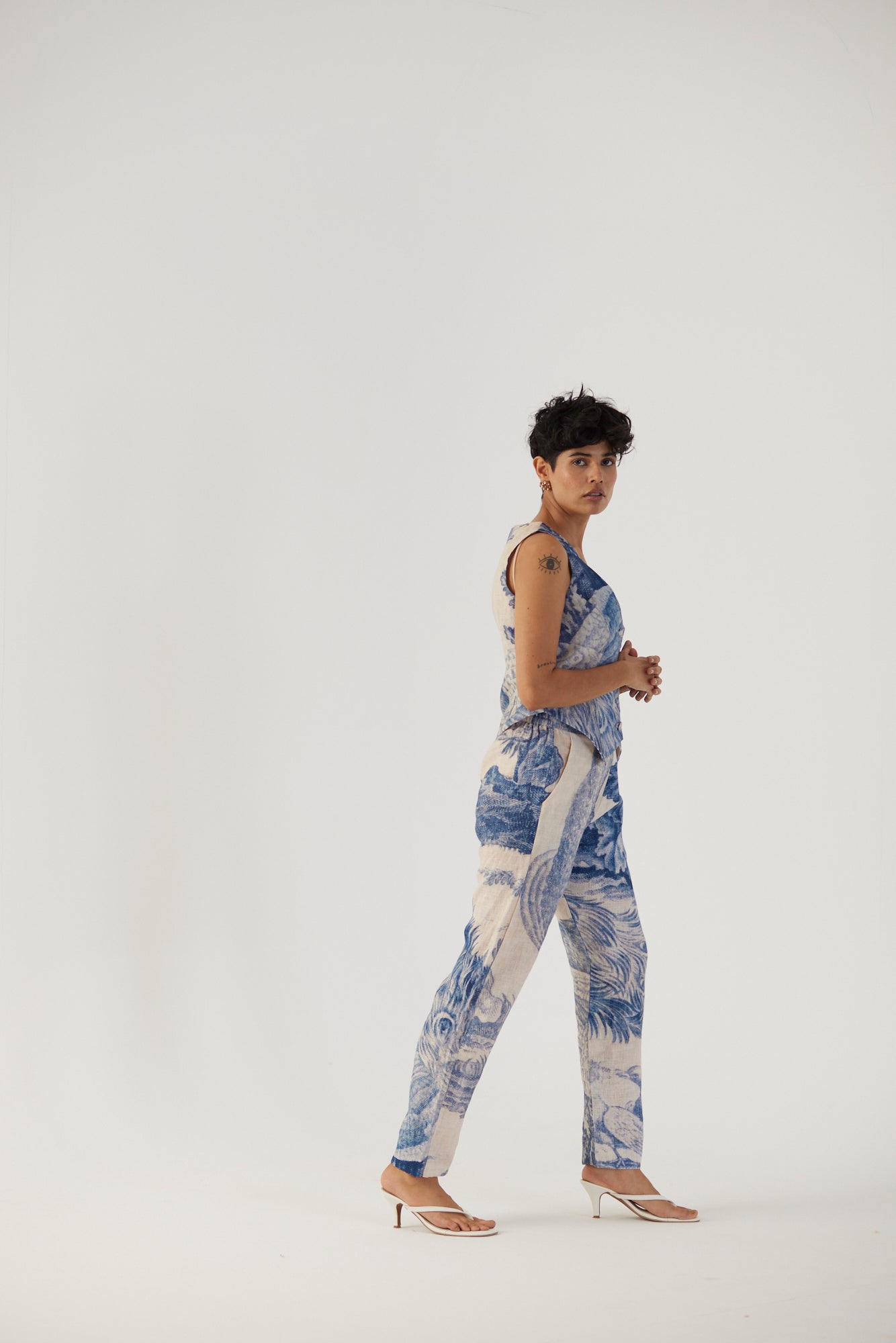This print features a MOR(peacock) with intricate details and bold lines in the indigo colour. The print is carefully printed on linens. The jacket is of short sleeveless waistcoat in a V- neckline.