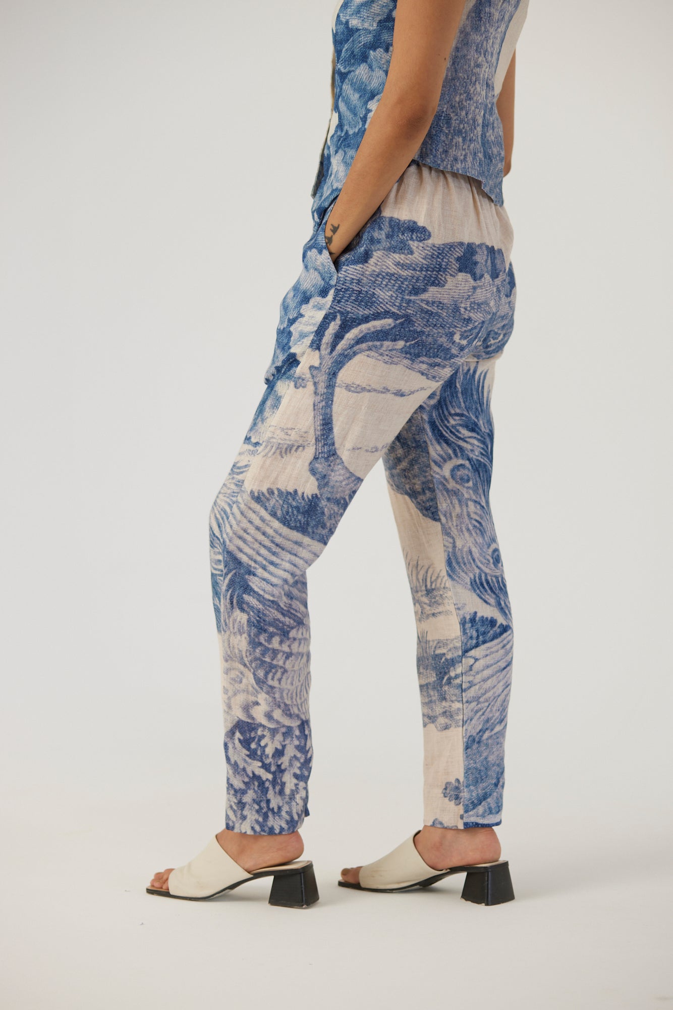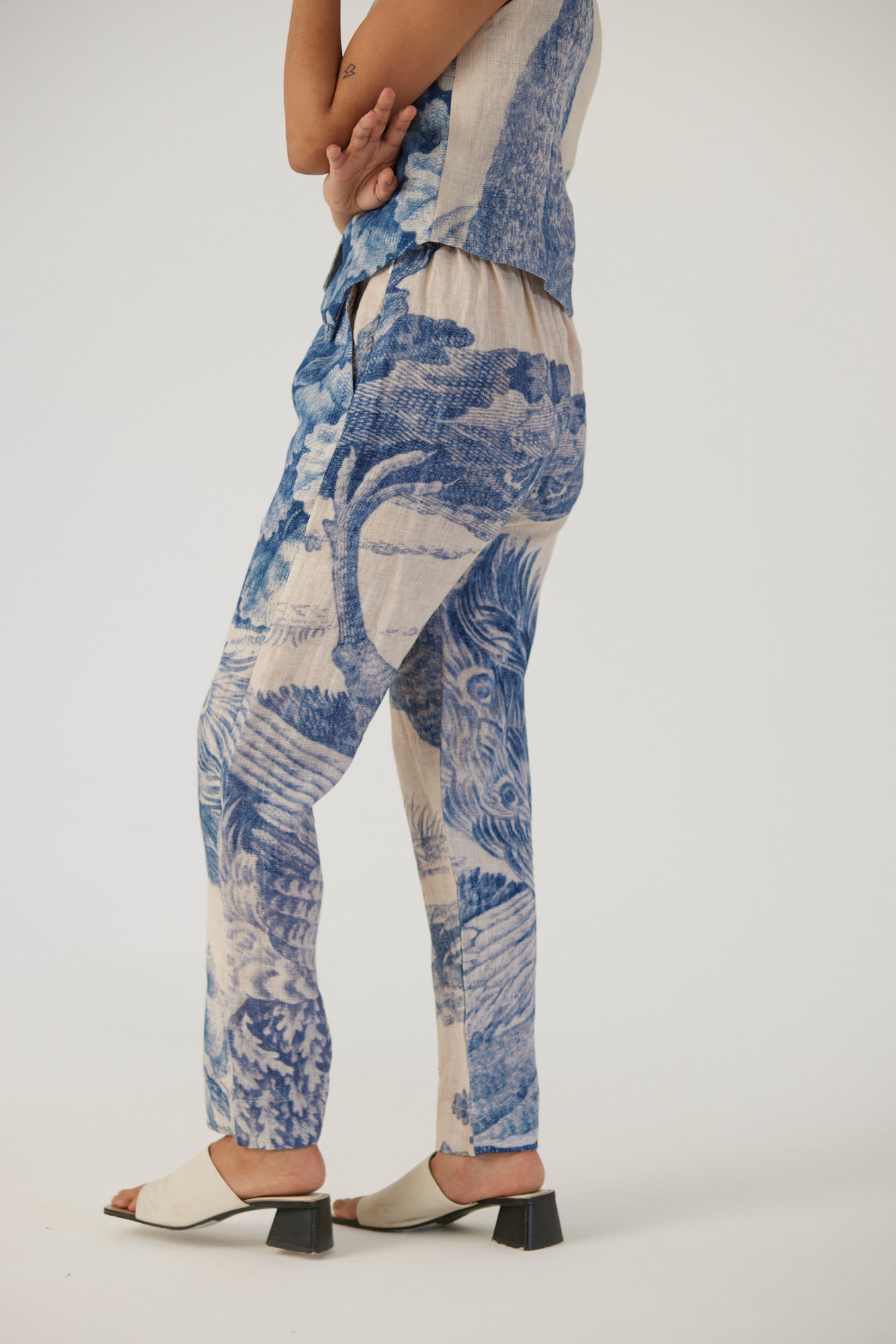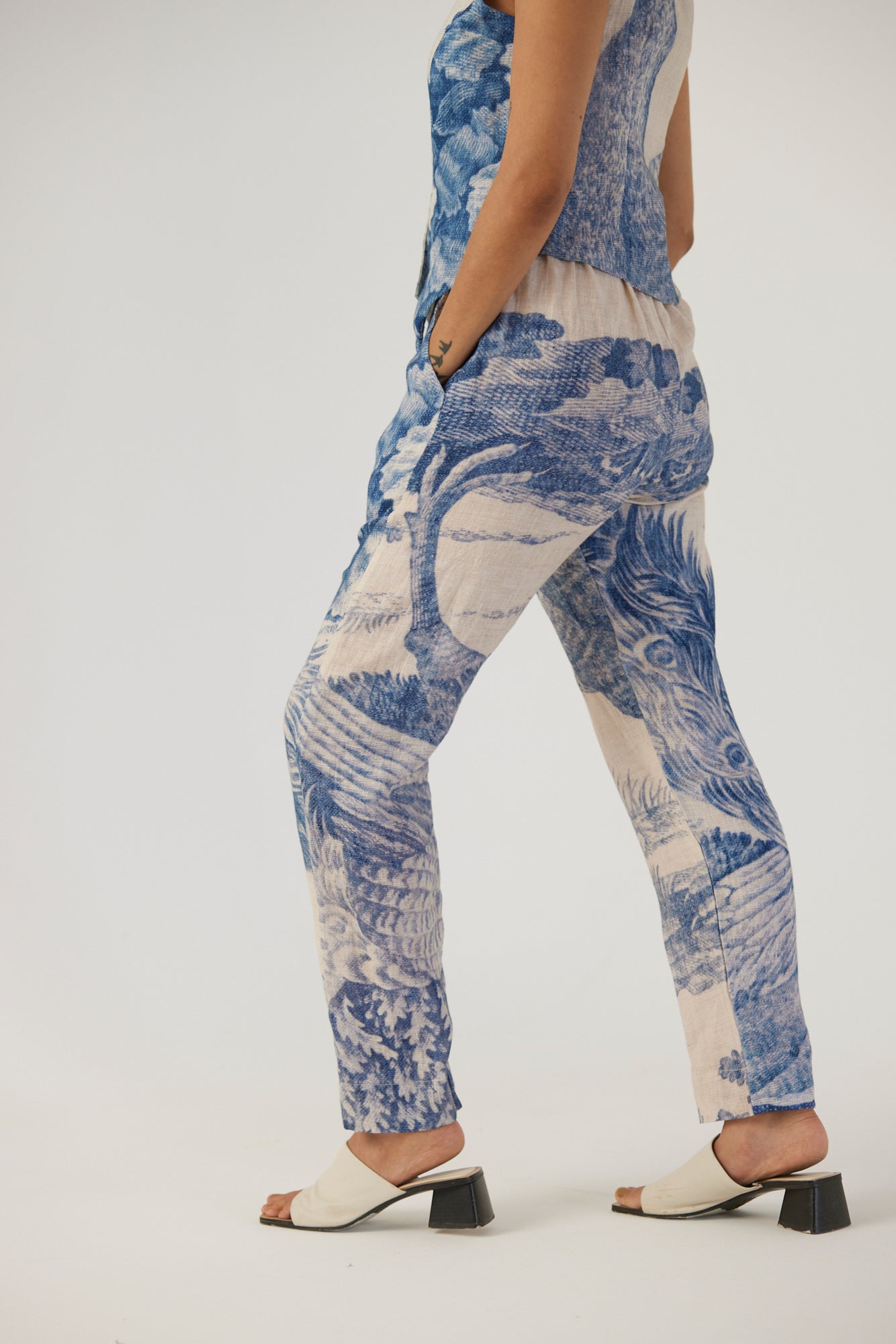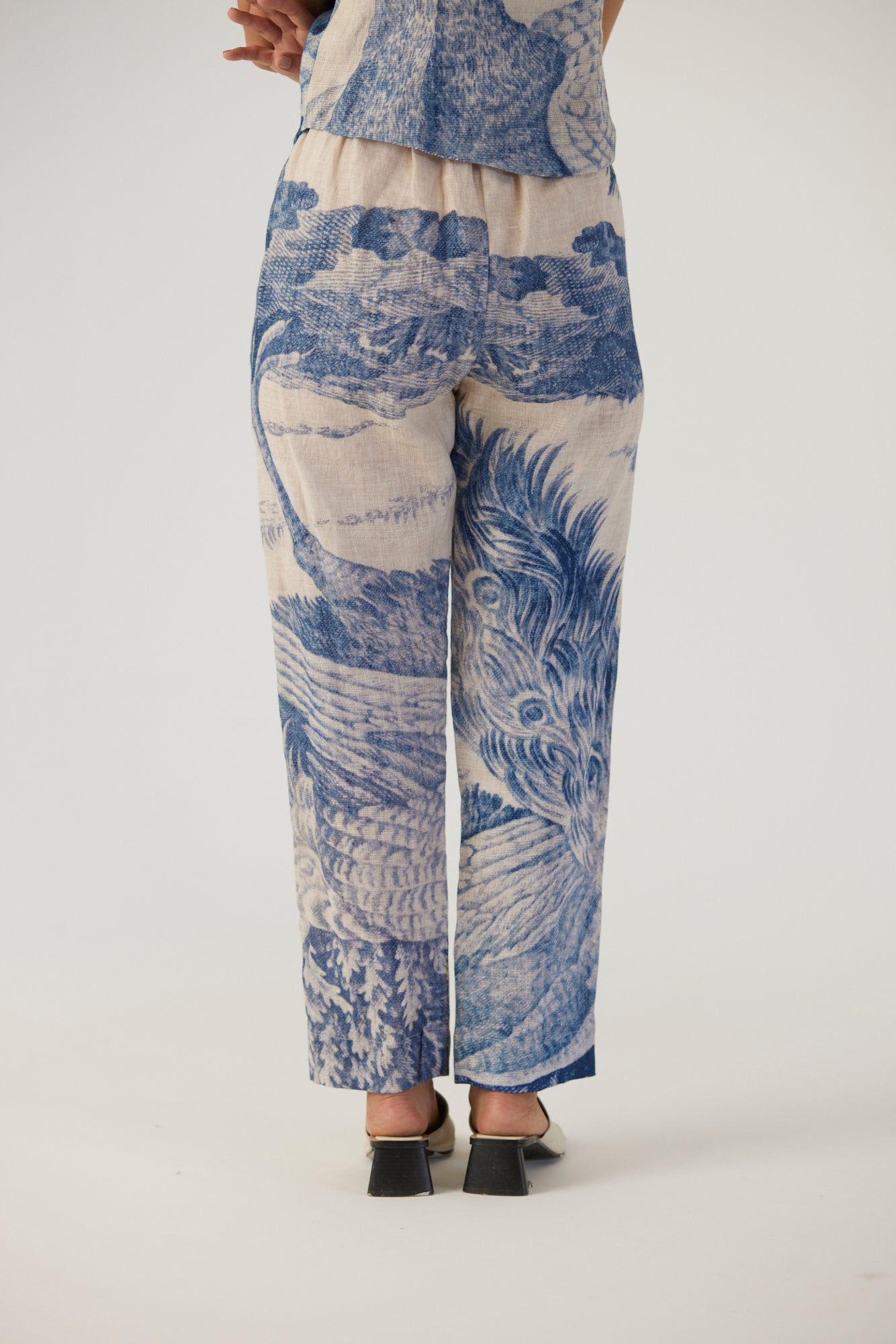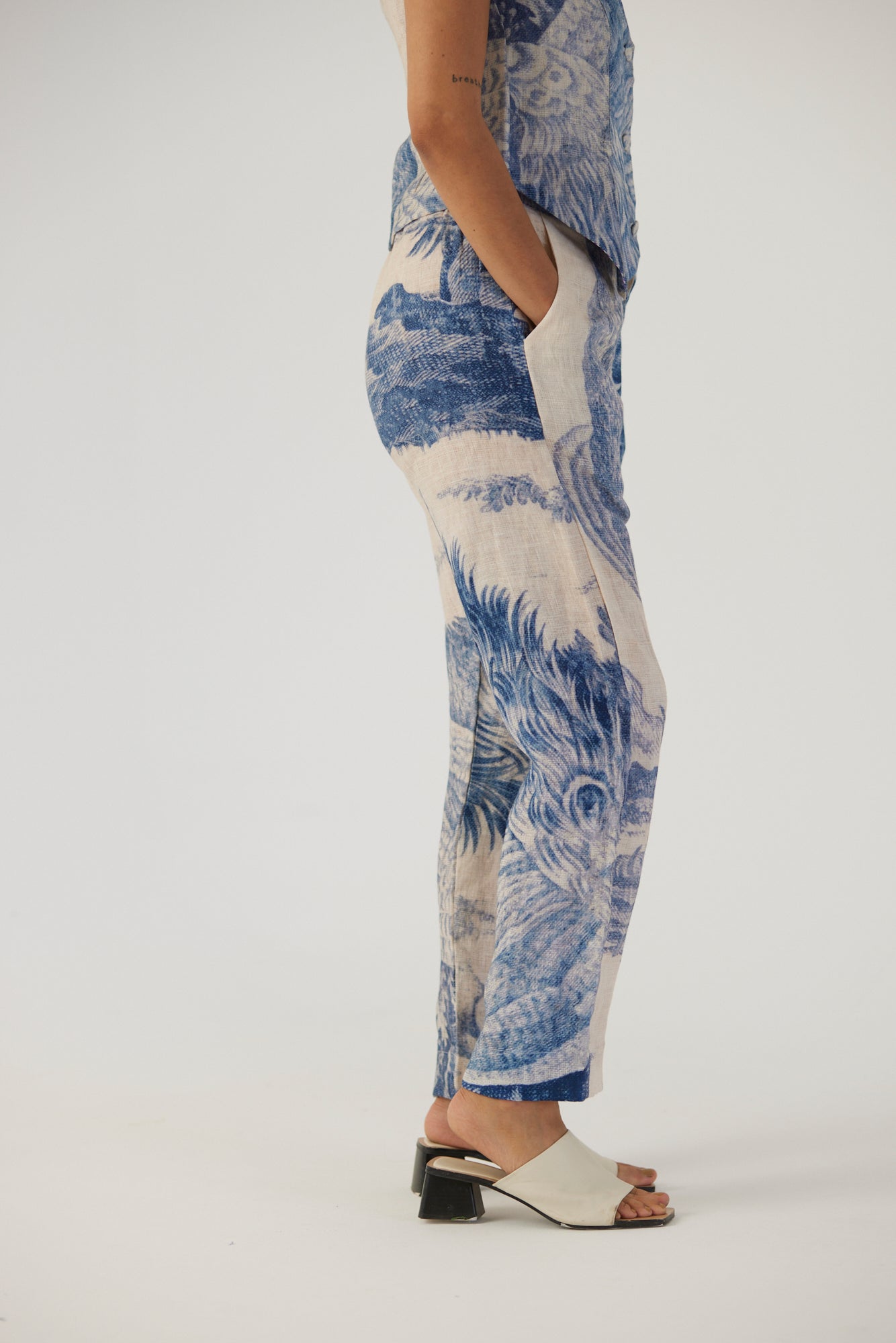 This print features a MOR(peacock) with intricate details and bold lines in the indigo colour. The print is carefully printed on linens. The jacket is of short sleeveless waistcoat in a V- neckline.