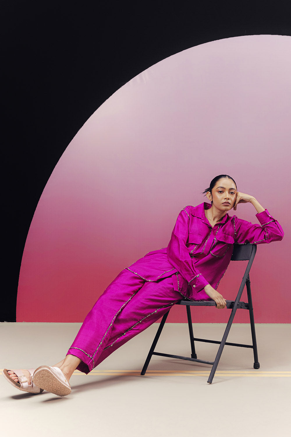 Handwoven silk co-ord set with embroidered bead work along the seams and flap pocket details on the shirt.