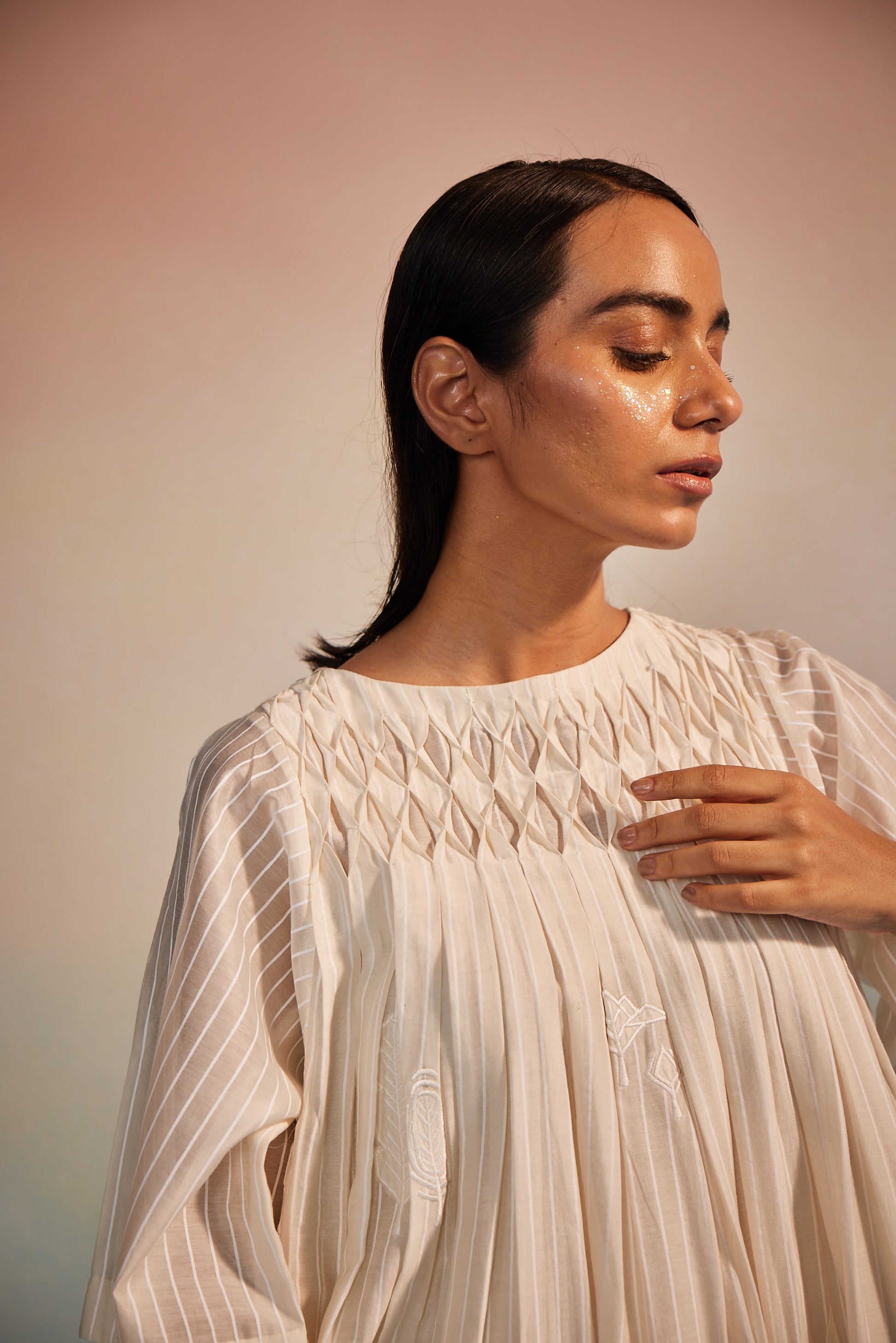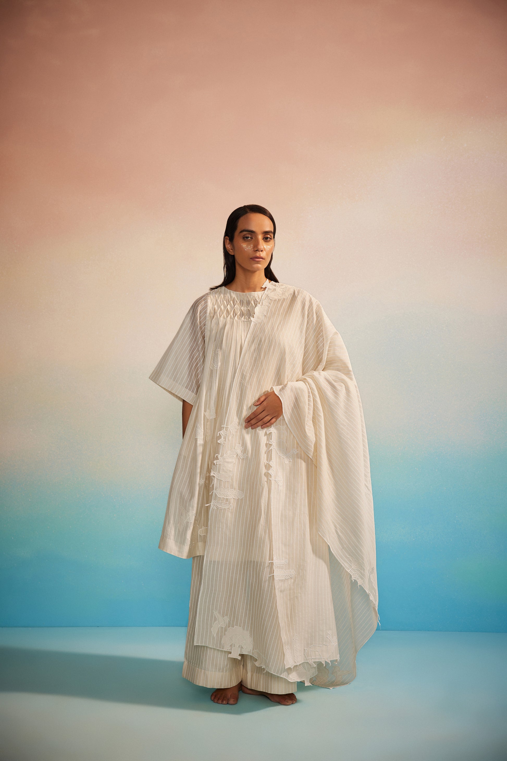 An elegant blend of texture and ease, the Musubi Kurta Set features a hand screenprinted silk Chanderi kurta with delicate smocking and appliqué detailing. It’s paired with the Hama Akari Stripe Pants —fluid, and thoughtfully finished with detailed drawstring ends — and the Kofu Dupatta, a lightweight striped Chanderi layer with subtle appliqué that adds a refined touch. A set that moves with grace and quiet charm.