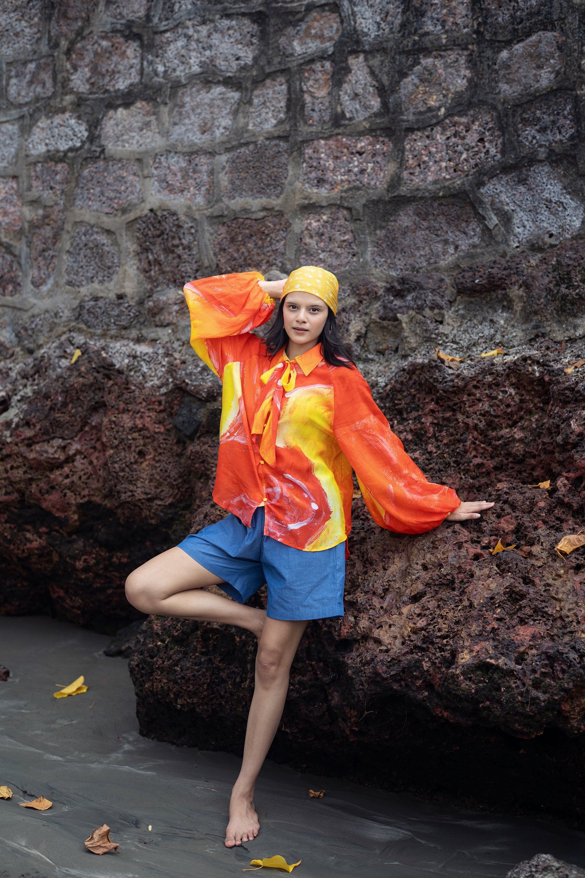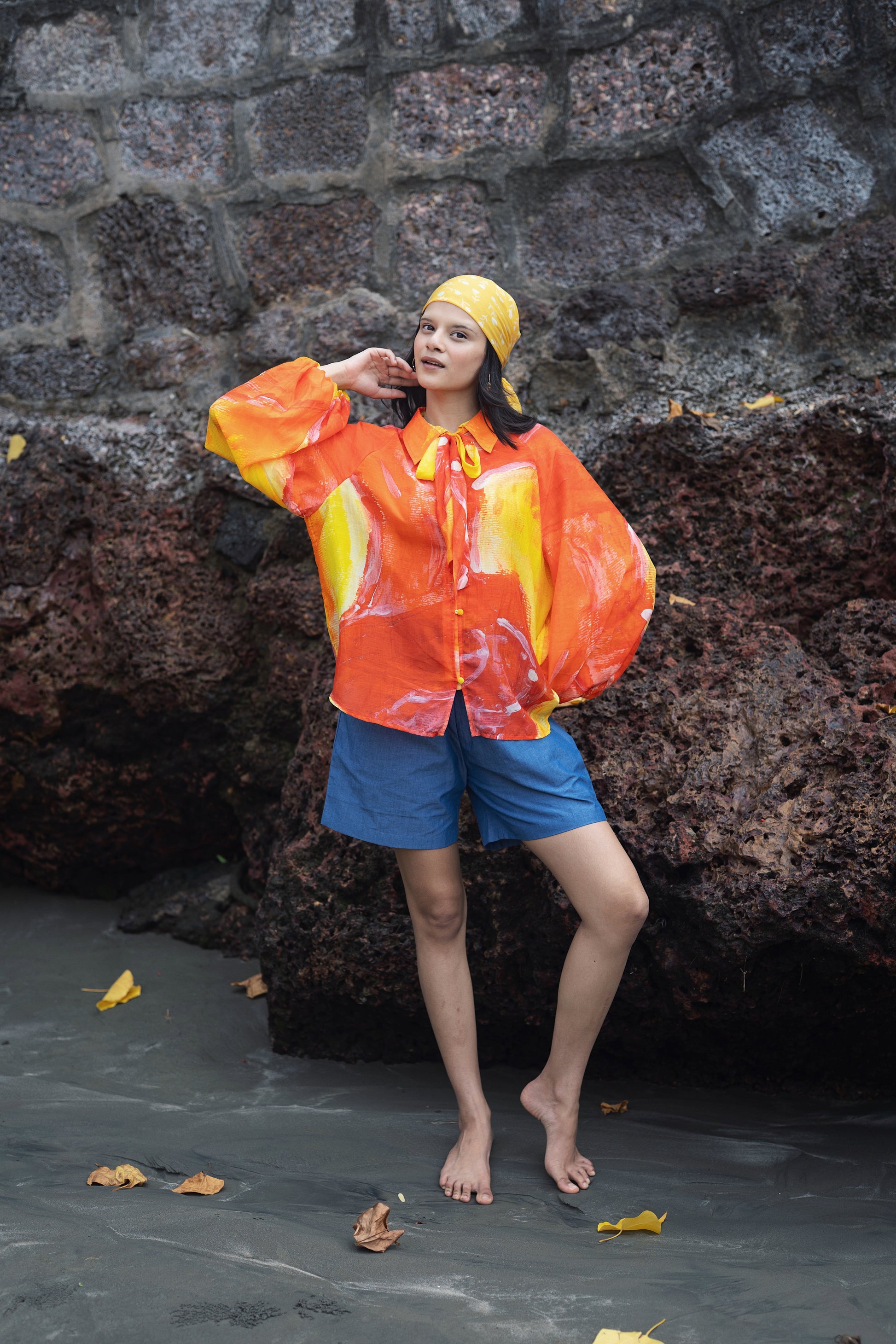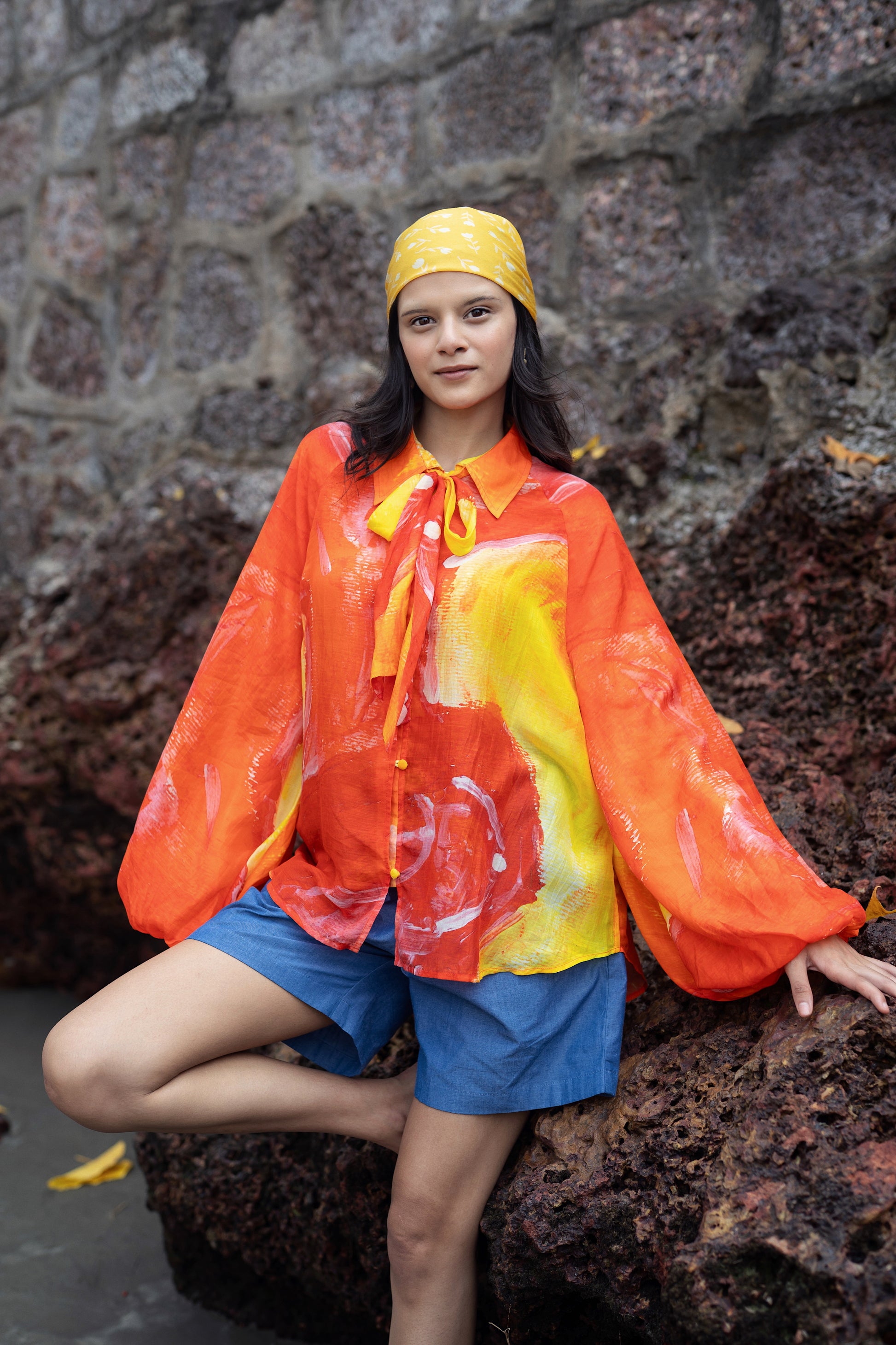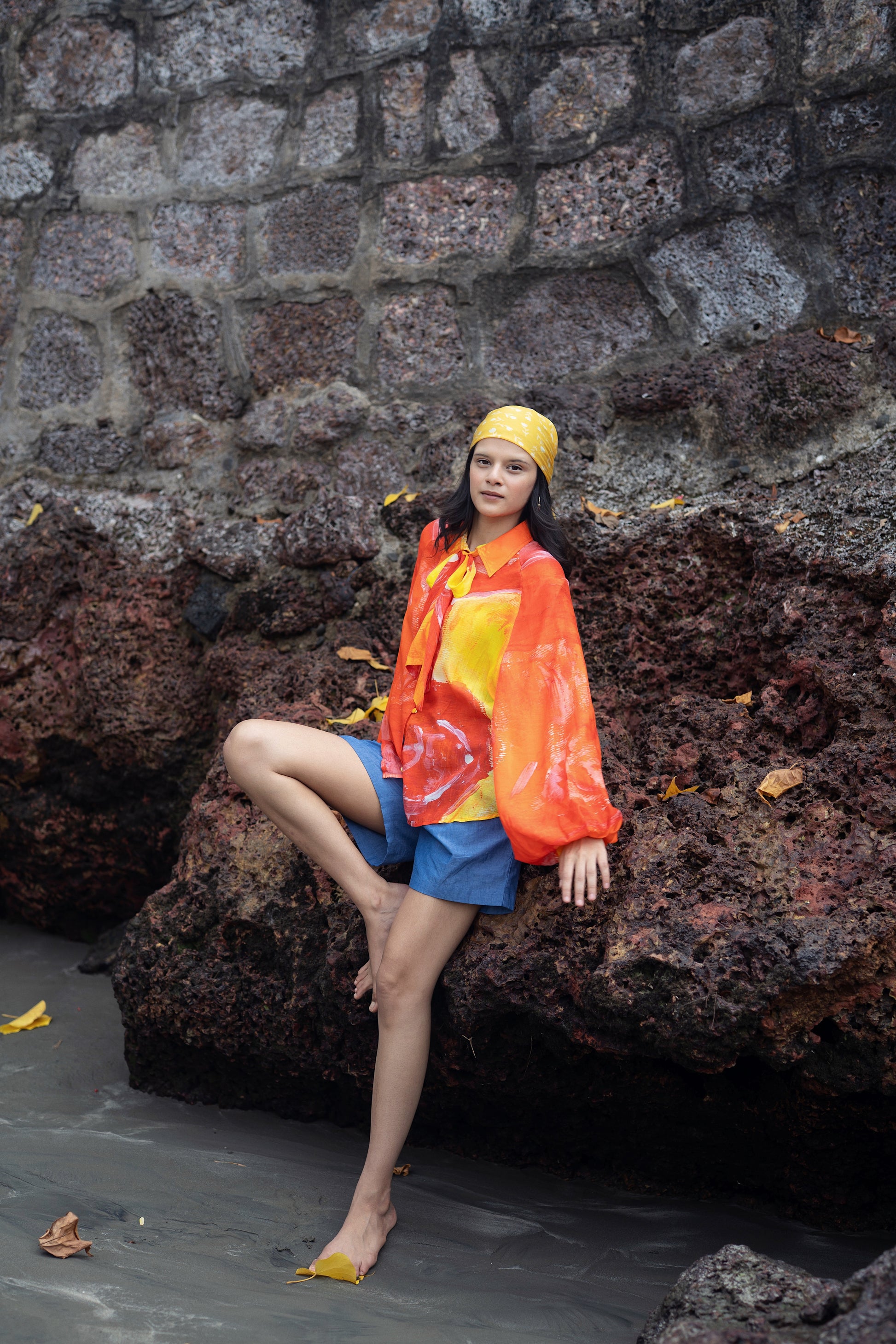 Naked Ninja is a relaxed fit shirt with raglan exaggerated sleeve. It is made from our cotton silk fabrication. This shirt is developed from an artwork of a very talent artist Kanika. She loves taking inspiration from women bodies and love painting them in multiple bomb of bright colours.