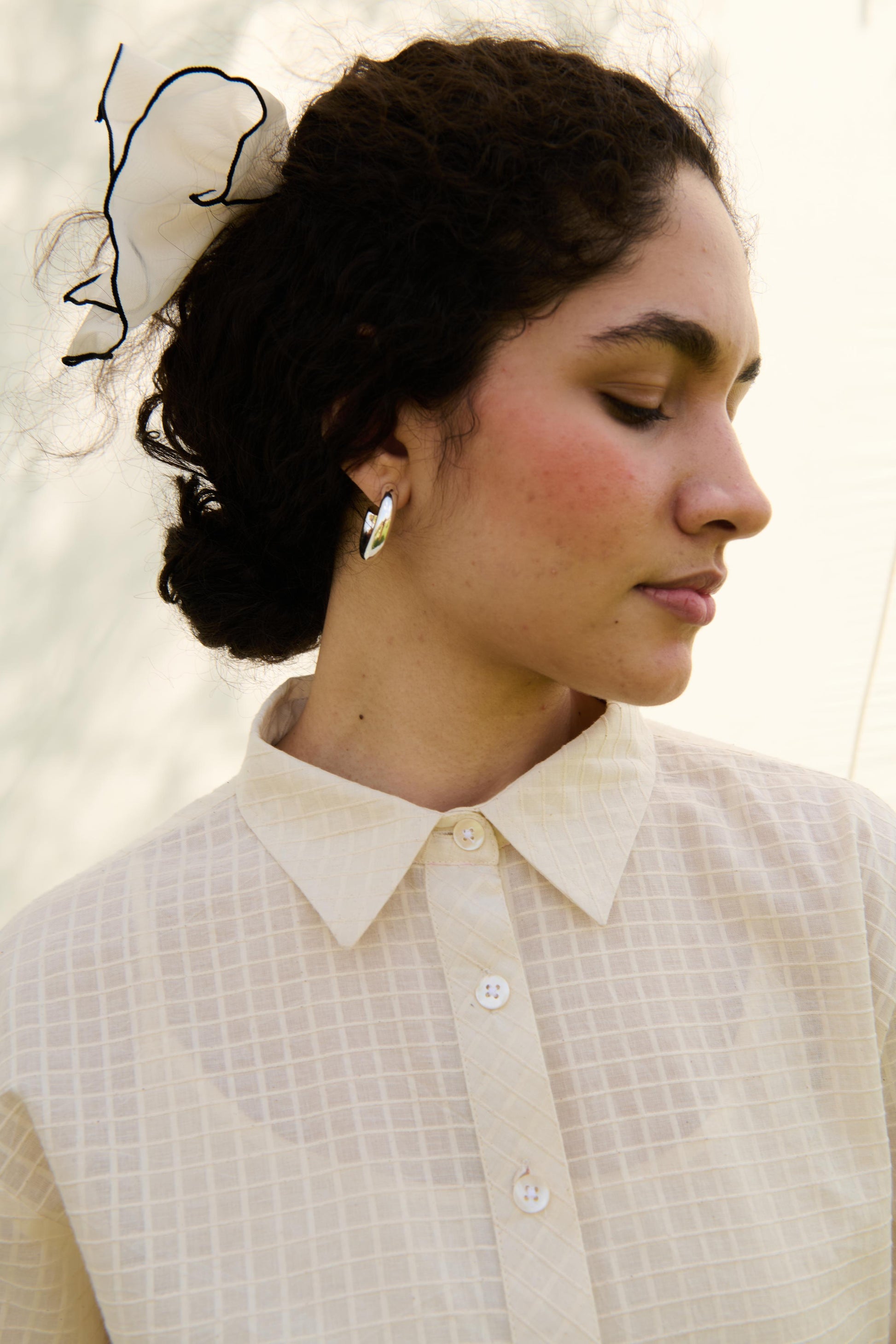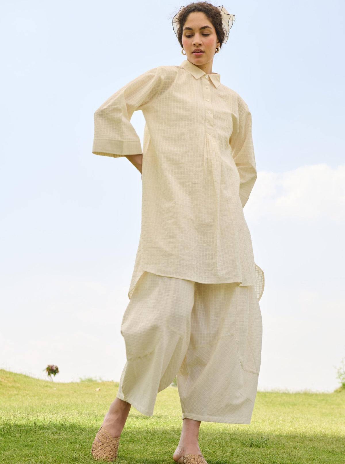 The Nargis coord set is crafted from our linen cotton high low tunic in our checkered cotton fabric with our balloon panelled pants.