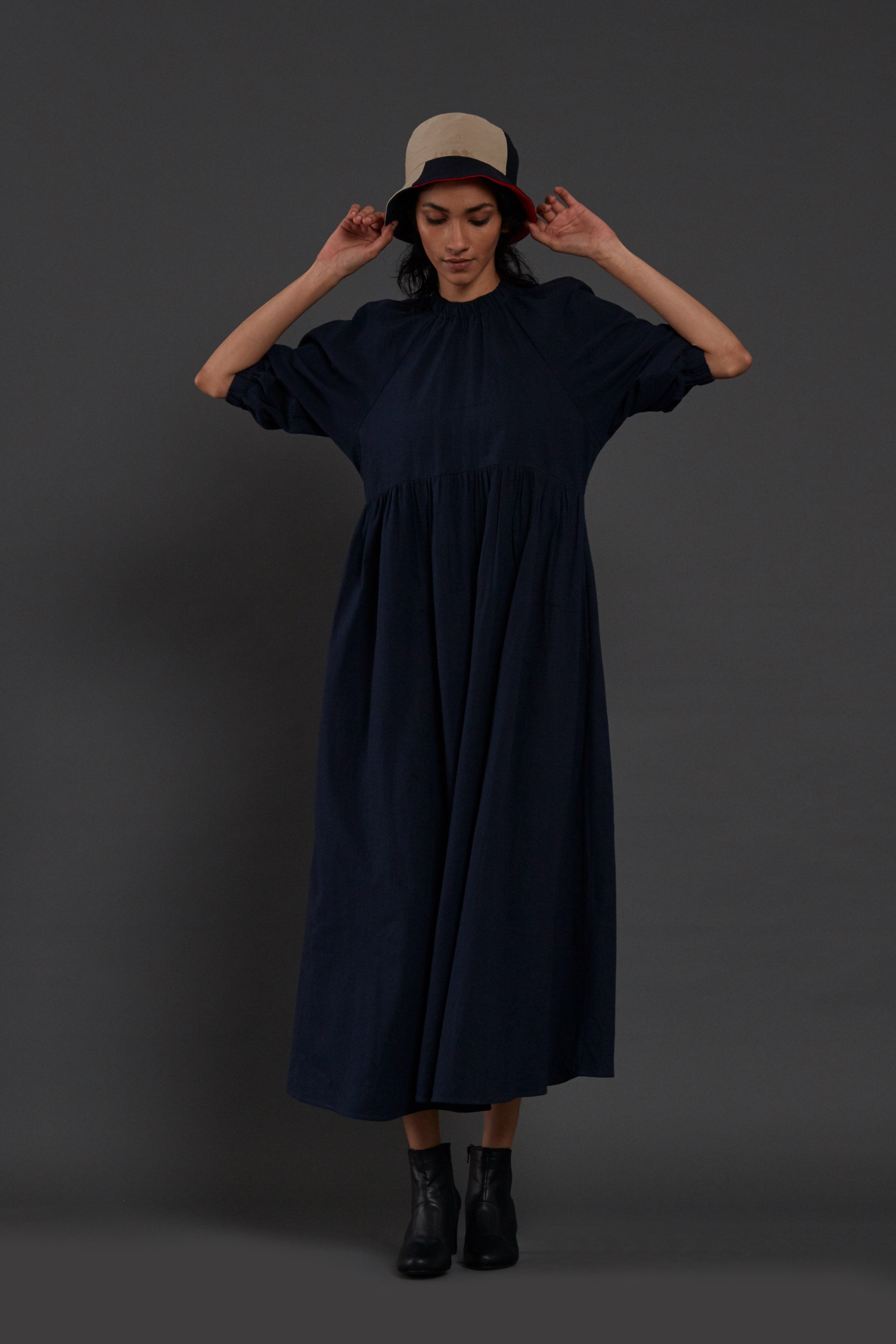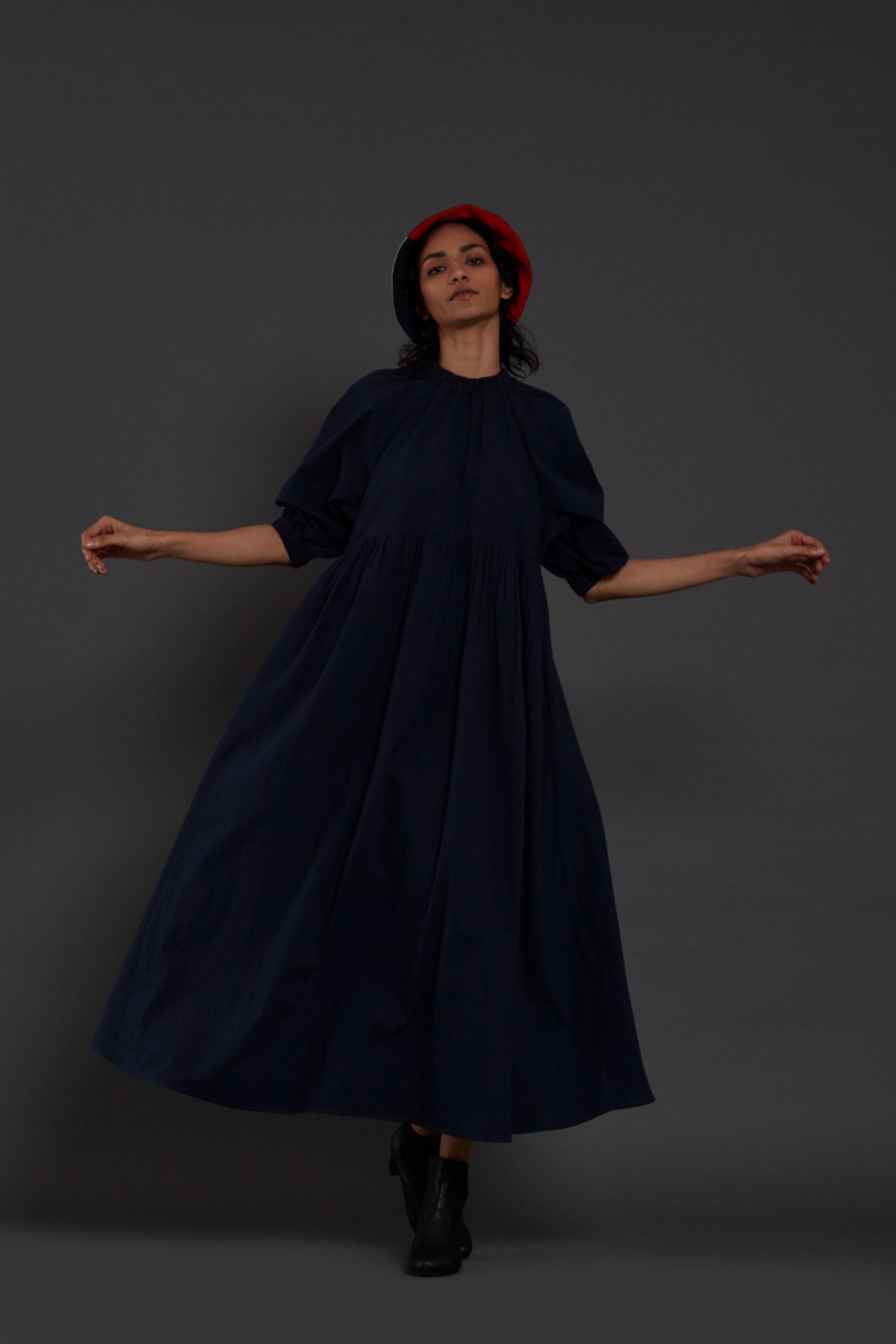 A raglan sleeve, ankle-length dress with elastic detailing on the neck and sleeves