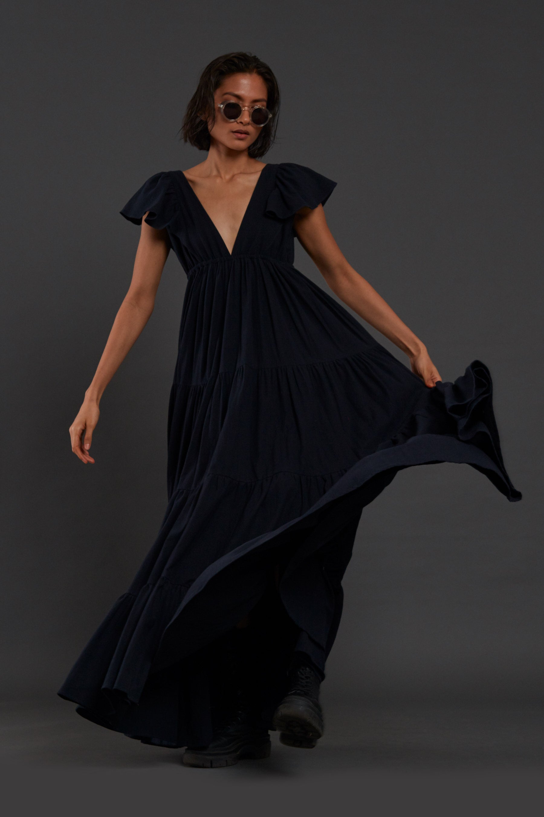 Plunged neck tiered gown with side pockets and ruffled sleeves