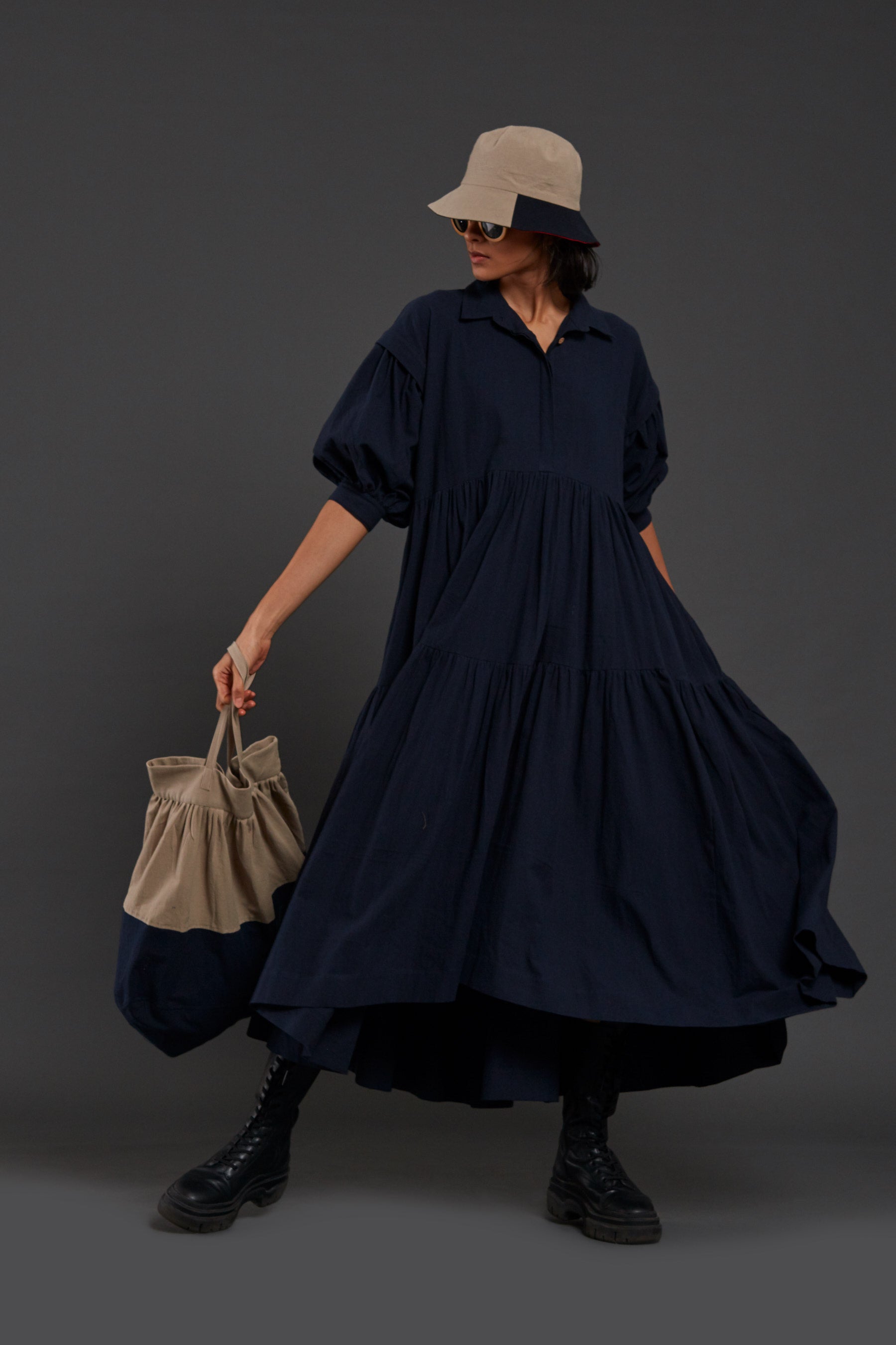 Ankle-length tiered shirt dress with extended balloon sleeves, front button opening and side pockets.