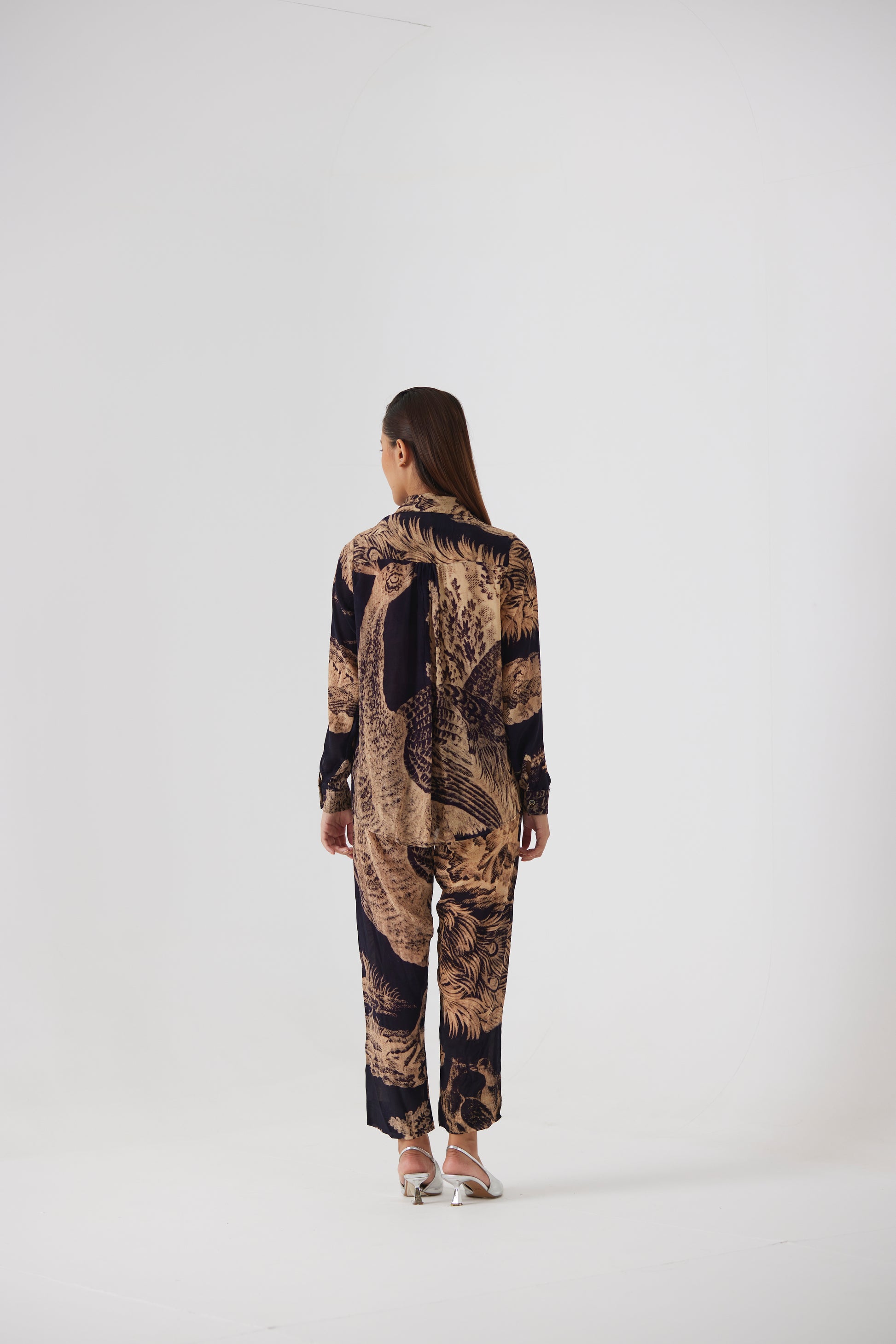 This print features a MOR(peacock) with intricate details and bold lines in the navy colour. This set is made of Morni prints carefully printed on crepe. The set includes a button down shirt with straight pants.