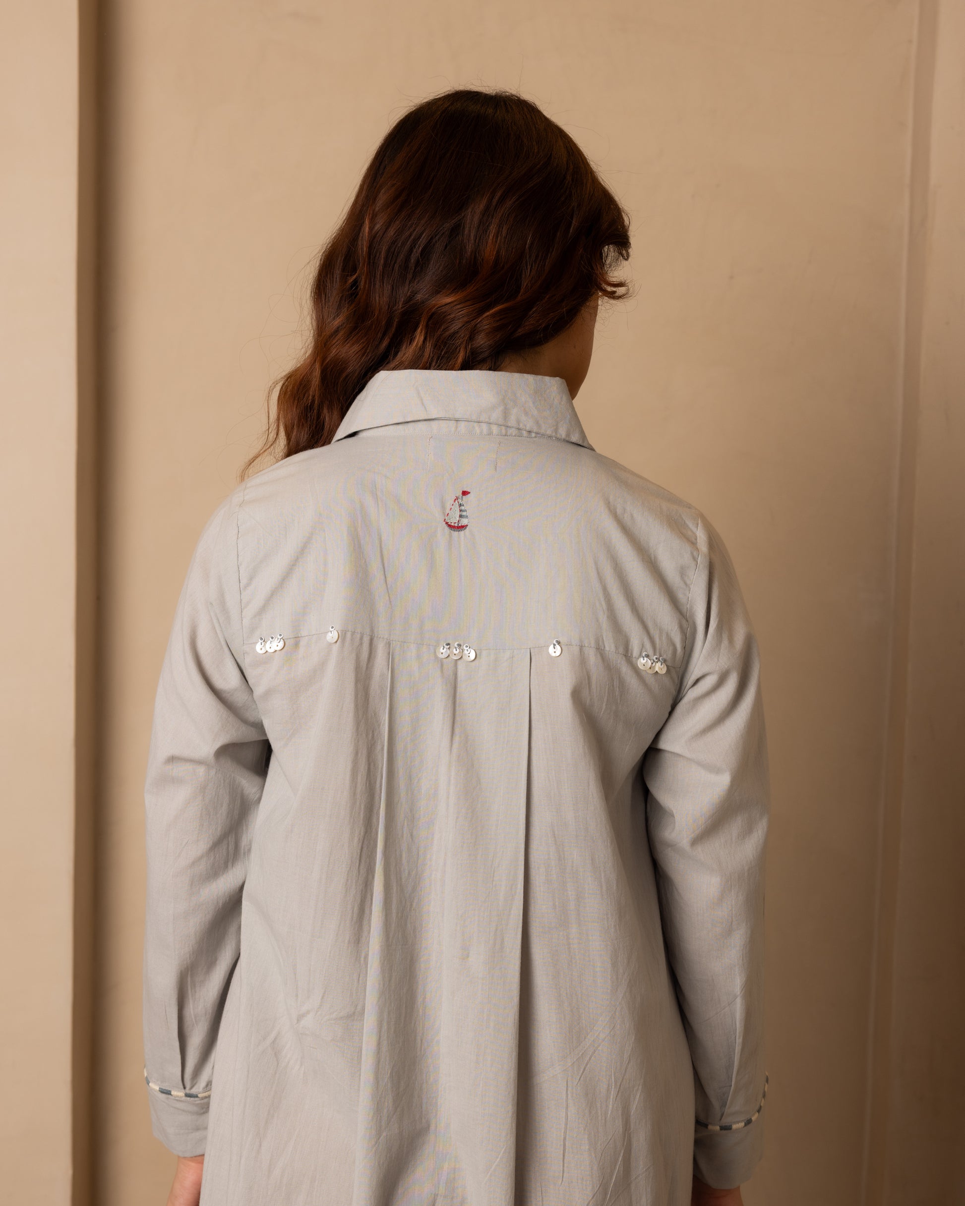 Intricate shoulder-to-sleeve lace detailing adds a touch of femininity and grace, while embroidered buttons along the neckline offer a polished finish. A standout feature of this dress is the tassel detailing on the back yoke line, adding whimsical charm and a unique focal point to the ensemble