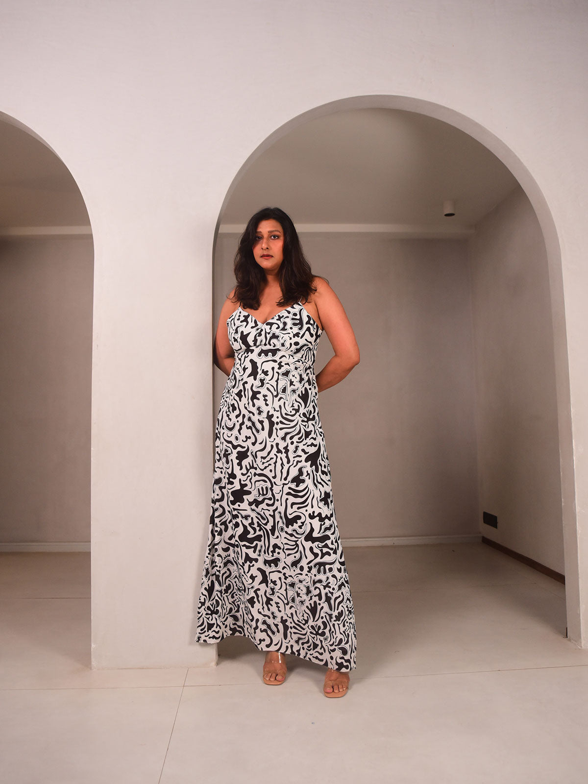 Blank easy style for the woman on the go. Cut in our exclusive black and white hand-screen printed modal cotton, with a strappy bodice and pockets in the dress offers style and ensures maximum comfort and flexibility.blank