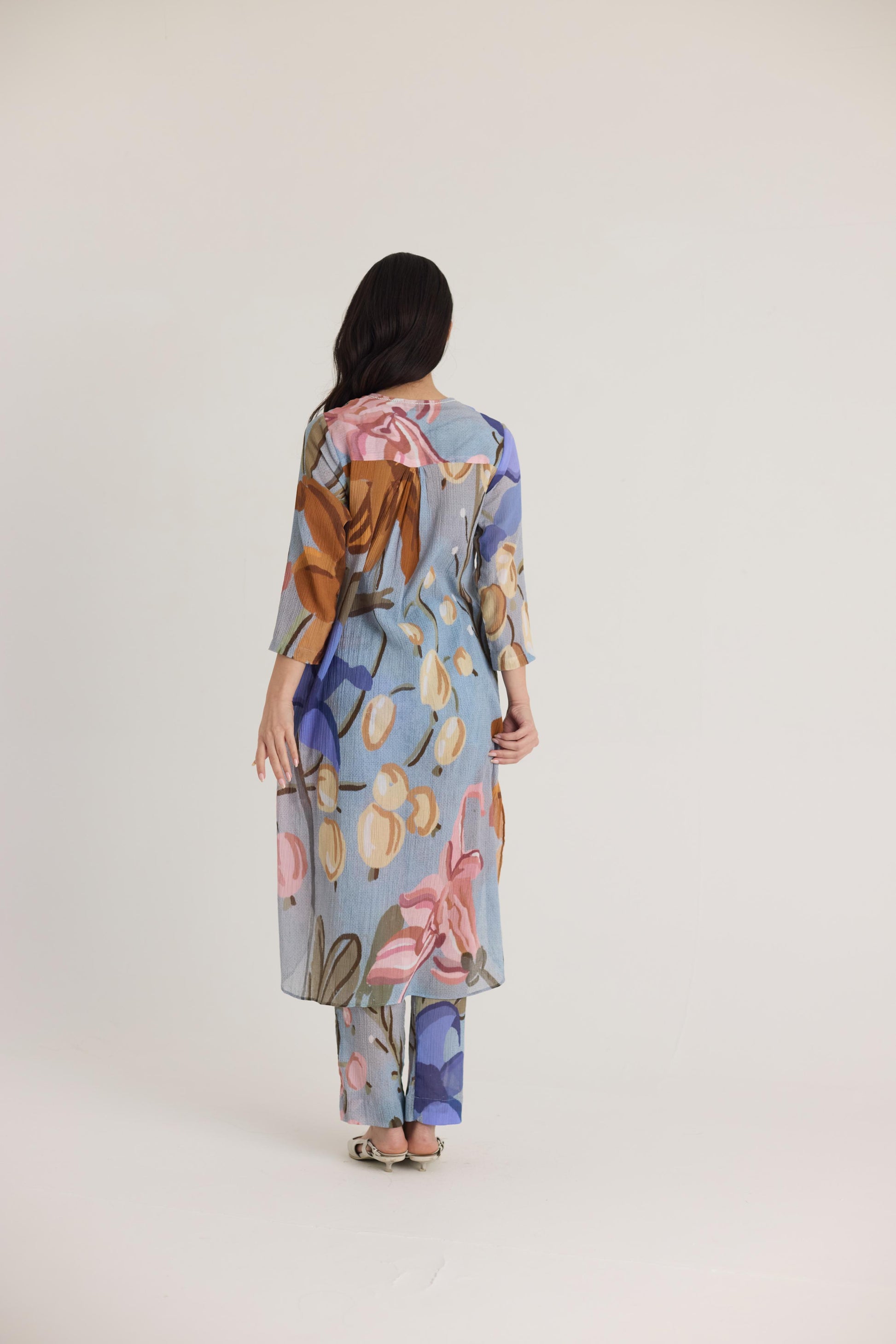 The fabric showcases an artistic botanical print with abstract floral and foliage motifs in vibrant hues of blue, pink, mustard, and green. The hand-painted effect gives the outfit a painterly charm, evoking a sense of natural elegance with a modern twist.