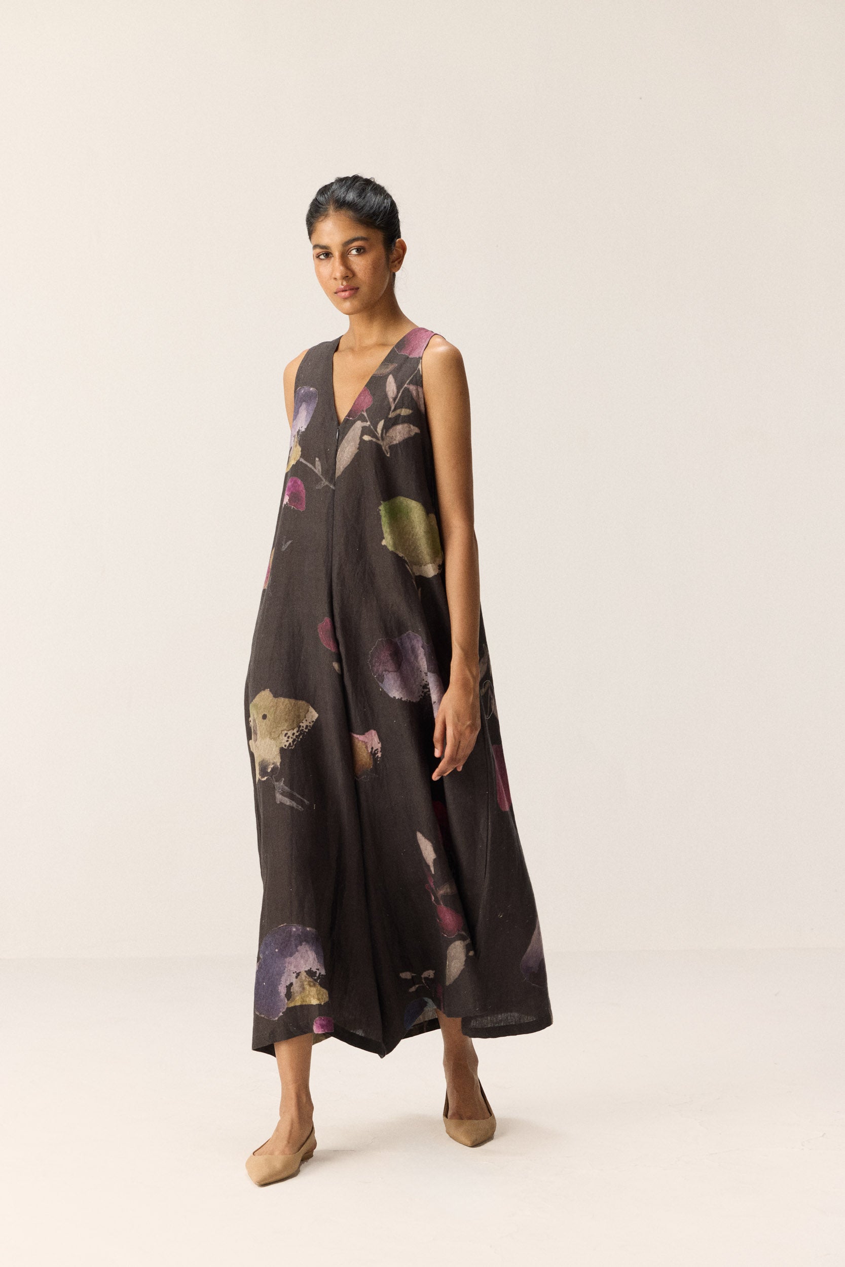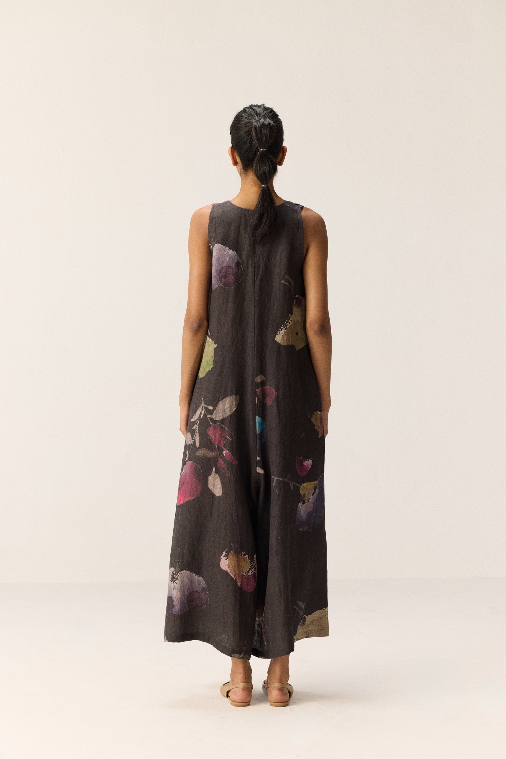 A charcoal-colored jumpsuit crafted in pure Belgian linen, featuring an all-over floral print for subtle elegance. It offers a comfortable fit with a front zipper and practical side pockets, blending style and functionality for everyday wear.