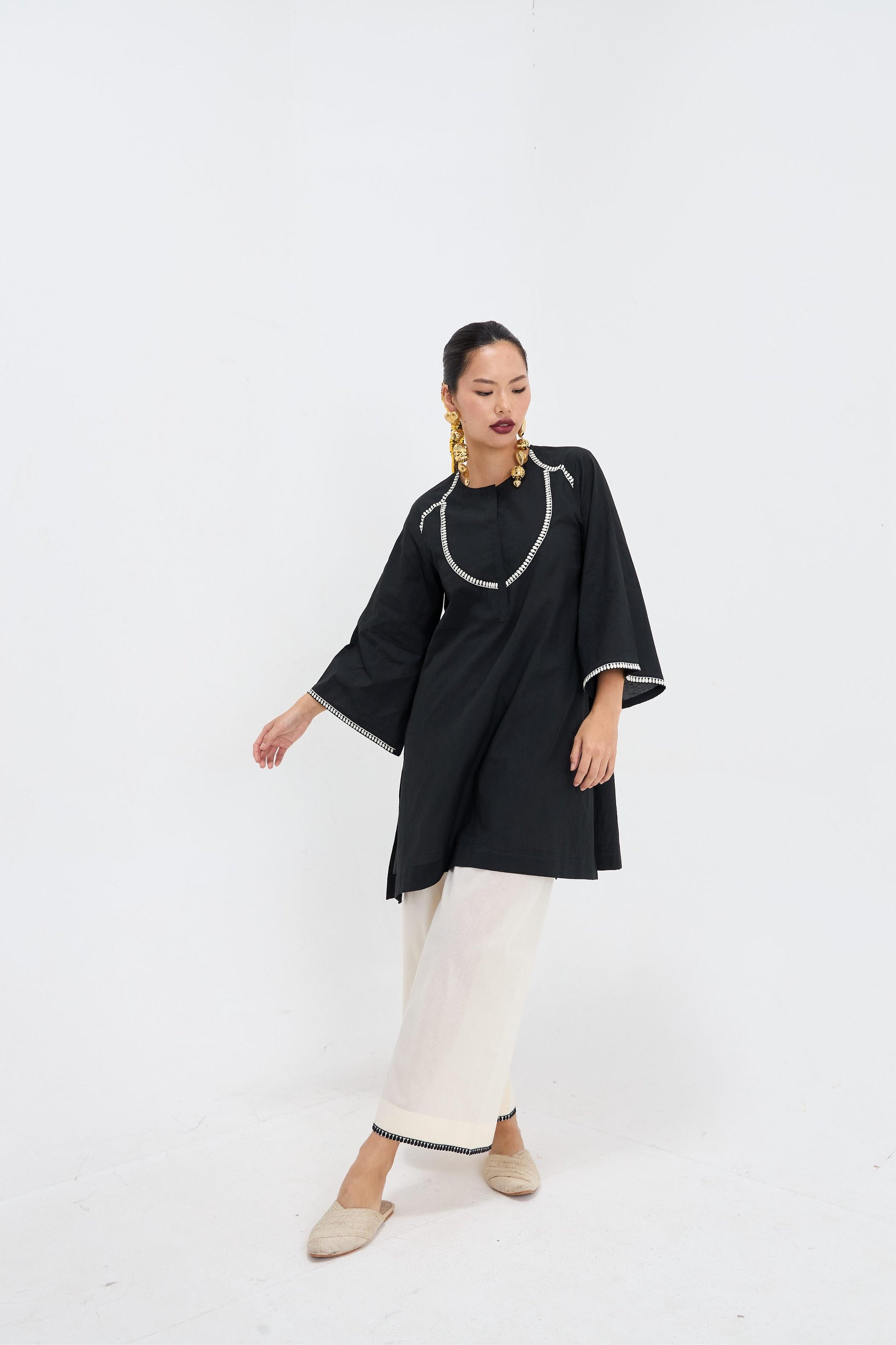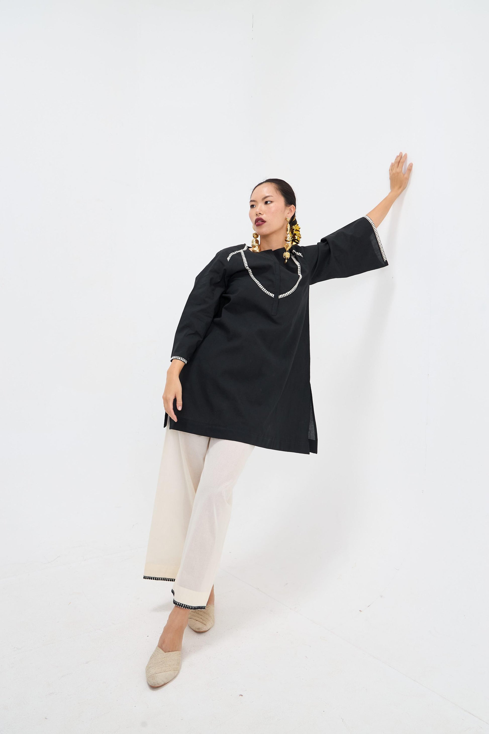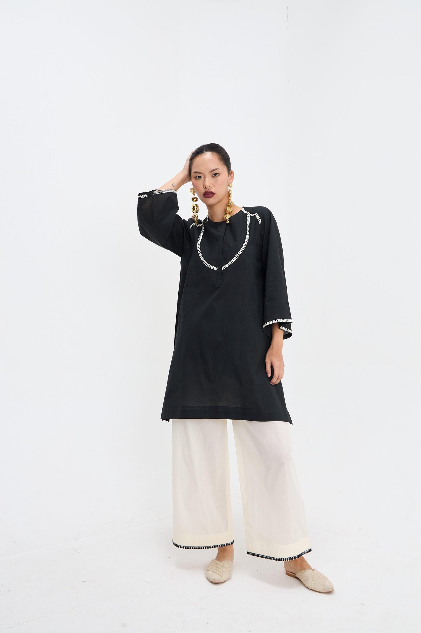 Channel timeless elegance with this retro-inspired cotton cambric set. Featuring a short black kurta with intricate hand embroidery reminiscent of vintage designs and paired with wide, relaxed off white pants, this ensemble combines nostalgic charm with modern comfort. Perfect for a statement look with effortless style.