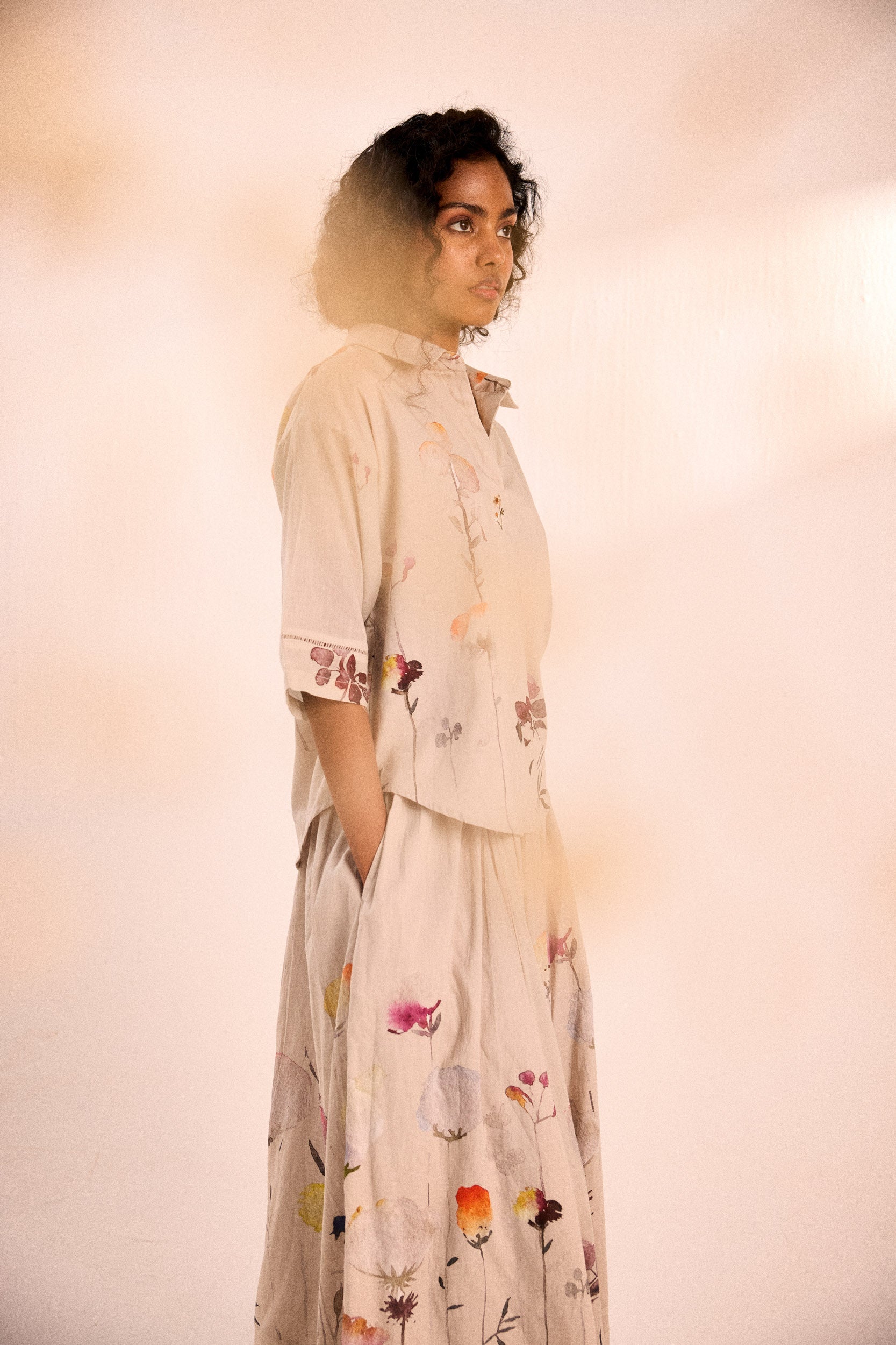 A relaxed skirt in a soft oat meal hue, featuring delicate floral prints. The gathered midi skirt has functional pockets adds fluidity and ease.