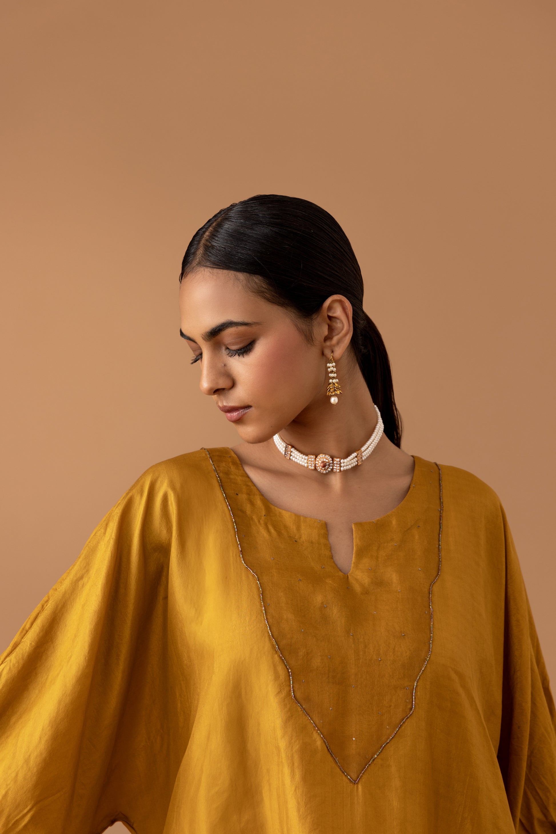 Featuring pure silk relaxed fit kaftan with embellishment of hand embroidery on neck along with organza detailing on yoke of the kurta with gather sleeve with cuff paired with chanderi silk pants
