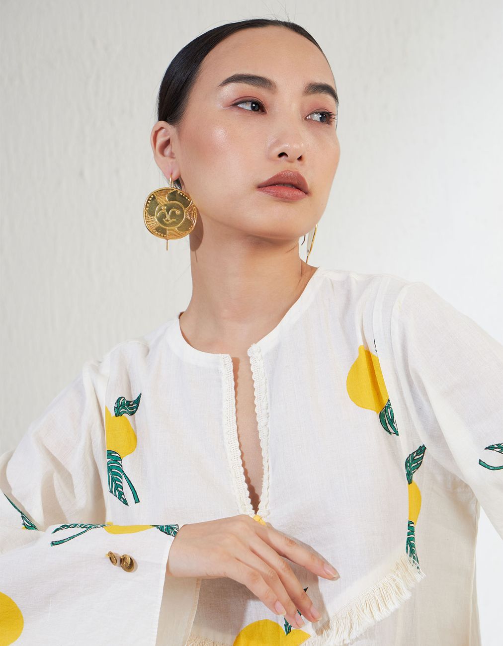 • Fabric-Cotton Cambric, Metal Coin, Pompom