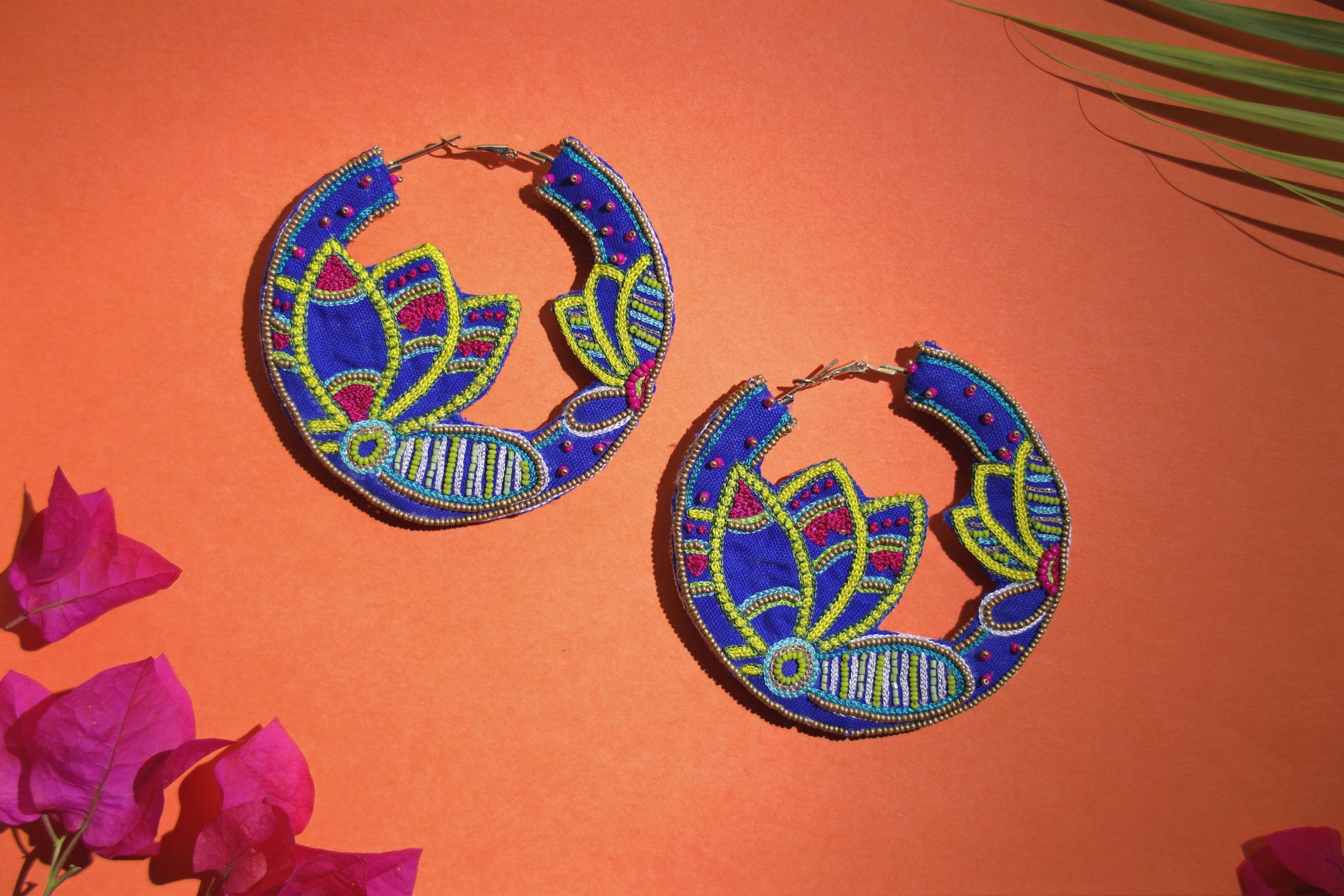 Handmade and hand embroidered hoop earrings with madhubani inspired lotus design. Intricately embroidered with silk threads and beads. Earrings are embroidered on both sides. Light weight and easy to carry.