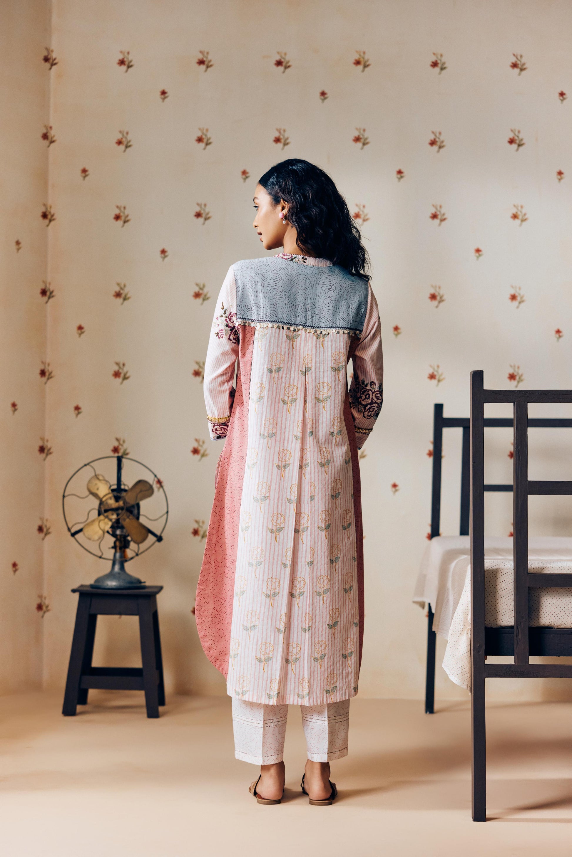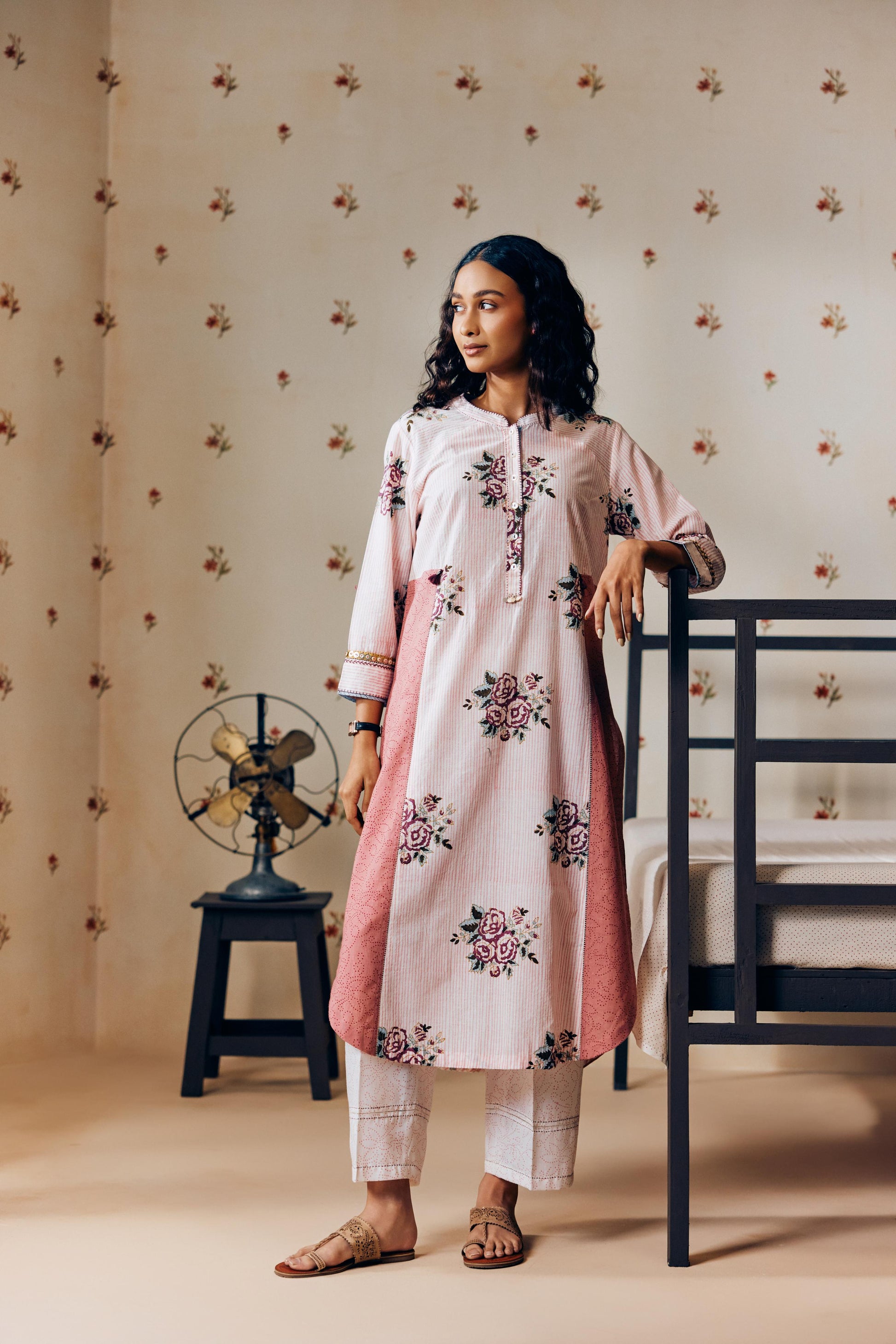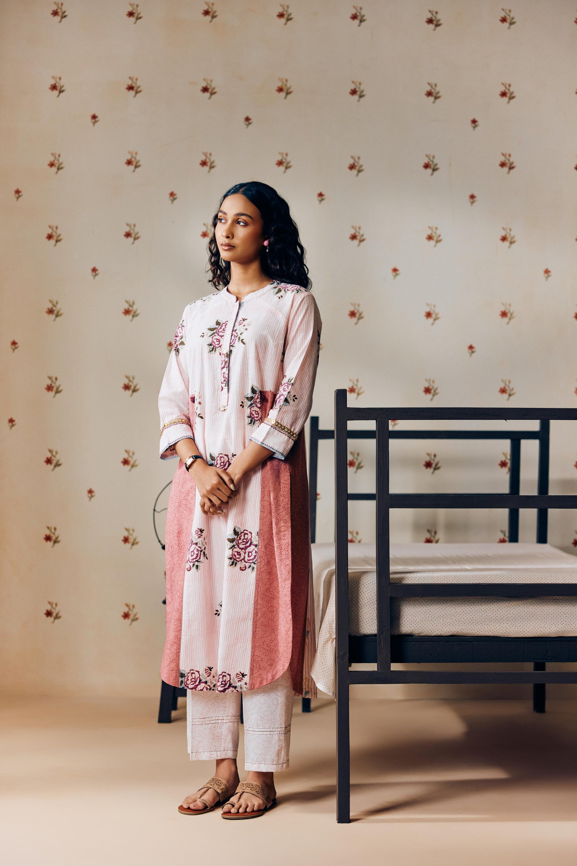 Tunic: Off-white with Pink Rose Hand Block Print, Mandarin Collar & Front Placket