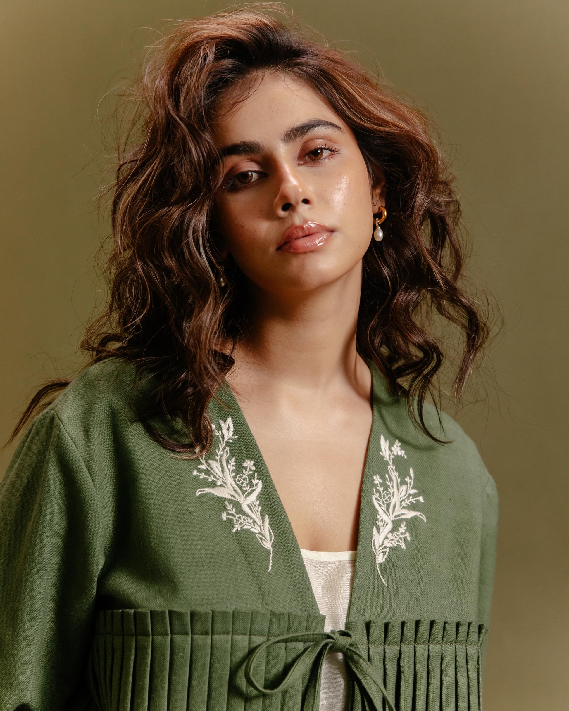 Pure khadi printed and embroidered jacket with pleats at front and tie up detail