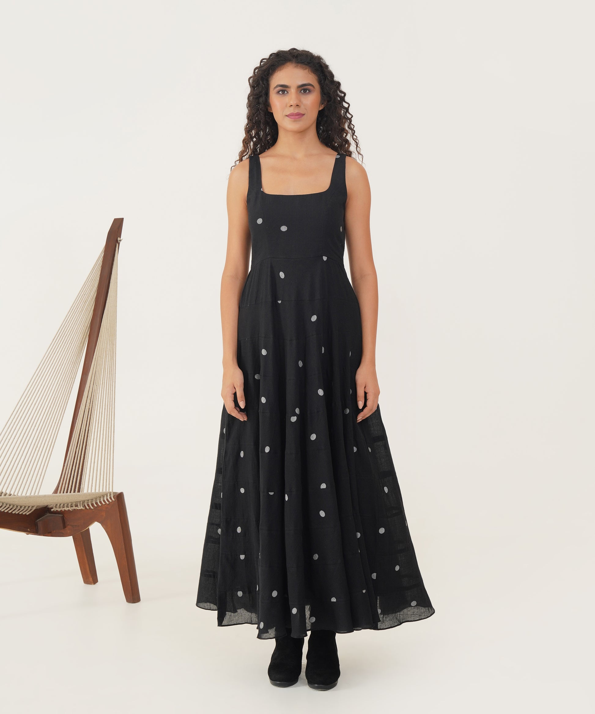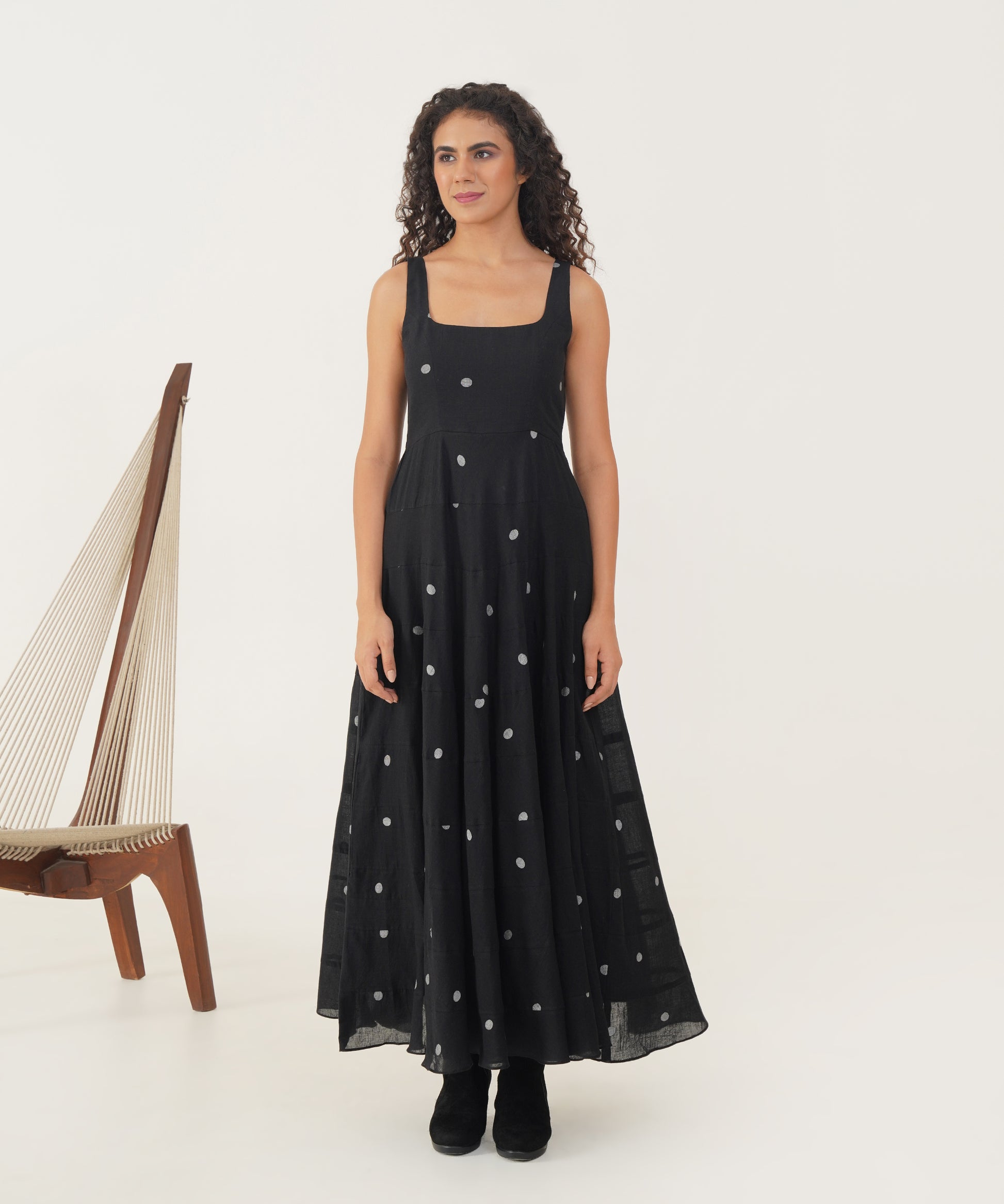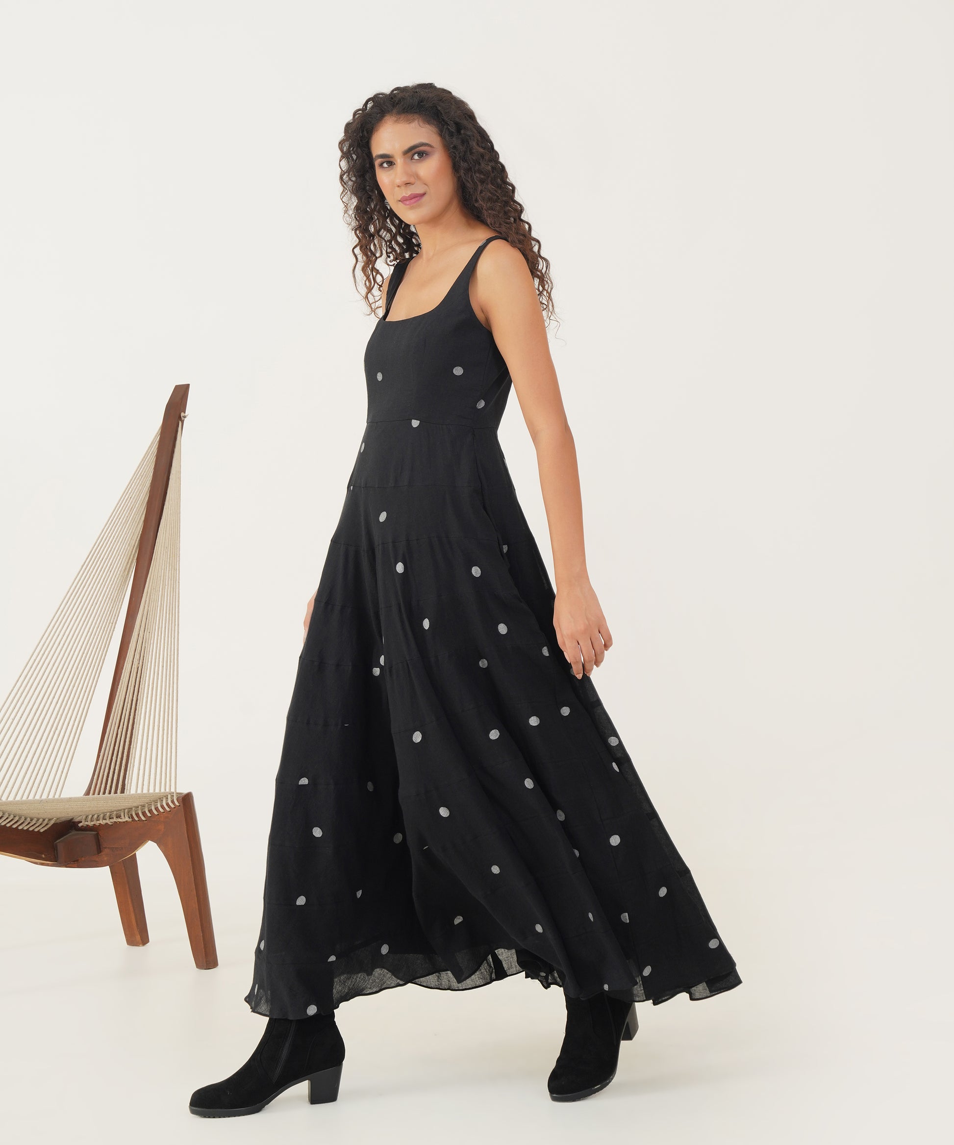 Elevate your wardrobe with our stunning Jamdani maxi dress, a true masterpiece of elegance and design. This dress features a striking deep square neckline and intricate circular panel detailing, which enhances both its visual appeal and ease of movement. The A-line silhouette creates a graceful, flowing shape, complemented by practical side pockets and a back zipper fastening for a perfect fit. Each detail is crafted to blend sophistication with comfort, making this dress a standout choice for any special occasion.