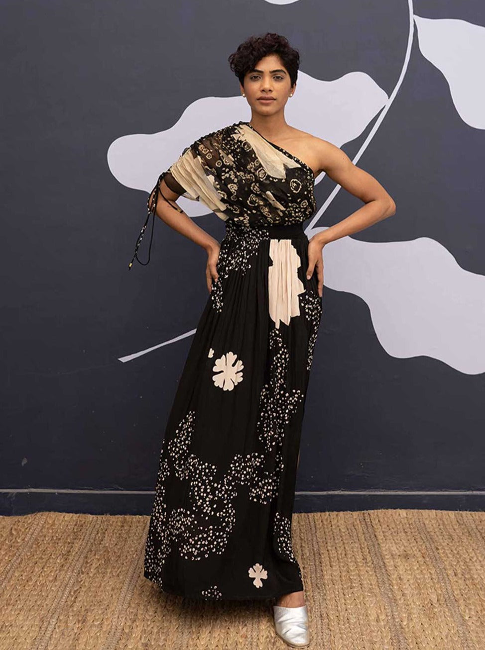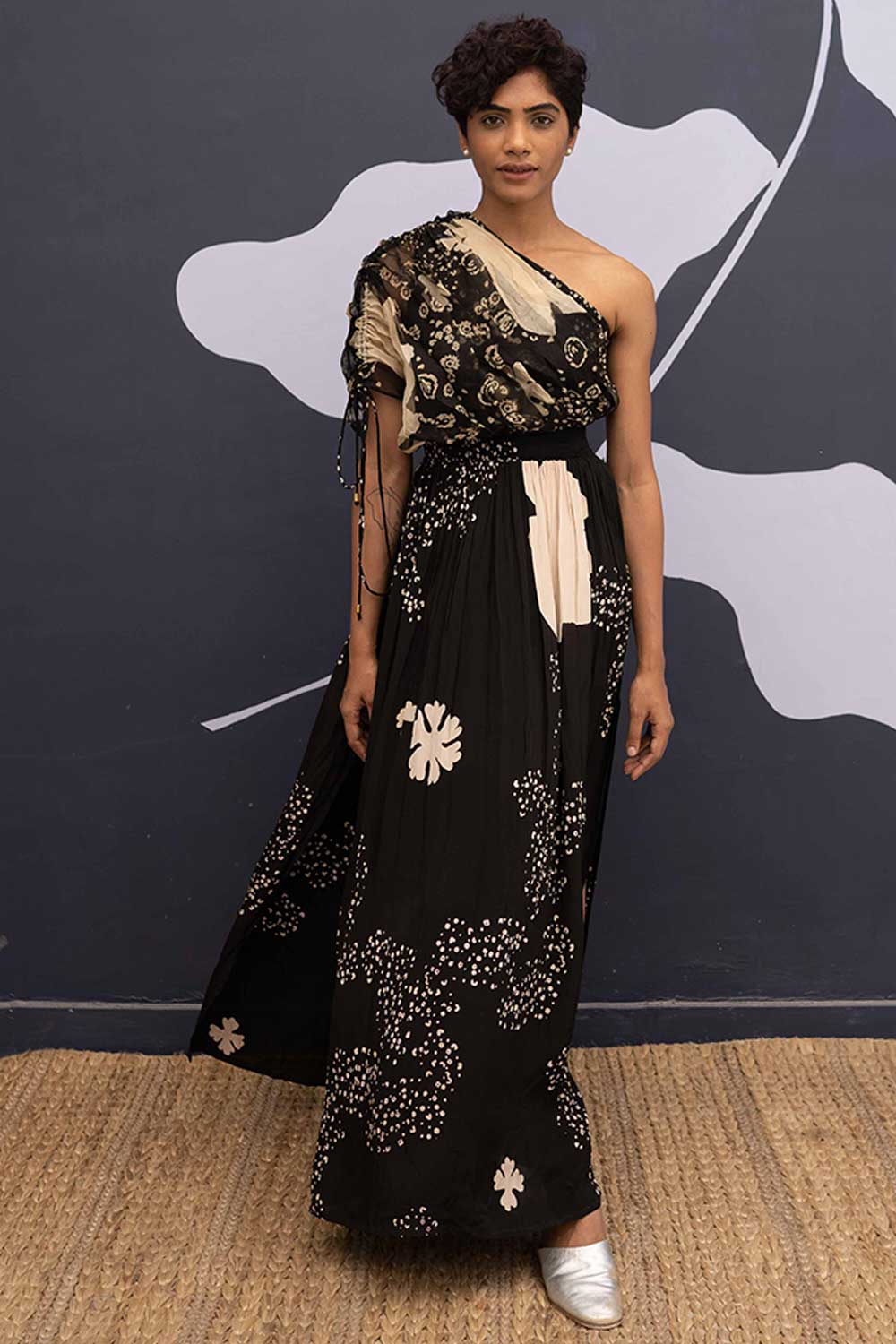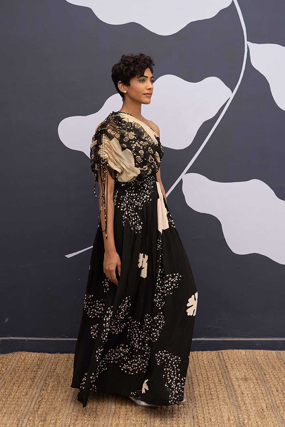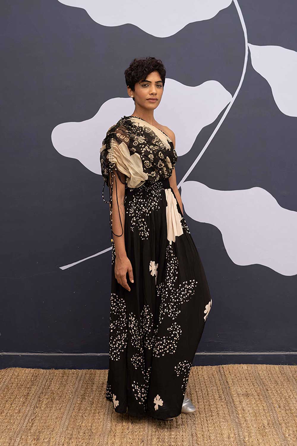 The Black ophelia Dress in crepe and organza features a massive handblock printed lotus , seaside motifs. Subtle variations in colours are natural since each piece is printed separately.