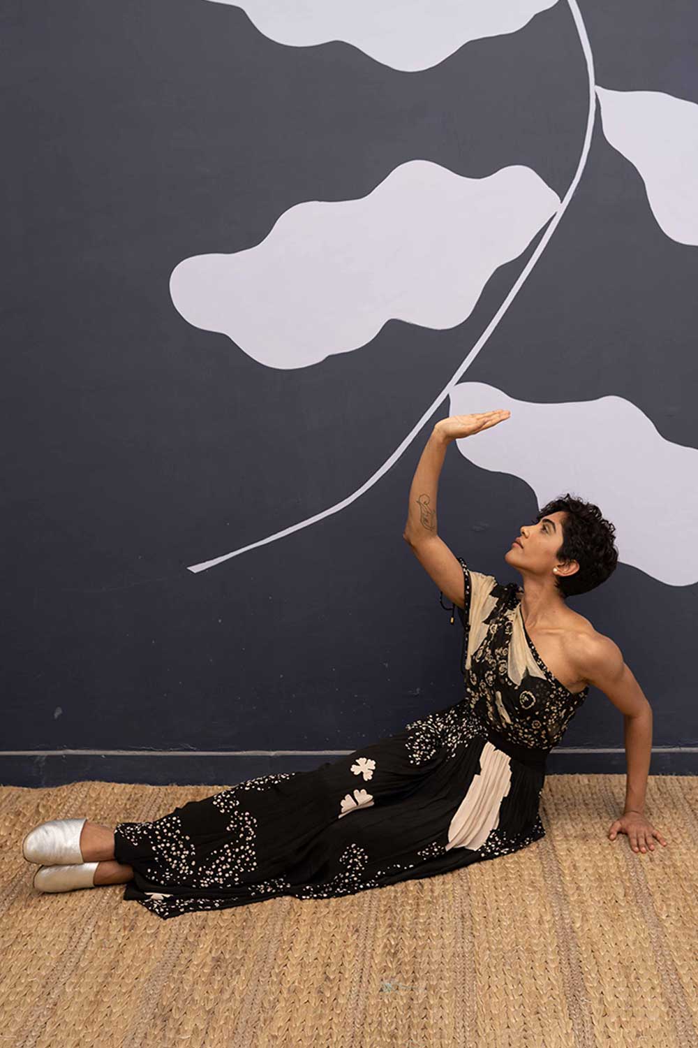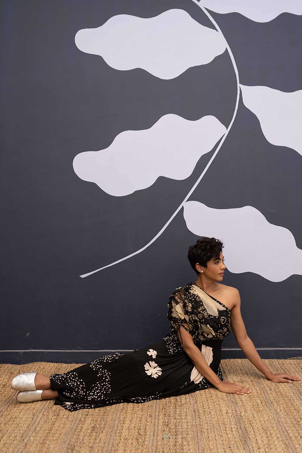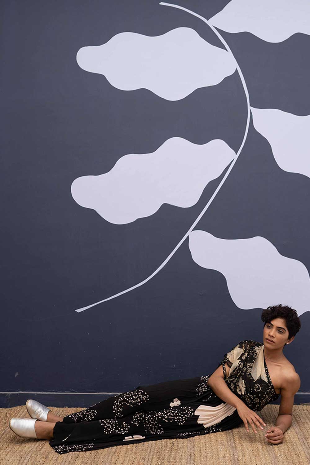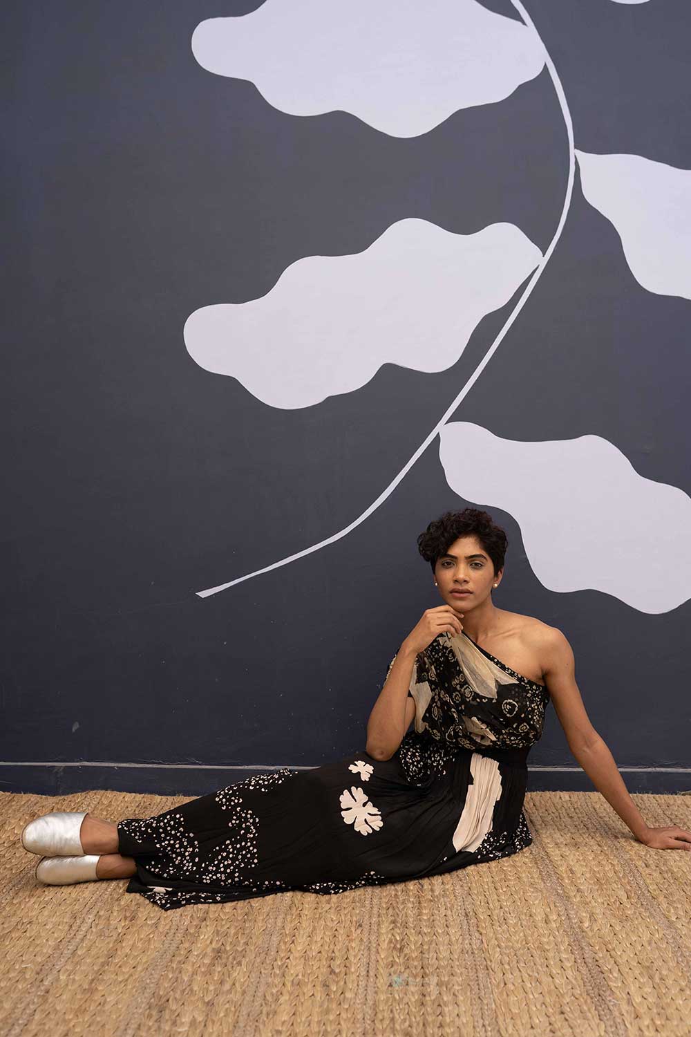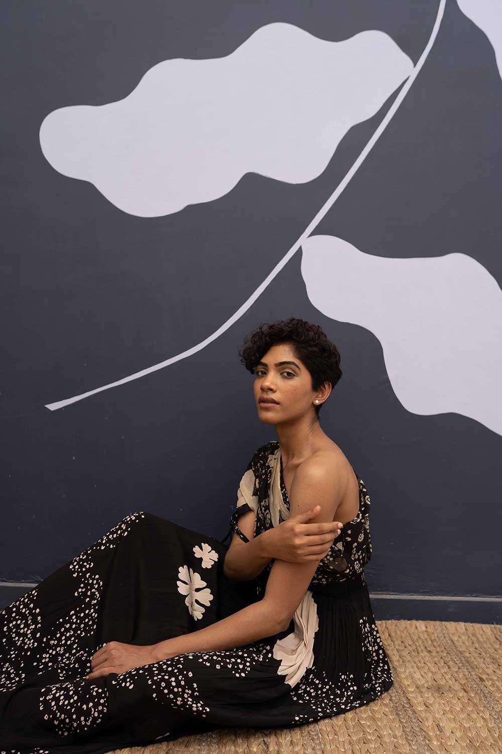 The Black ophelia Dress in crepe and organza features a massive handblock printed lotus , seaside motifs. Subtle variations in colours are natural since each piece is printed separately.
