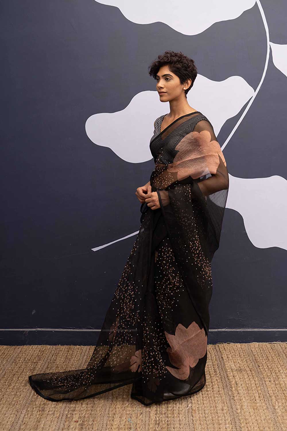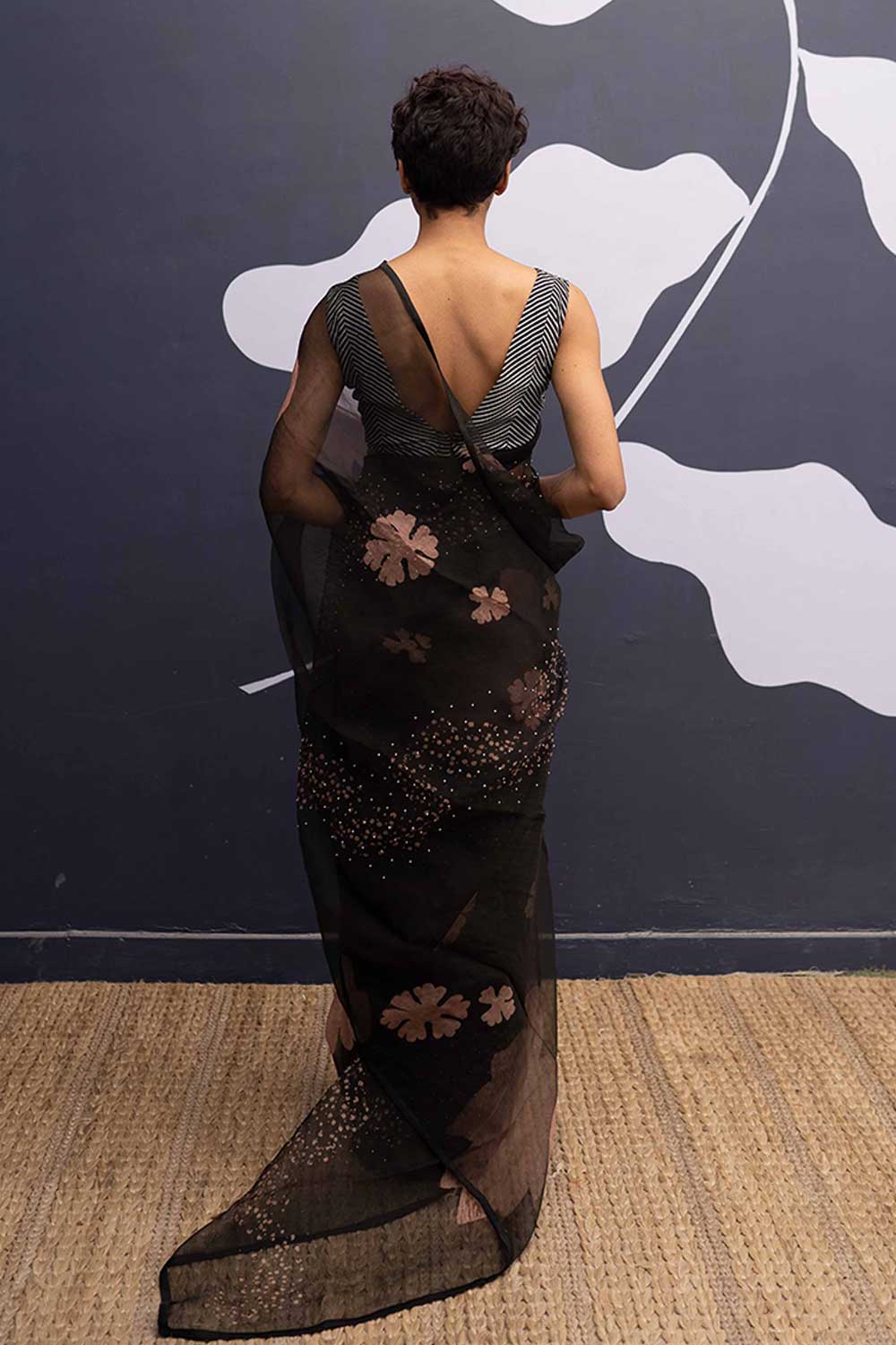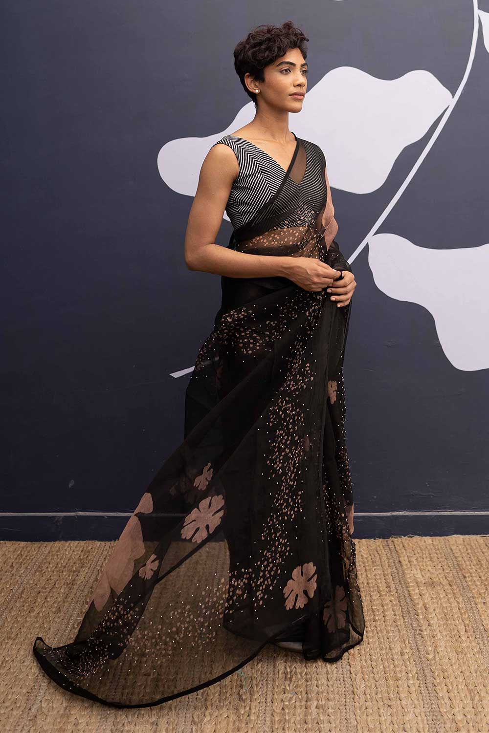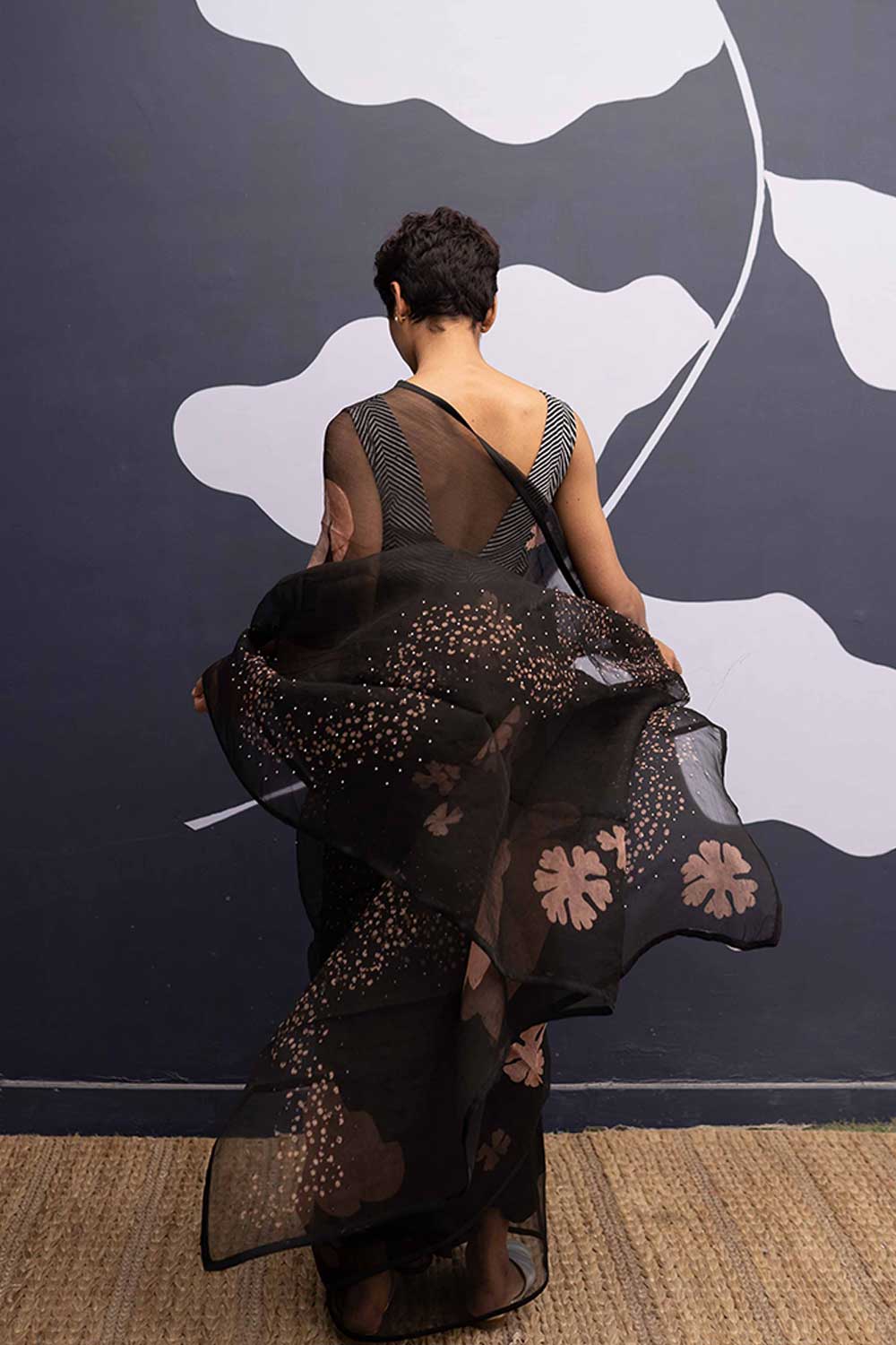 The Black ophelia kaftan in crepe features a massive handblock printed lotus , seaside motifs. The saree is embellished with pearl embroidery.