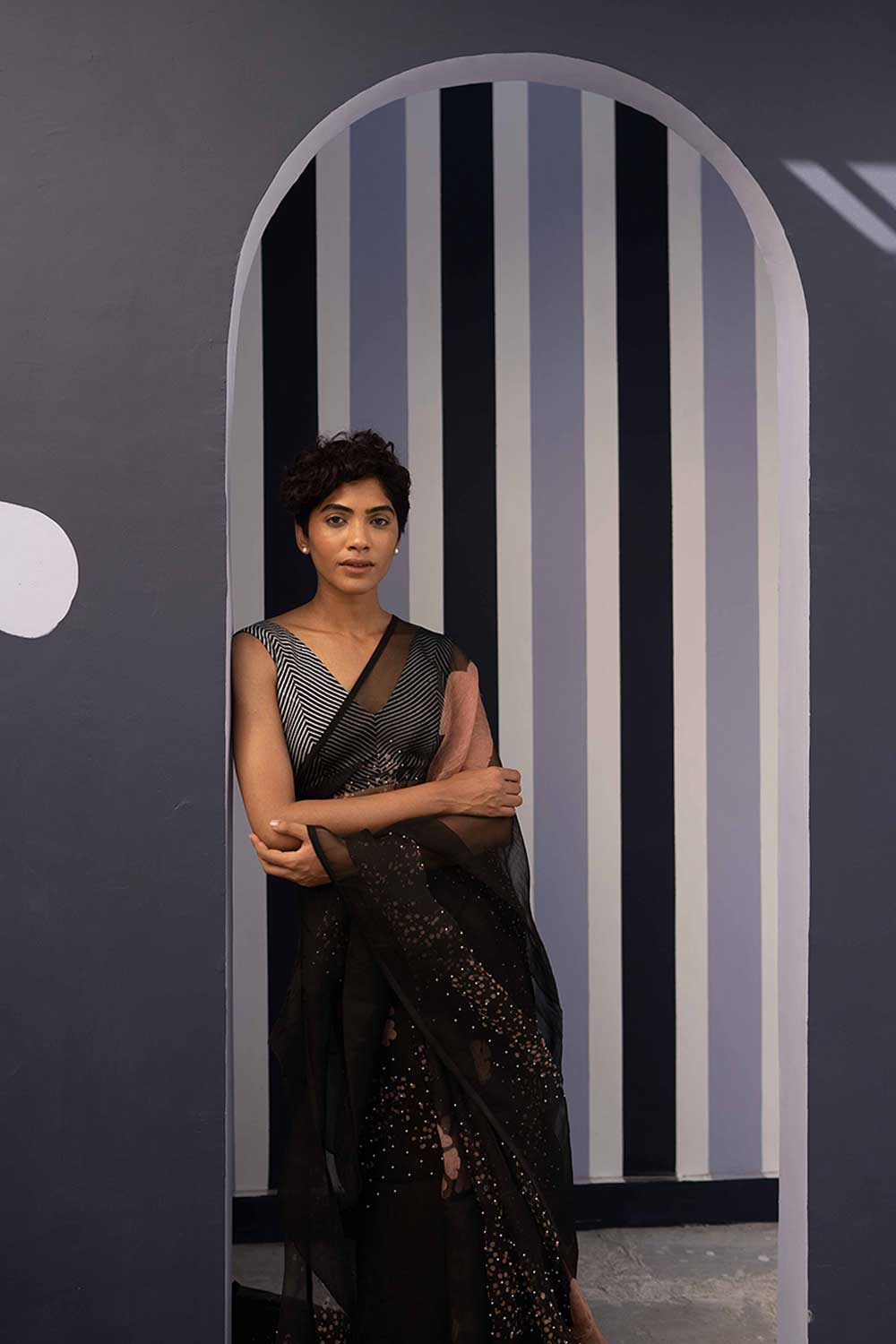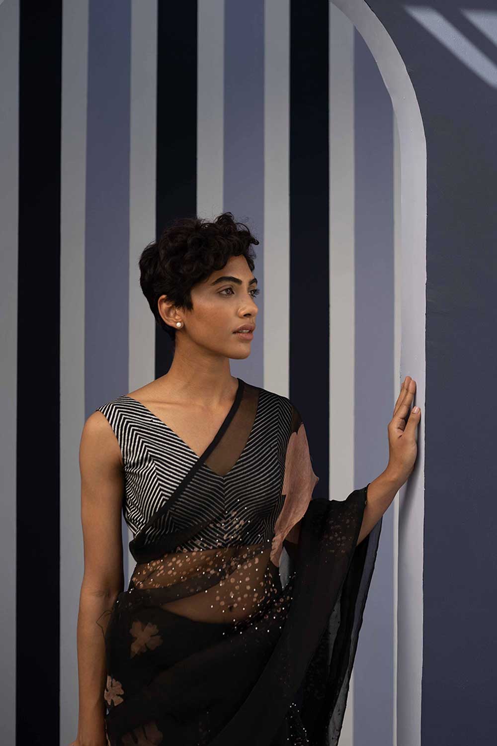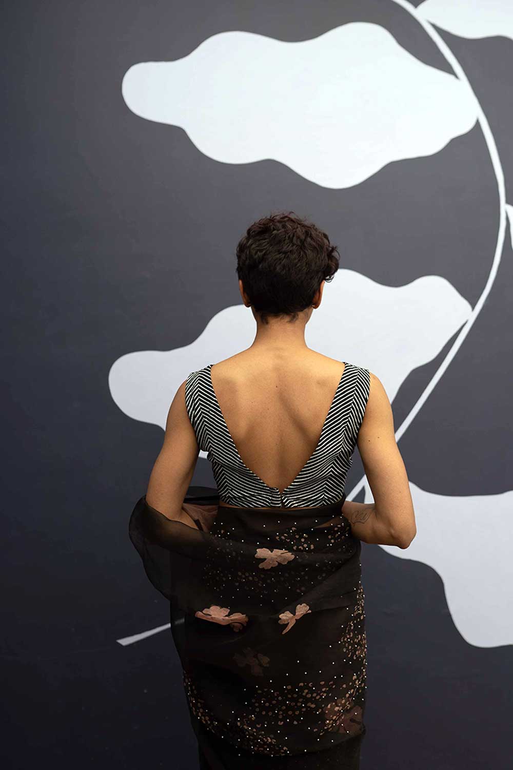 The Black ophelia kaftan in crepe features a massive handblock printed lotus , seaside motifs. The saree is embellished with pearl embroidery.