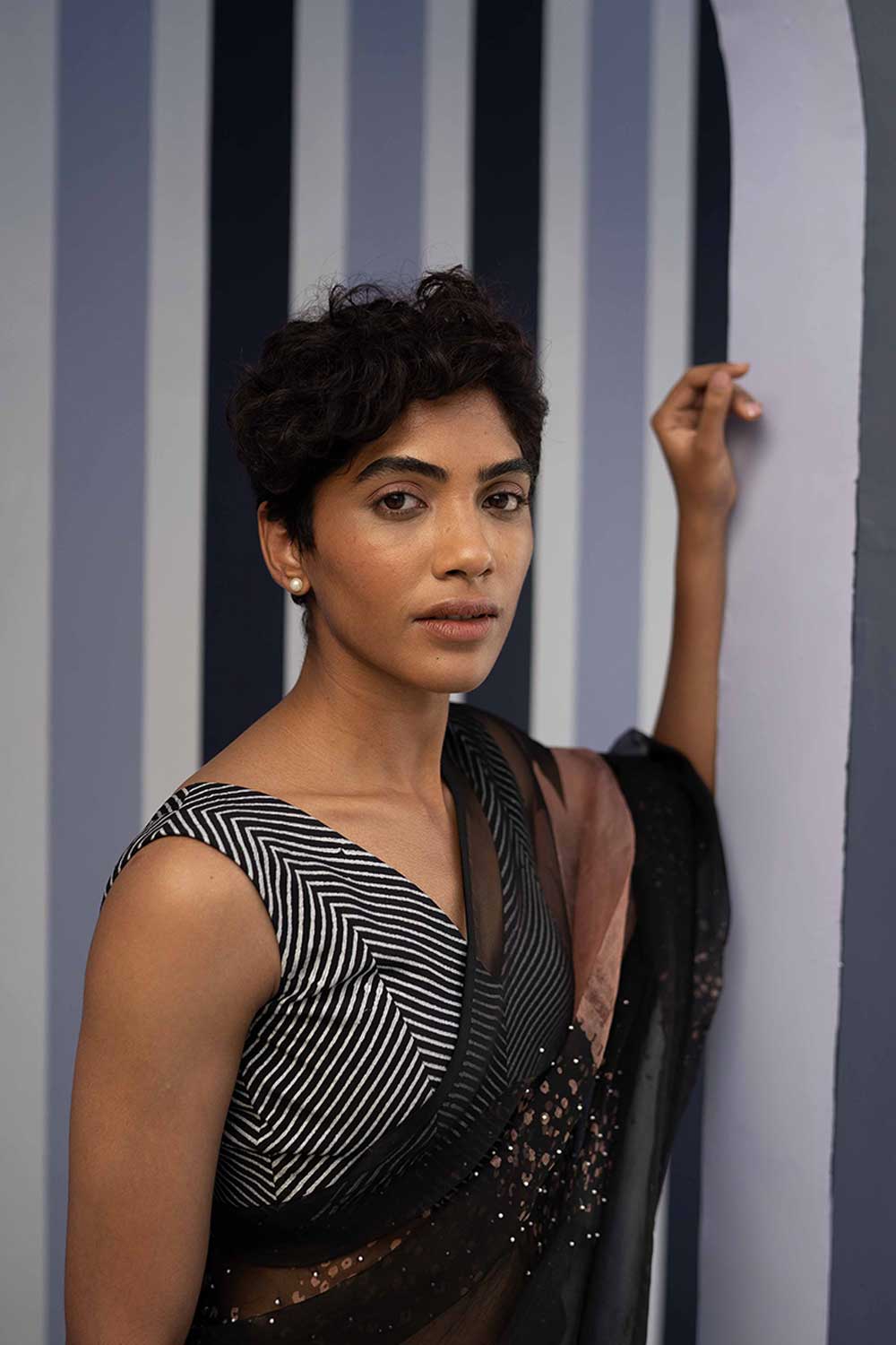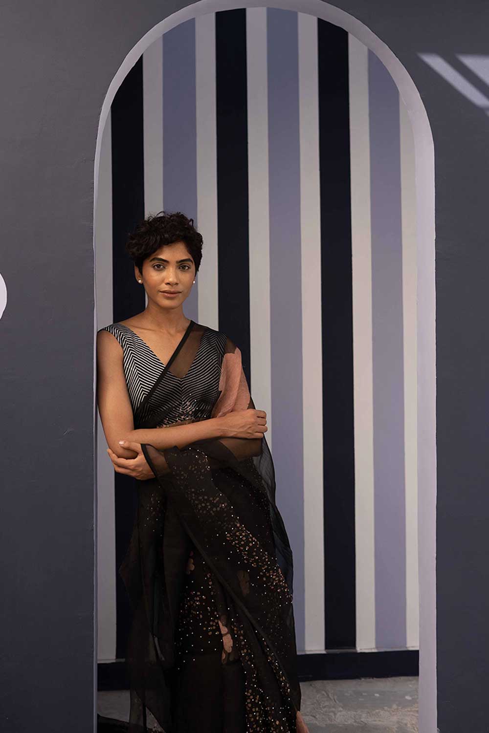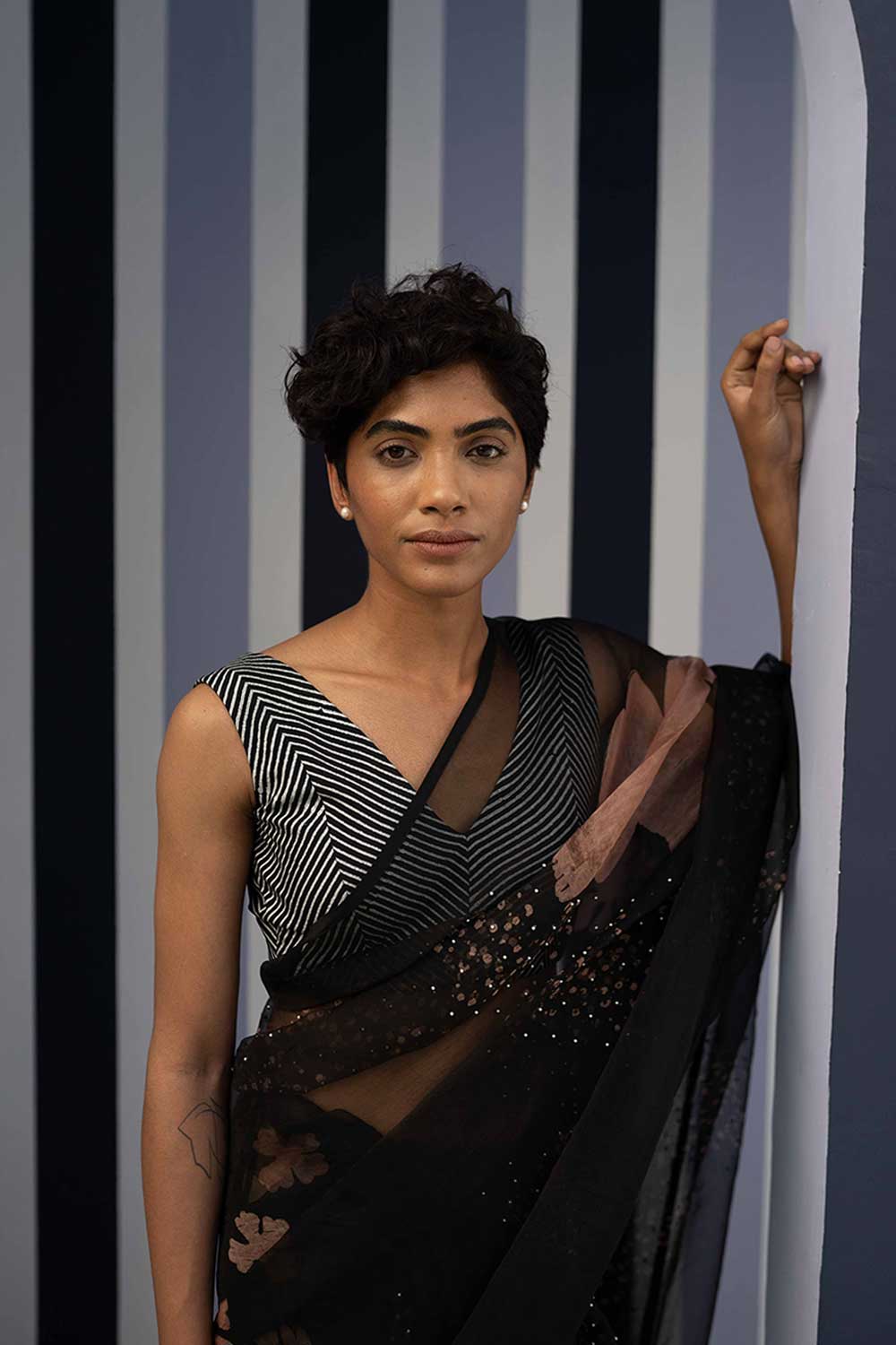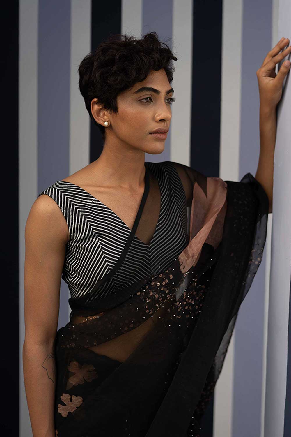 The Black ophelia kaftan in crepe features a massive handblock printed lotus , seaside motifs. The saree is embellished with pearl embroidery.