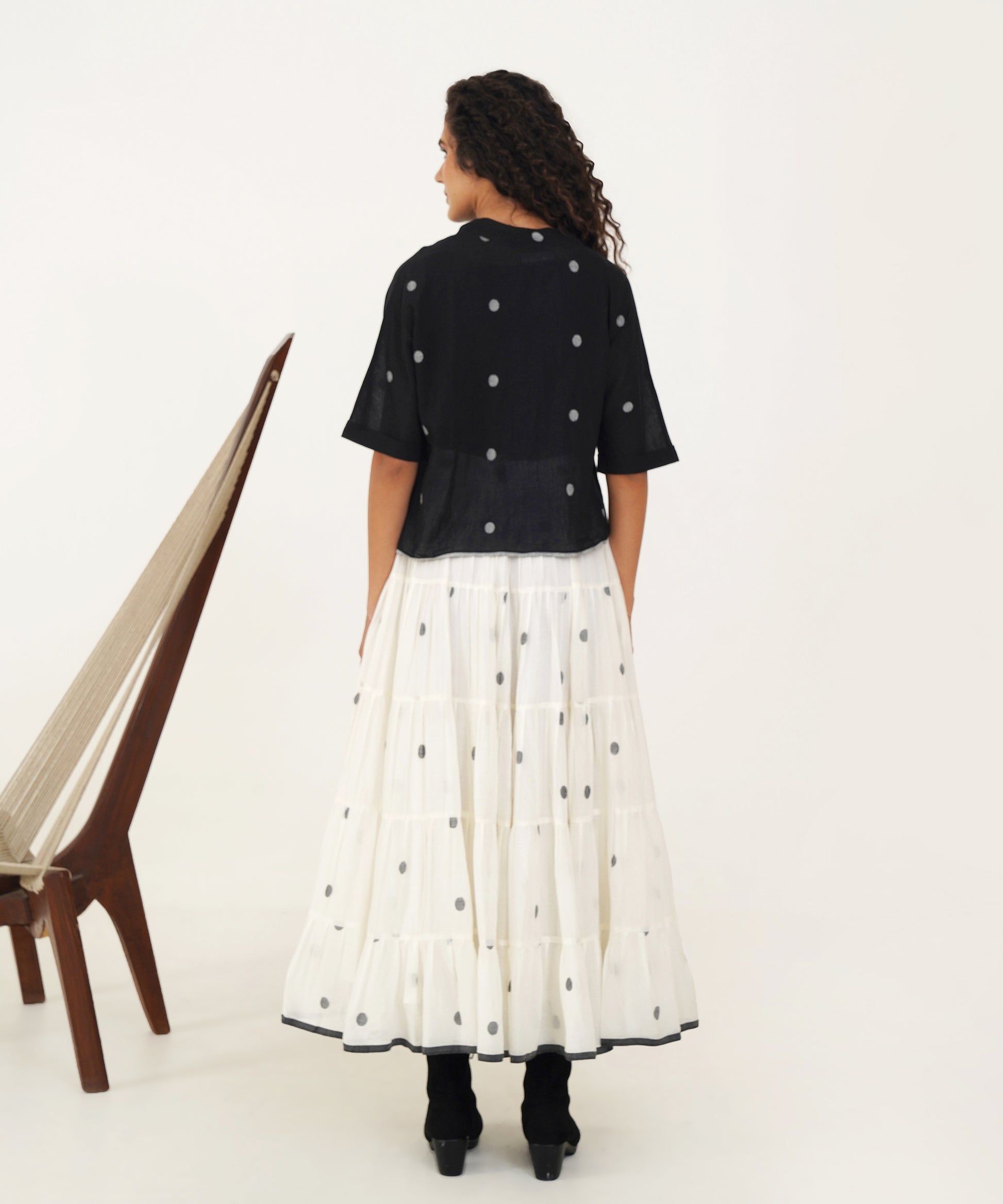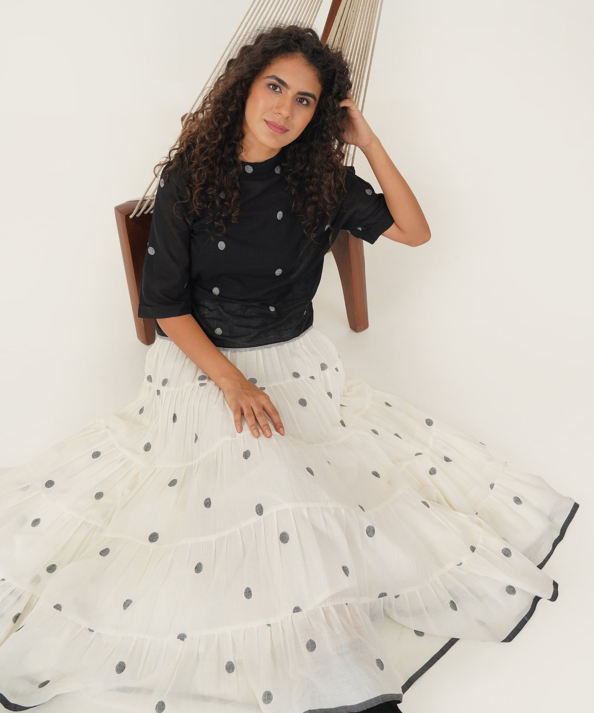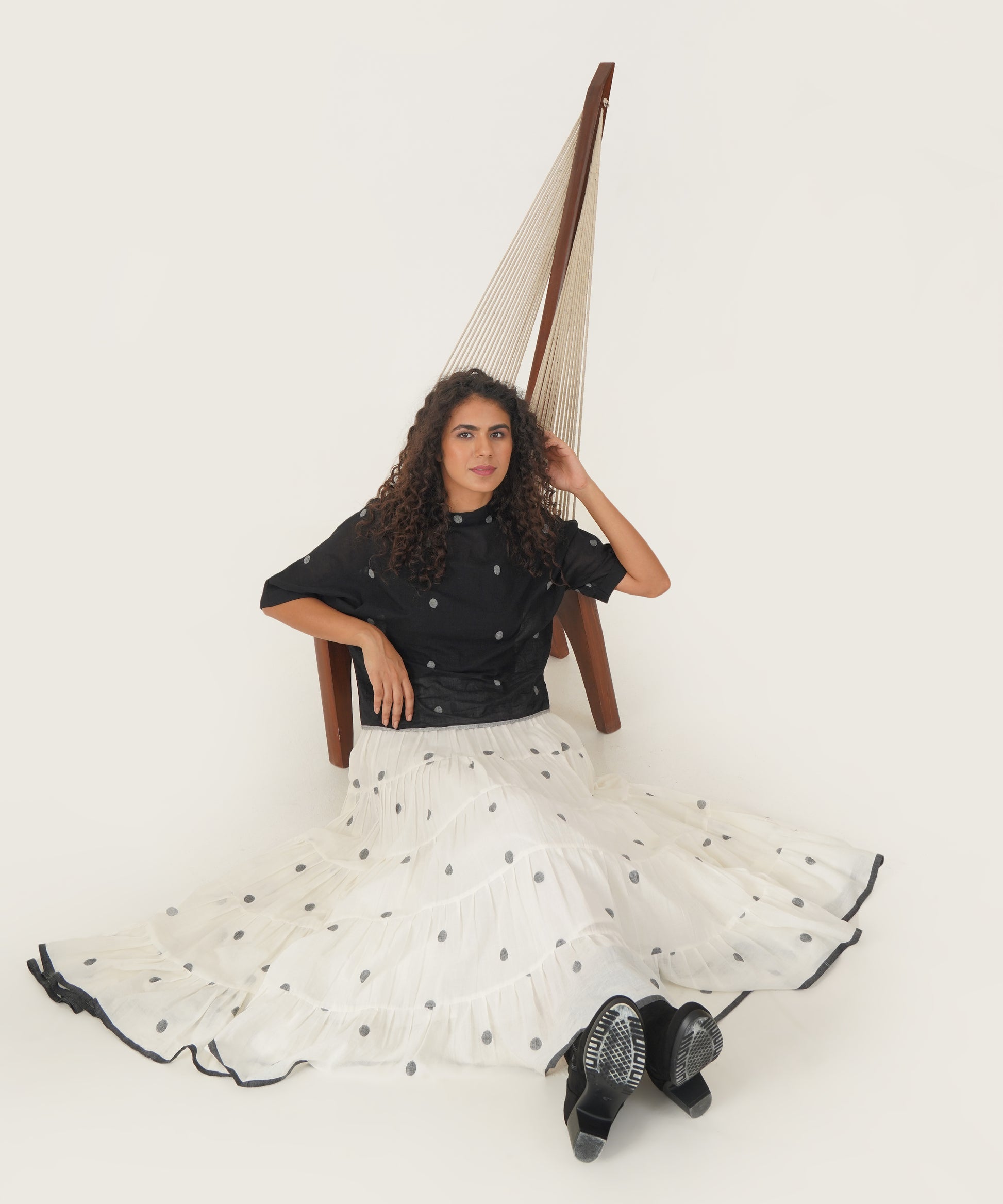 A timeless ensemble that exudes effortless elegance, featuring a voluminous tiered skirt with practical side pockets for a touch of modern convenience. Paired with a structured Jamdani boxy top, this outfit is elevated by its wide polo neck and neatly folded sleeves, creating a chic yet relaxed silhouette. Perfectly blending tradition with contemporary design, this set offers versatility and sophistication in every detail.