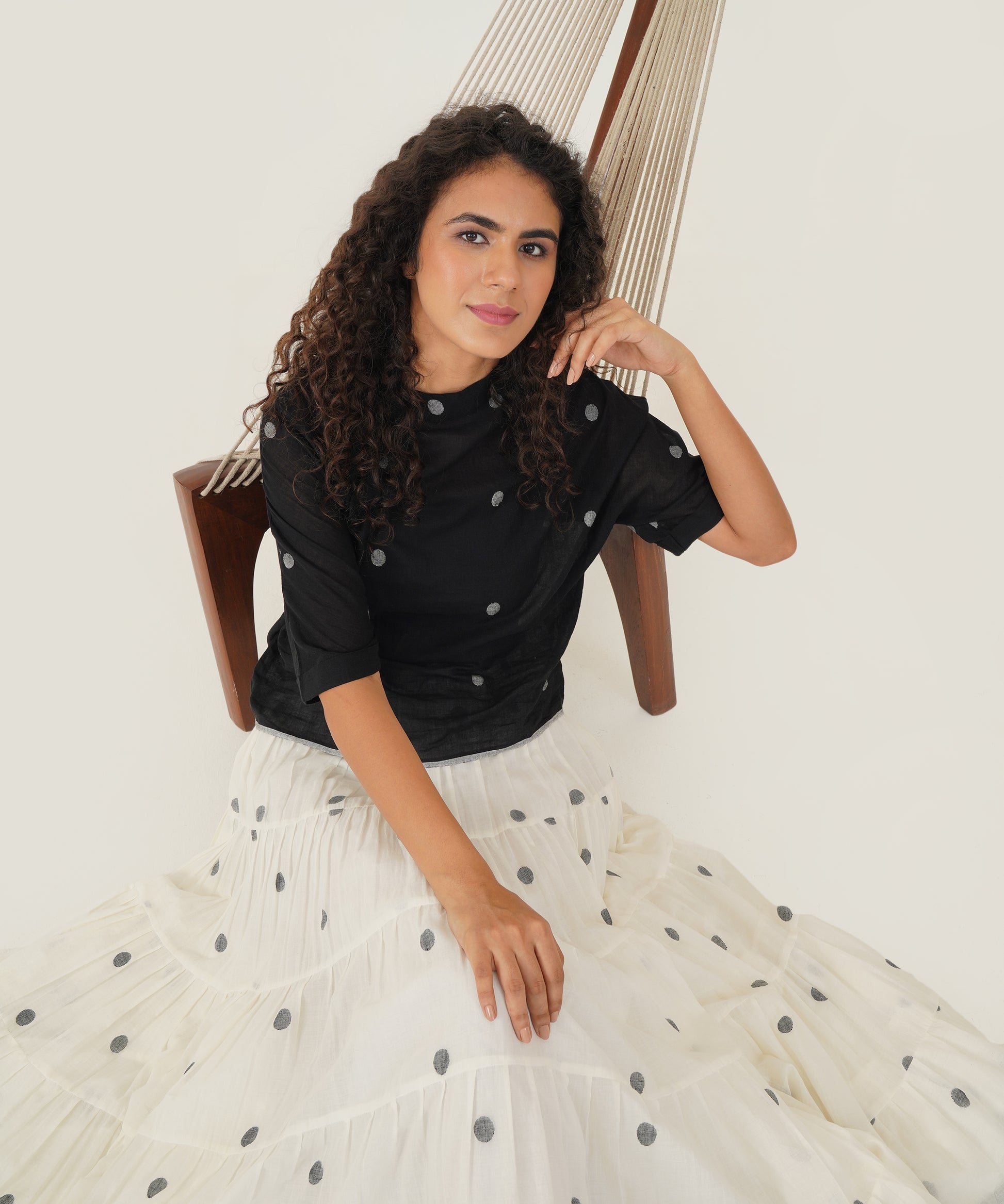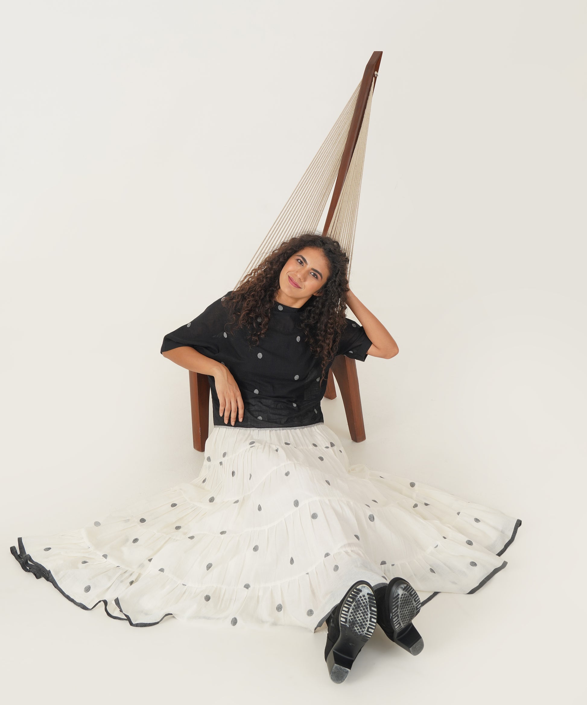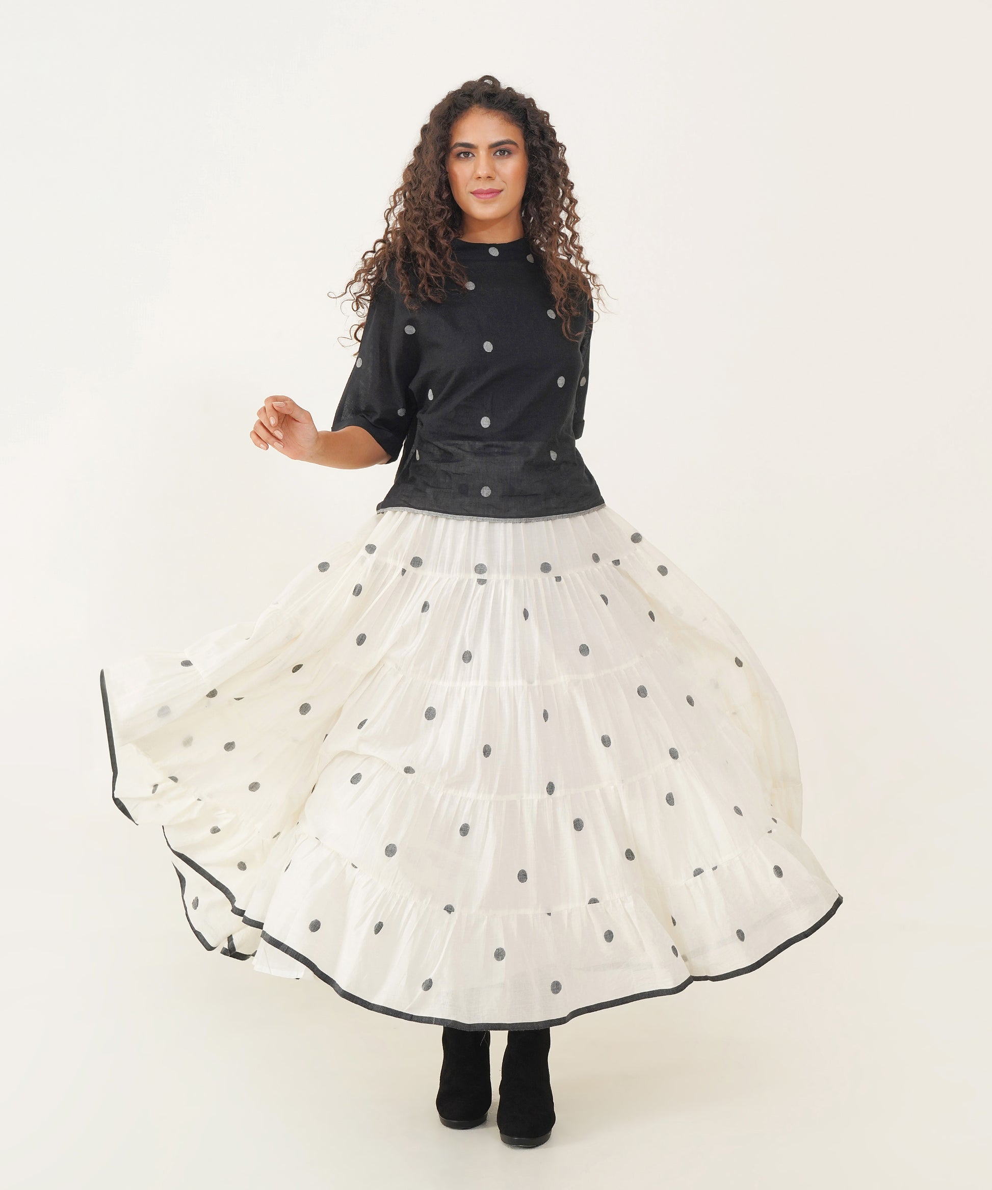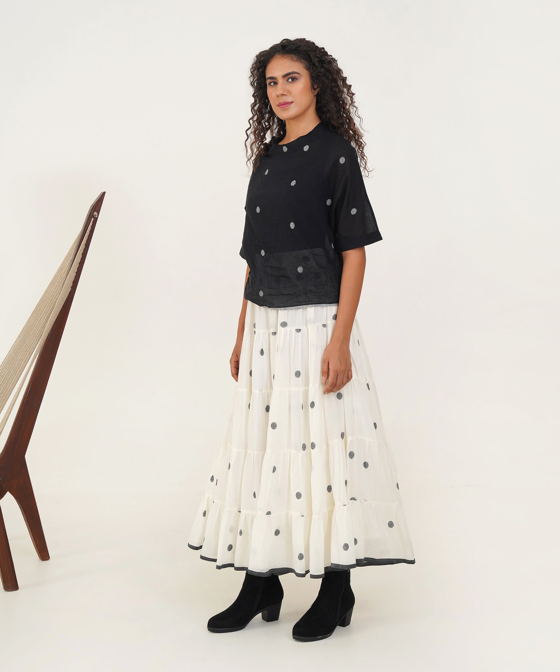 A timeless ensemble that exudes effortless elegance, featuring a voluminous tiered skirt with practical side pockets for a touch of modern convenience. Paired with a structured Jamdani boxy top, this outfit is elevated by its wide polo neck and neatly folded sleeves, creating a chic yet relaxed silhouette. Perfectly blending tradition with contemporary design, this set offers versatility and sophistication in every detail.