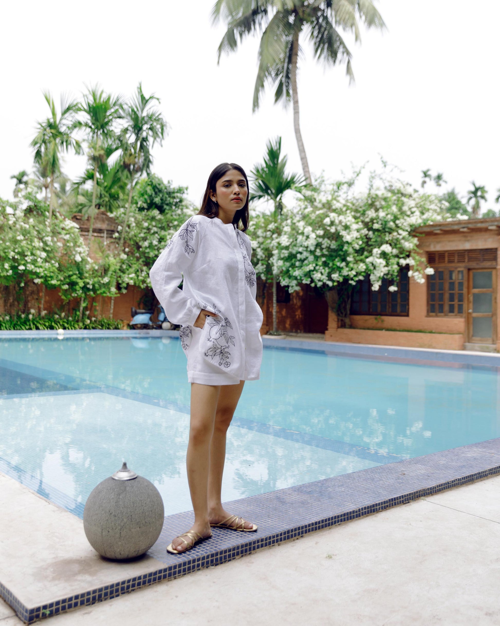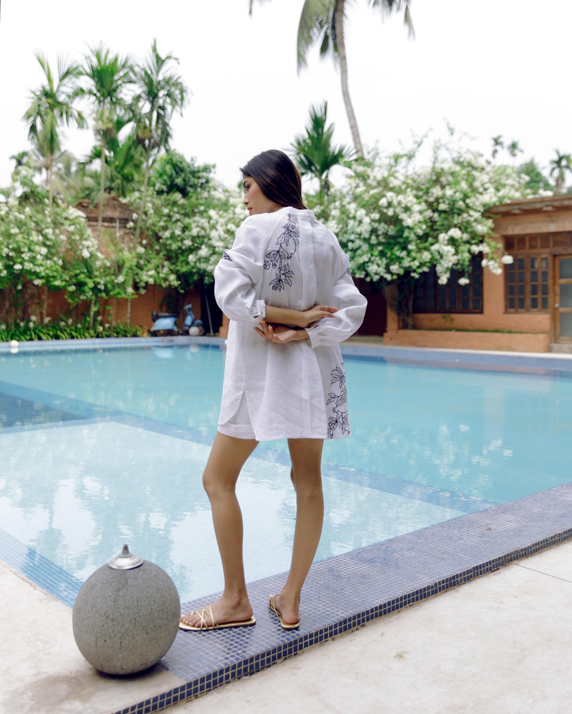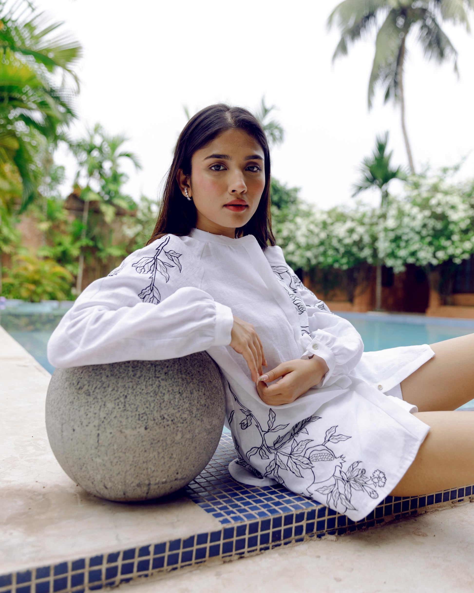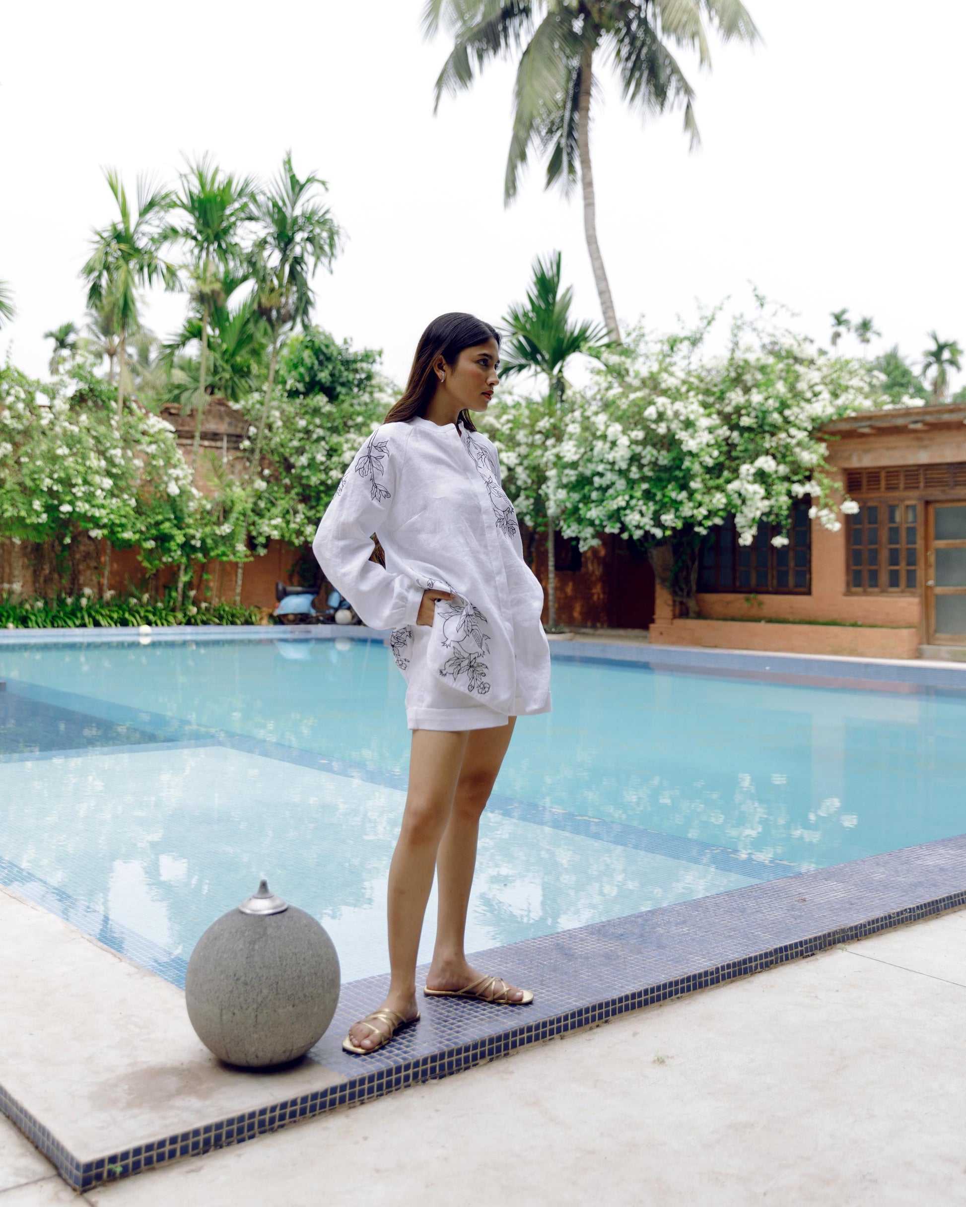 A crisp white linen shirt with black motif embroidery and bead work on the collar. Paired with comfortable and versatile drawstring waist white linen shorts.