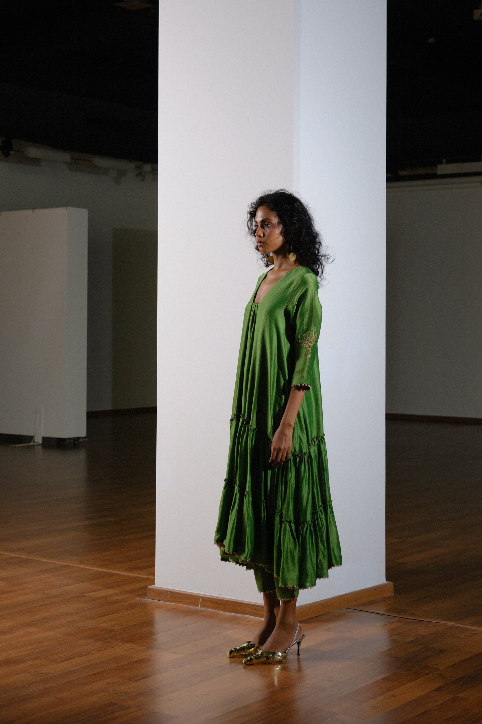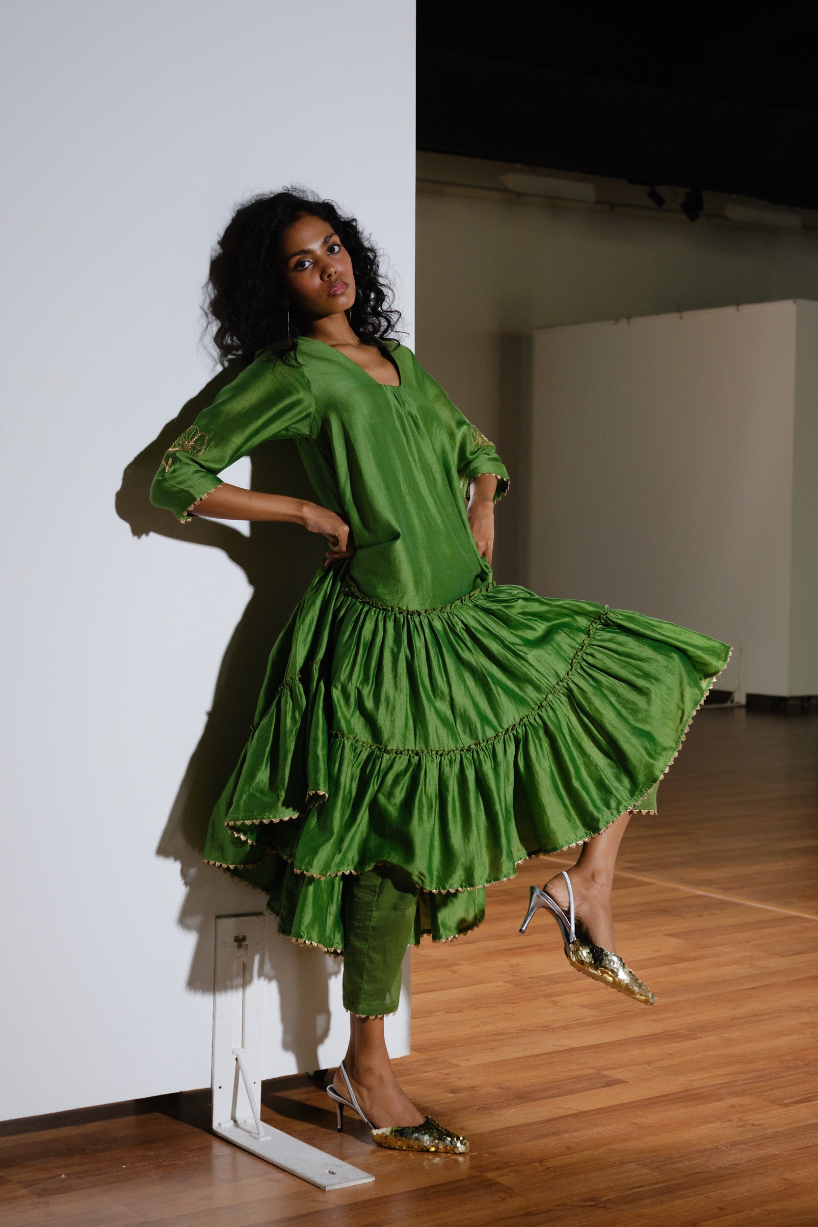 A vibrant green Chanderi Silk kurta set featuring gathered tiers, paired with slim pants and a contrasting pink kota silk dupatta adorned with delicate embroidery.