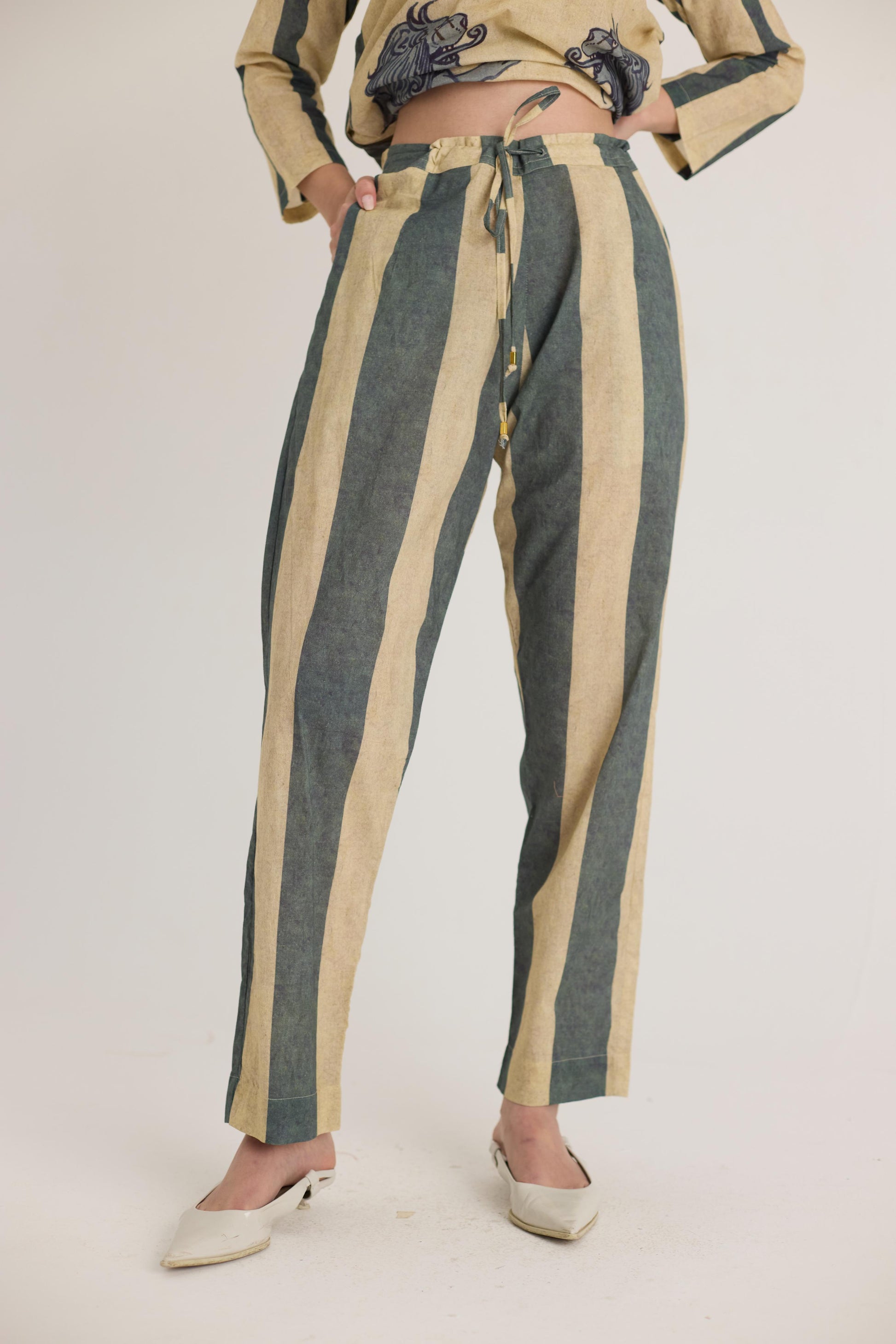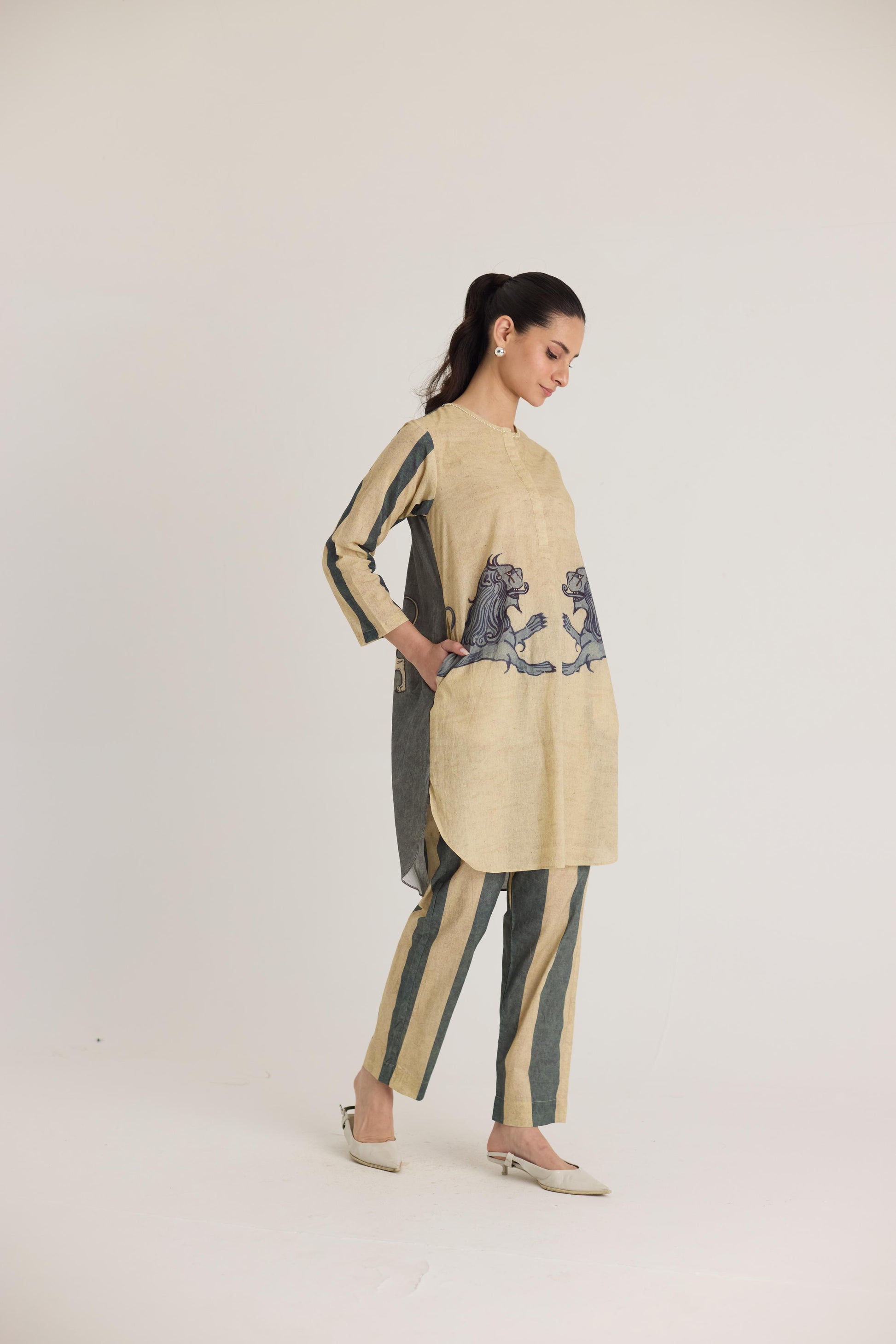 This ensemble features a striking mythical lion motif on the shirt, symbolizing strength and heritage. The hand-drawn artwork is reminiscent of traditional folk art, lending a regal yet contemporary aesthetic. Complementing the detailed print, the trousers showcase bold vertical stripes in earthy tones, adding a structured and elongated silhouette.
