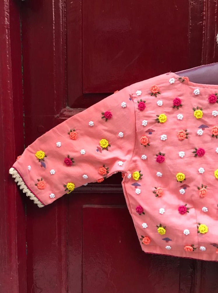 On peach hand woven Jamdani, hot pink, tangy orange and canary yellow roses are hand embroidered all over. In between there are white French knot roses on white body.