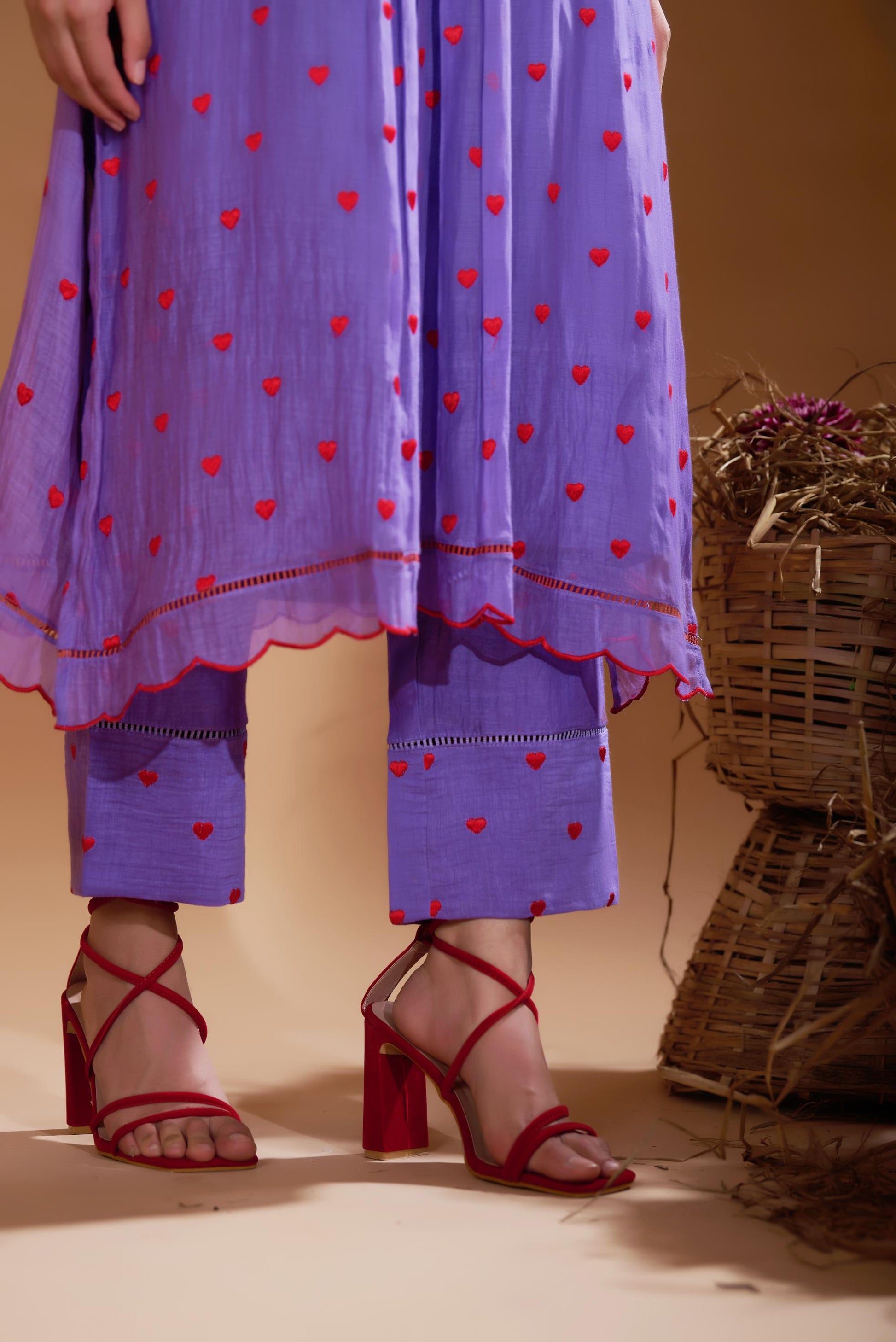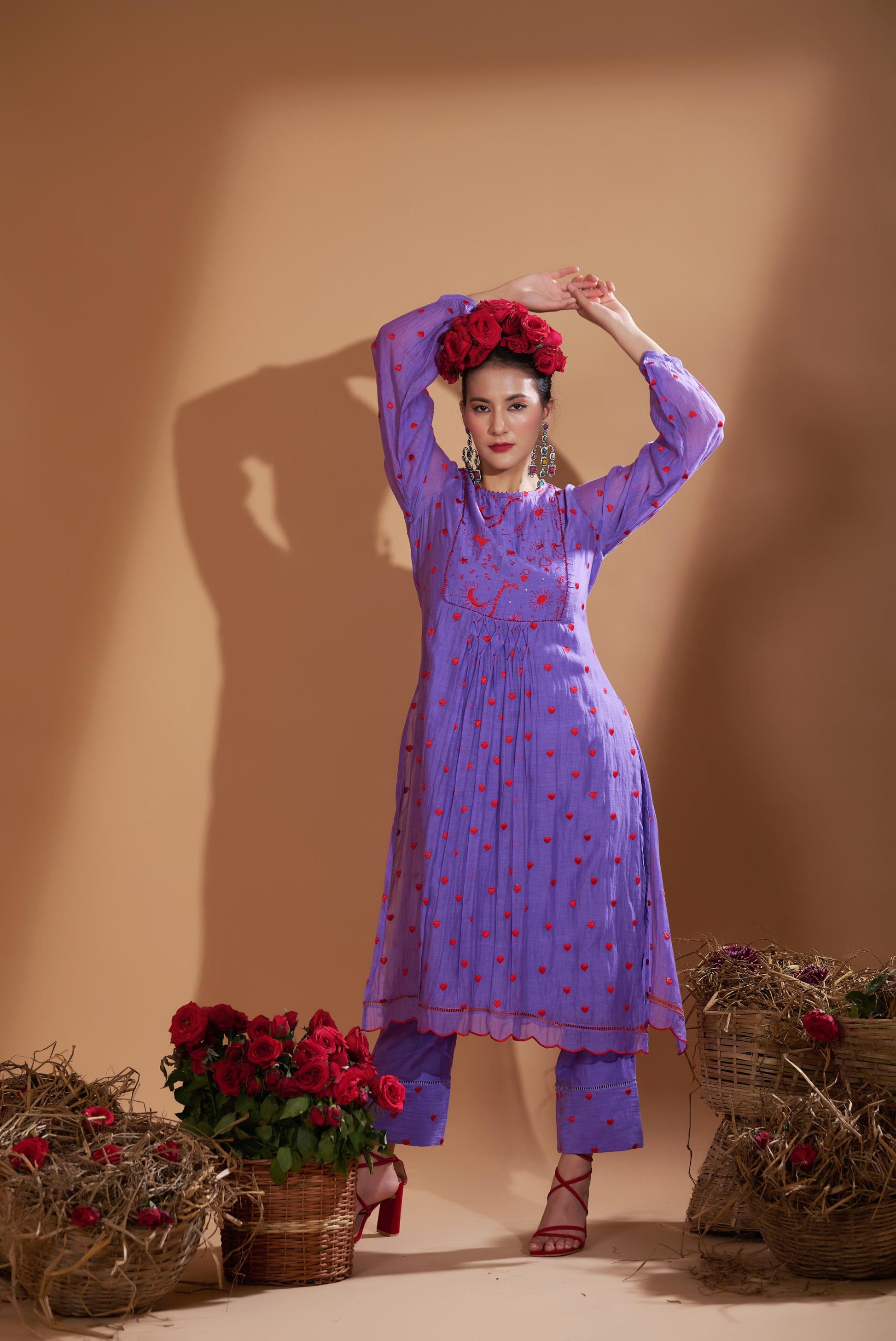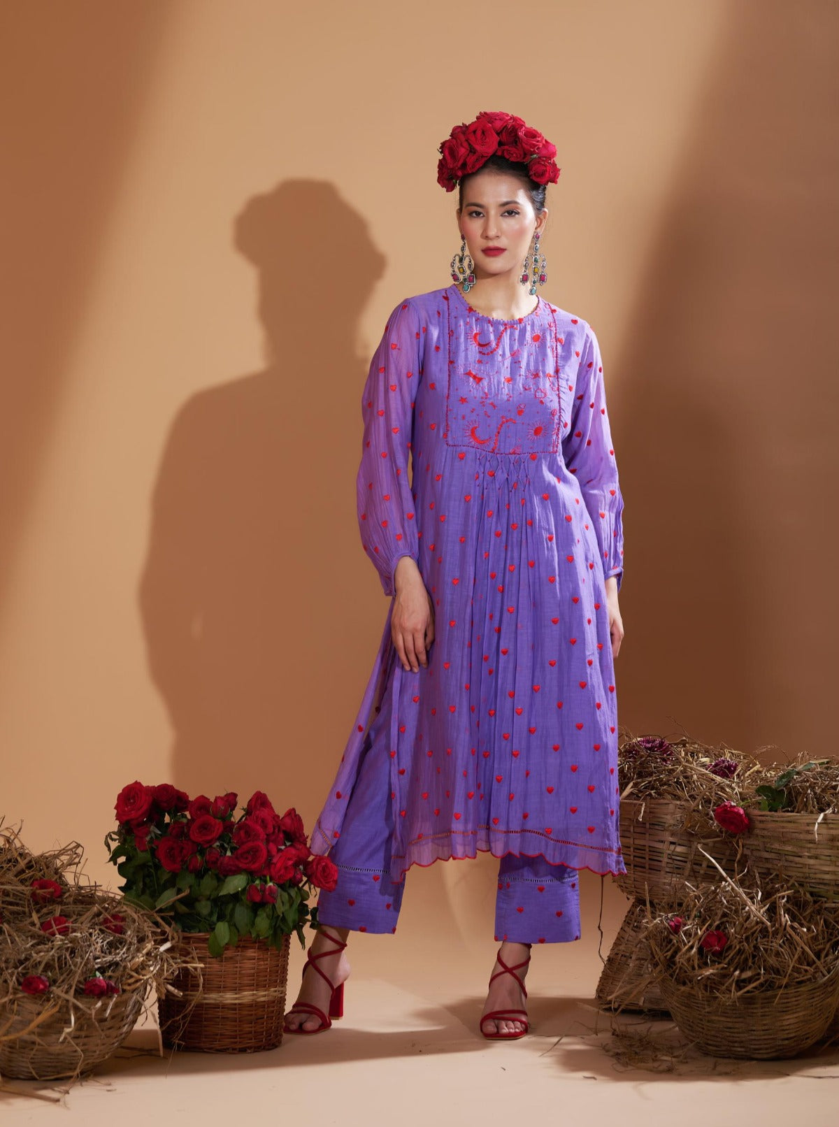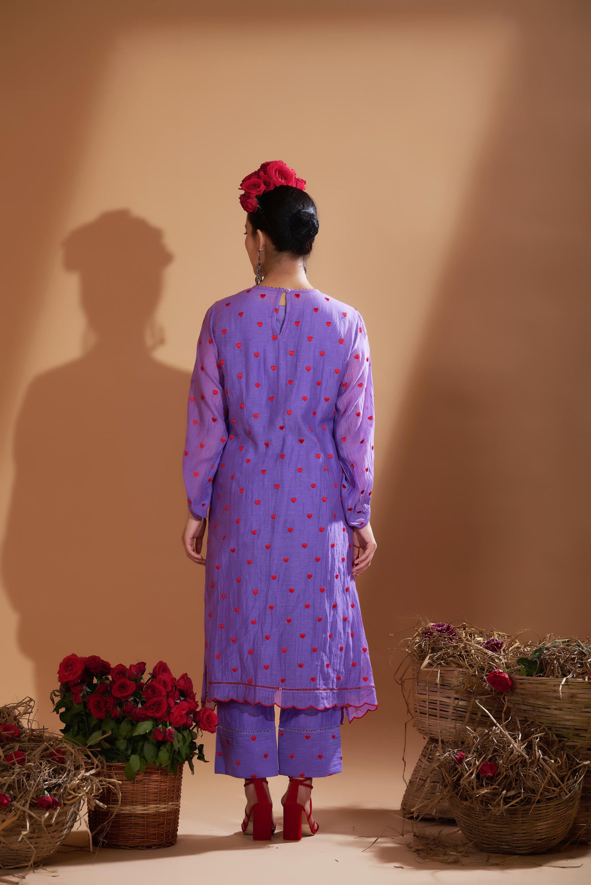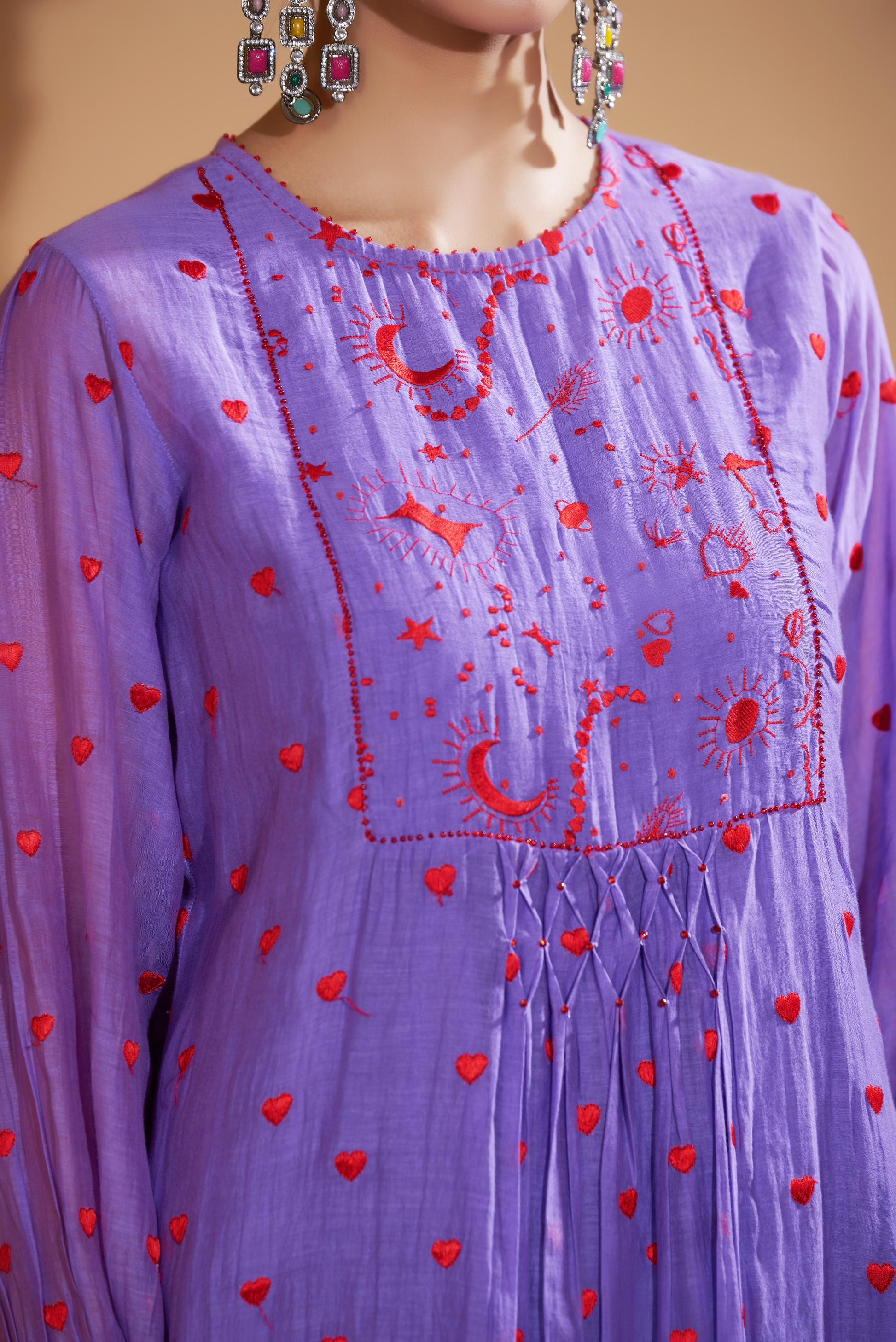 A well comfort Kurta set featured with universe embroidered yoke along with heart embroidery all over and peasant sleeve. The Kurta is detailed with sequins and beaded hand work with scalop edging hem. The pant is detailed with lace and heart embroidery paired with slip. It is ideal for effortless day wear or for small gathered occassional wear.