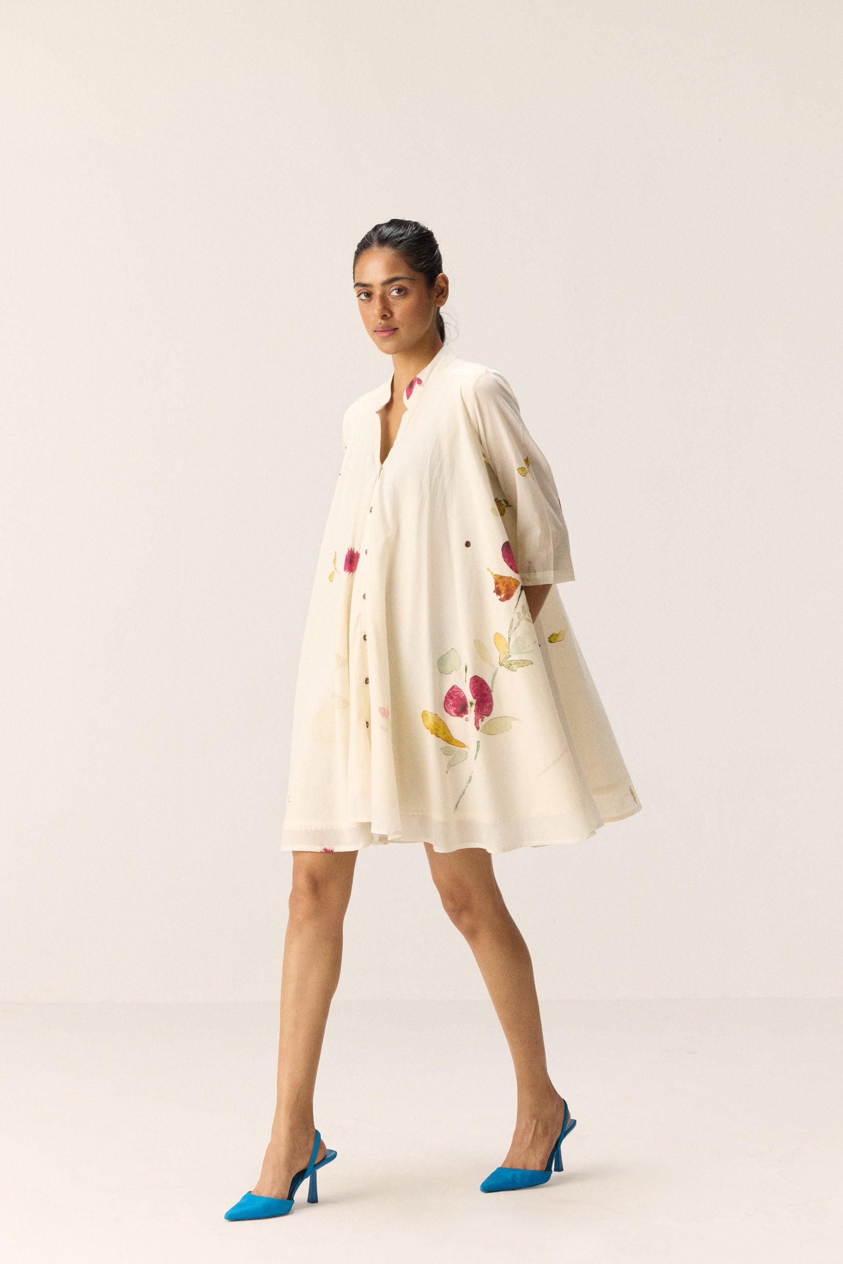 A short white dress crafted in soft, pure cotton mul, featuring an all-over floral print. Designed with a mandarin collar, front button opening, and practical side pockets, it blends classic structure with everyday ease.