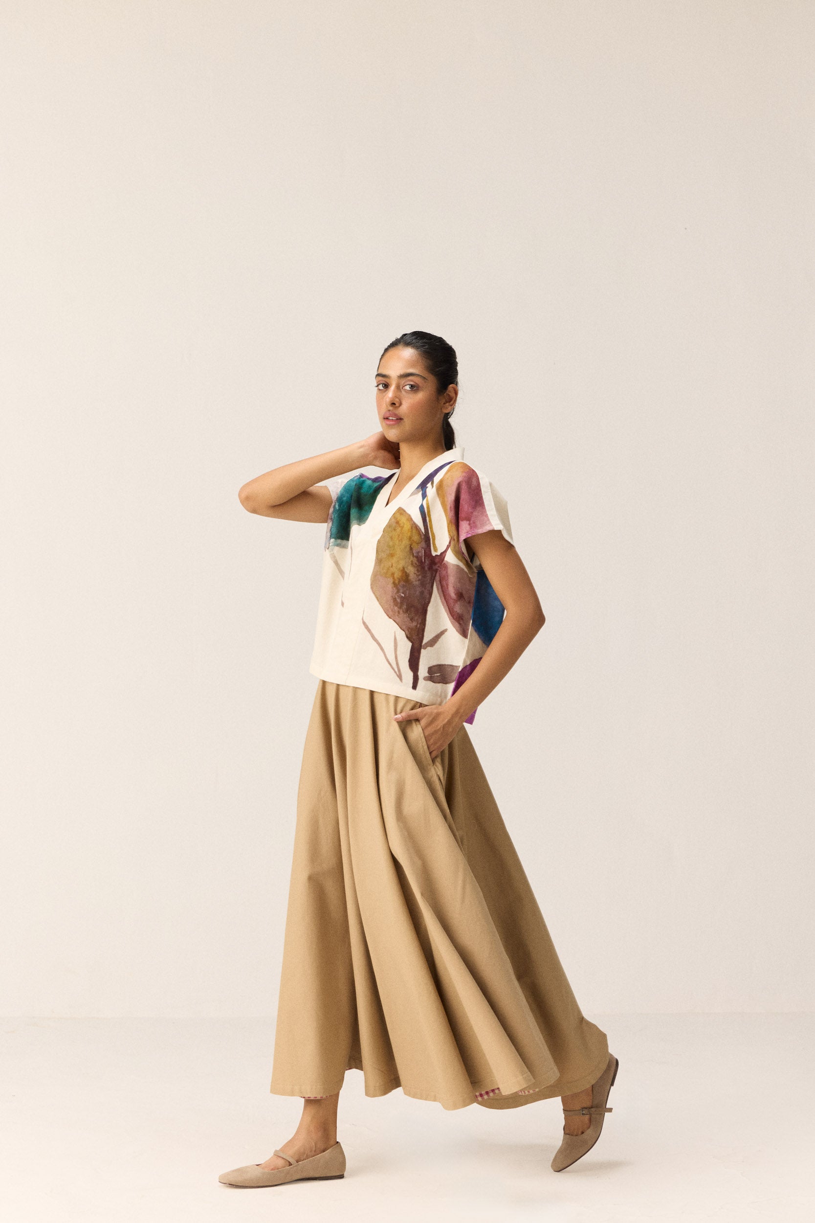 A beige Oxford skirt with a tailored silhouette, featuring a concealed side zipper and button closure. Designed with practical side seam pockets, it reveals a subtle pop of color through its red printed inner lining.