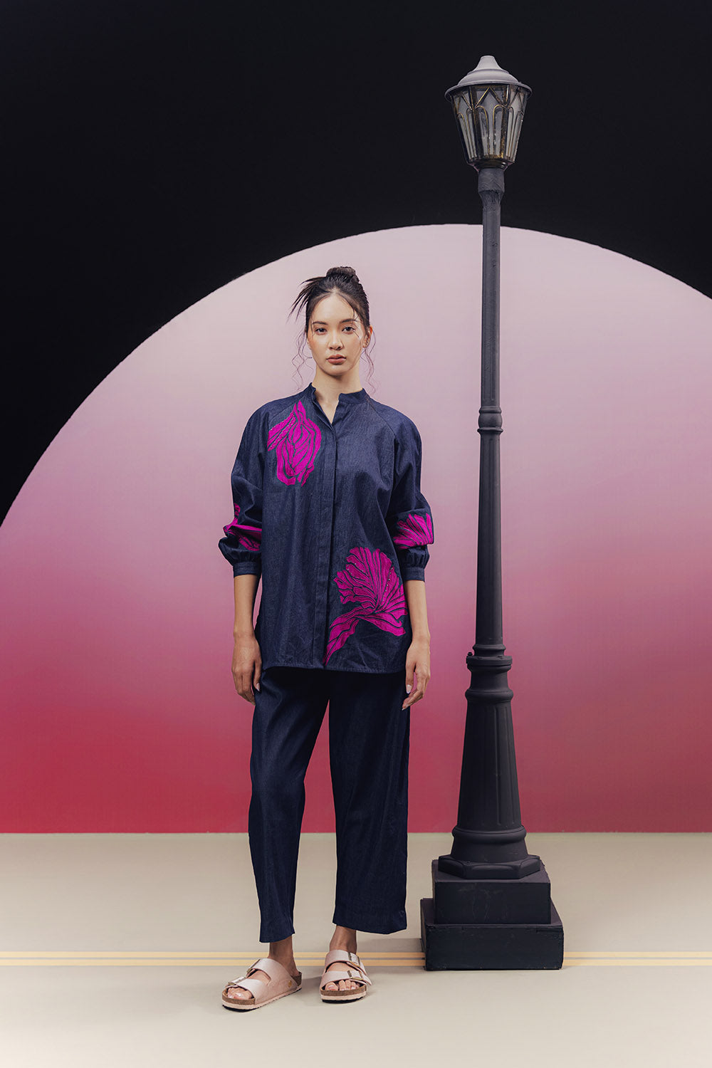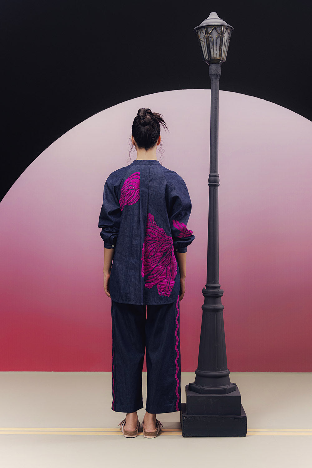 Raglan cut co-ord set with contrast silk appliqué on the shirt and pant borders. The applique is further highlighted with metallic bead work