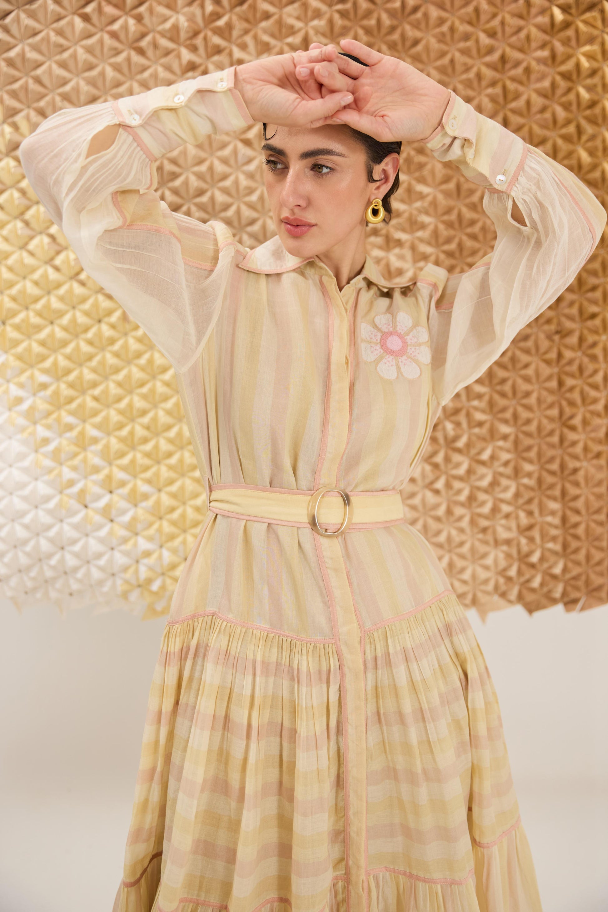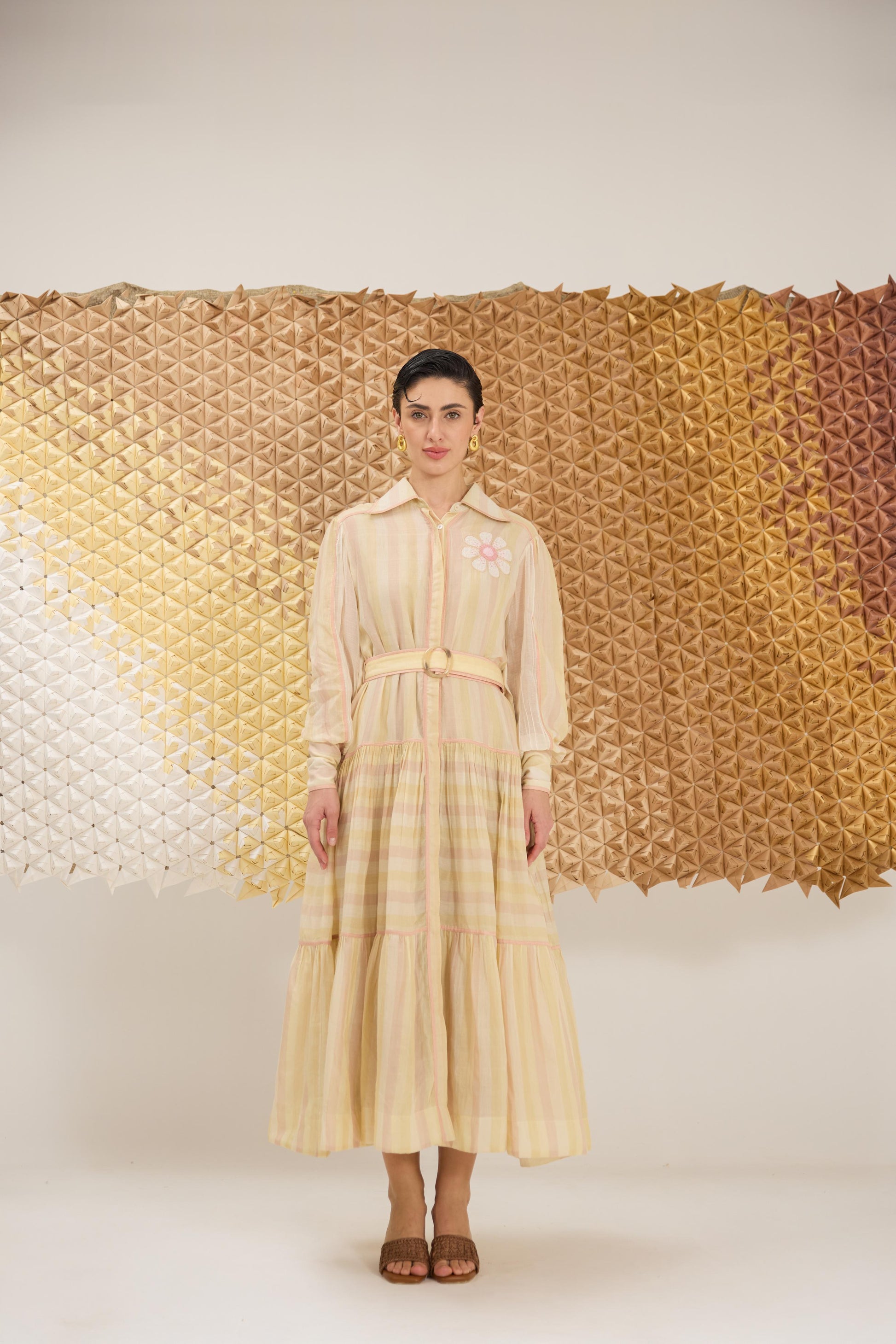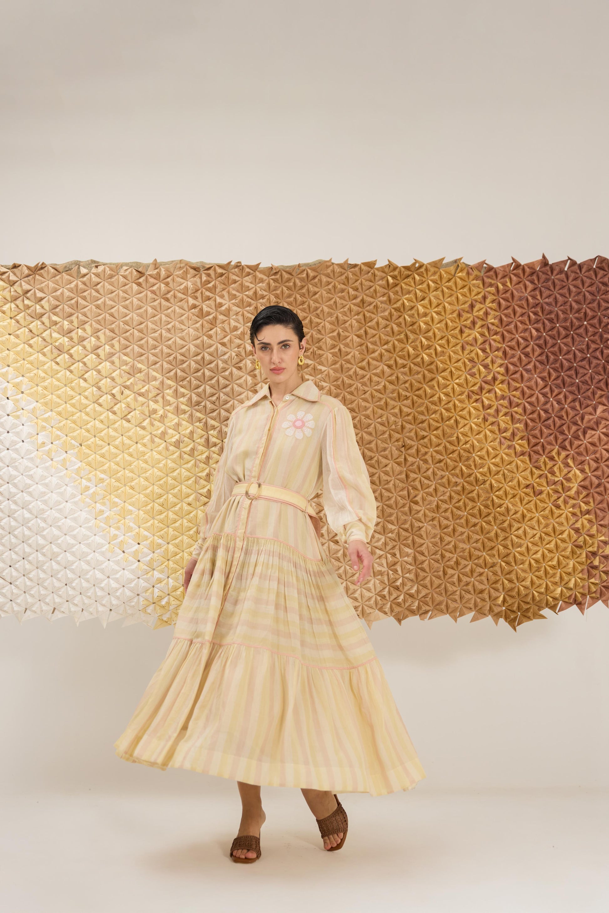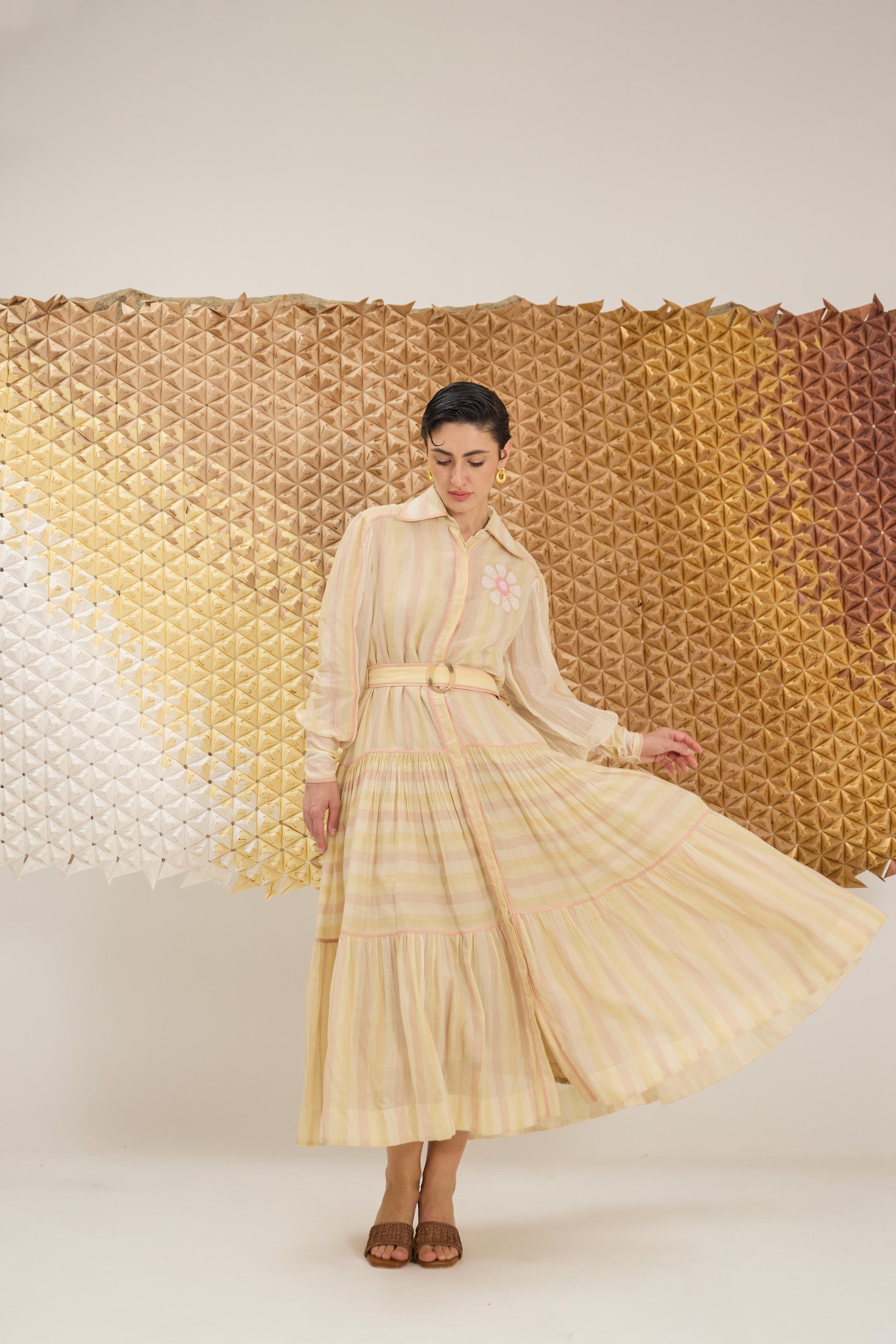 Crafted from hand woven Cotton Silk fabric this dress is a button down flowy dress with voluminous skirt resembling peony petals. Soft pastel shades like blush pink, pale white and soft peach create a romantic, ethereal vibe. Finished with a belt and hand embroidered flower this dress is an embodiment of grace and beauty.