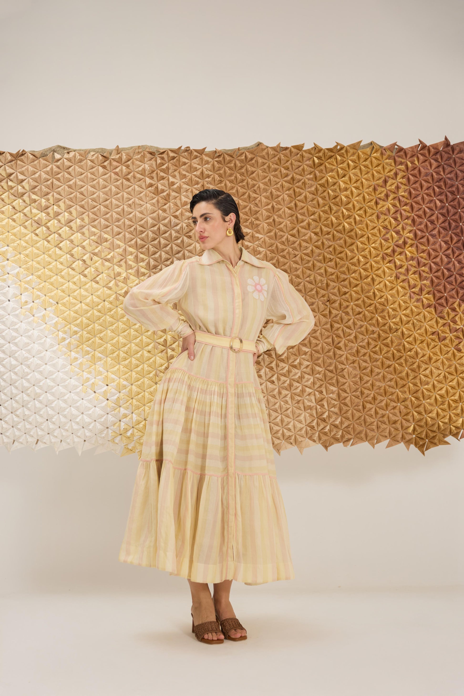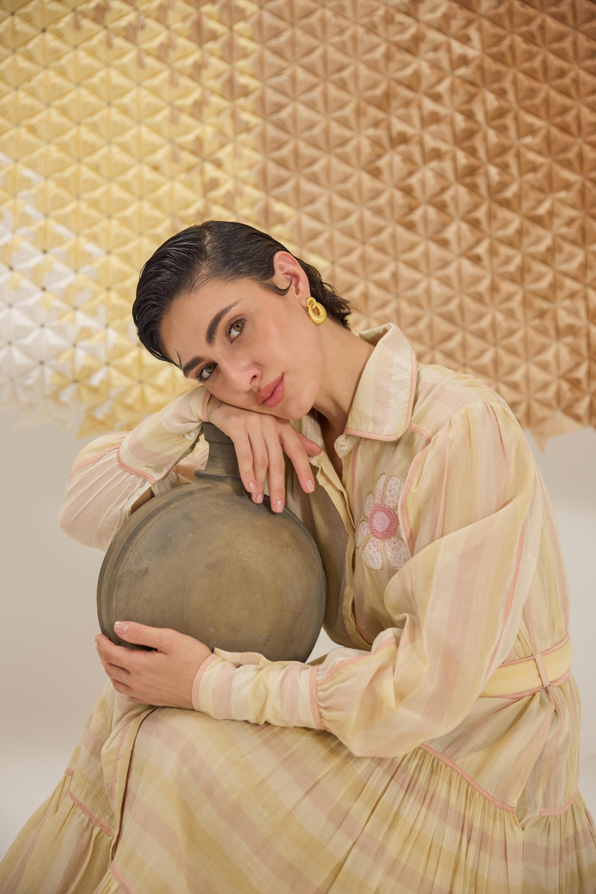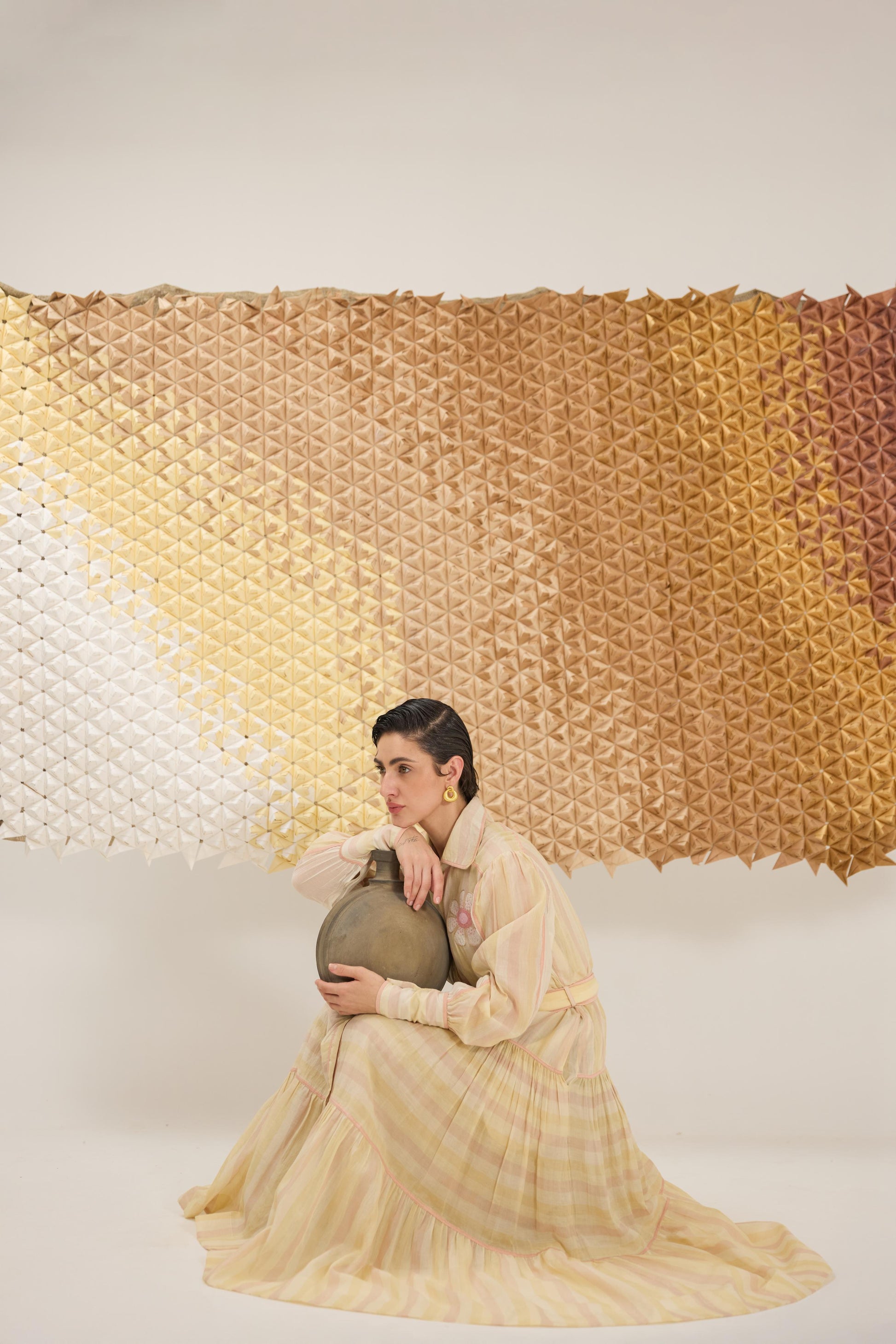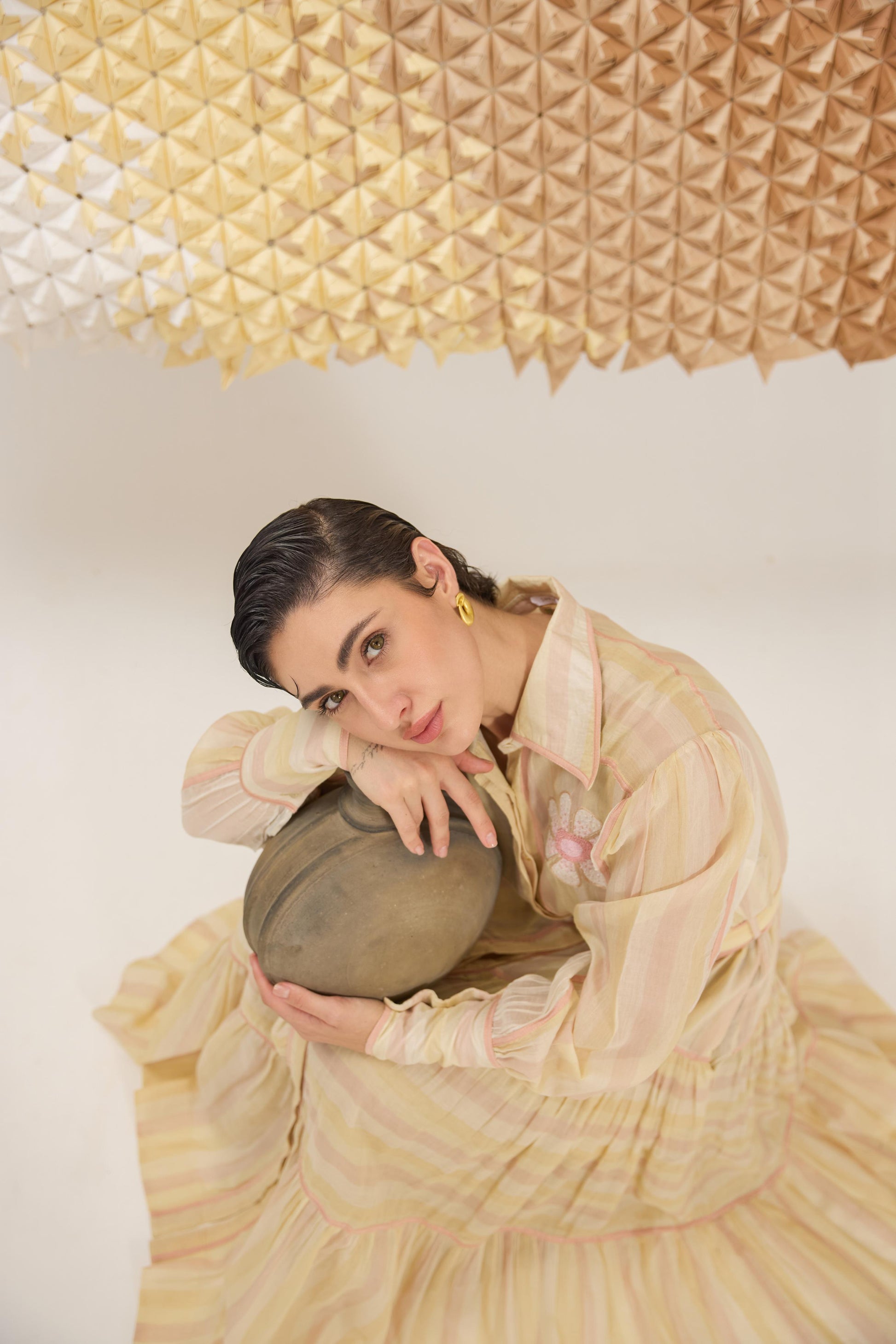 Crafted from hand woven Cotton Silk fabric this dress is a button down flowy dress with voluminous skirt resembling peony petals. Soft pastel shades like blush pink, pale white and soft peach create a romantic, ethereal vibe. Finished with a belt and hand embroidered flower this dress is an embodiment of grace and beauty.