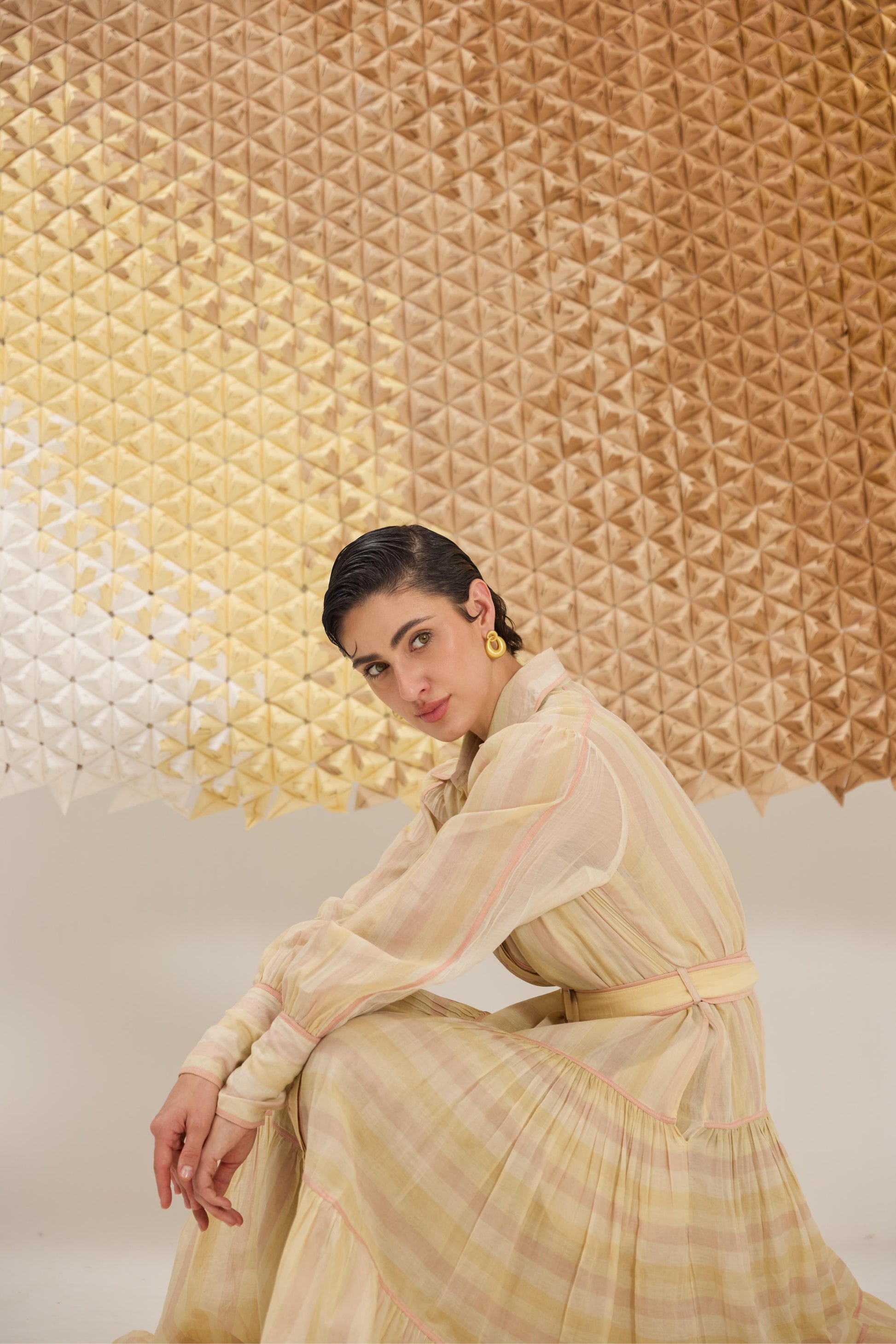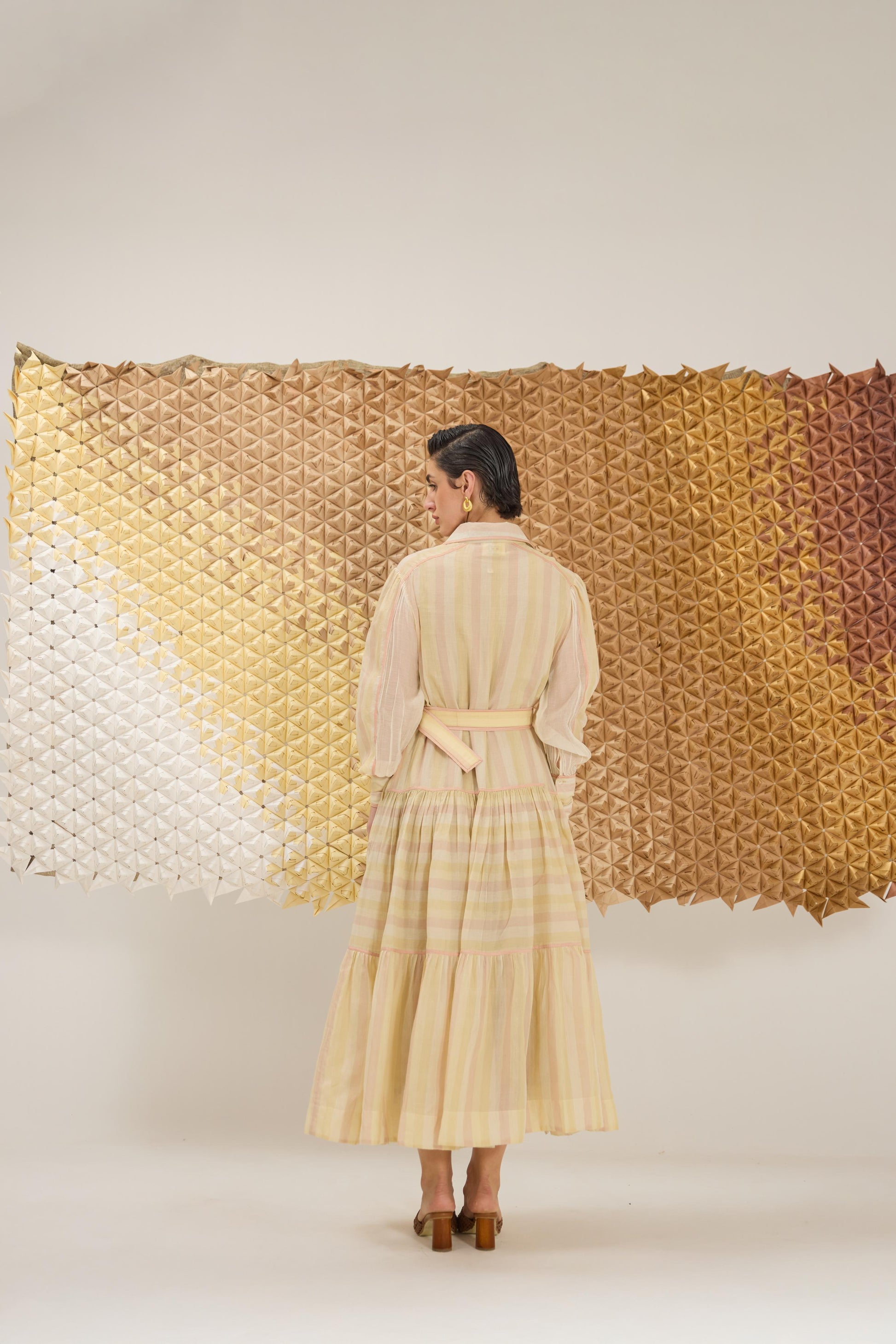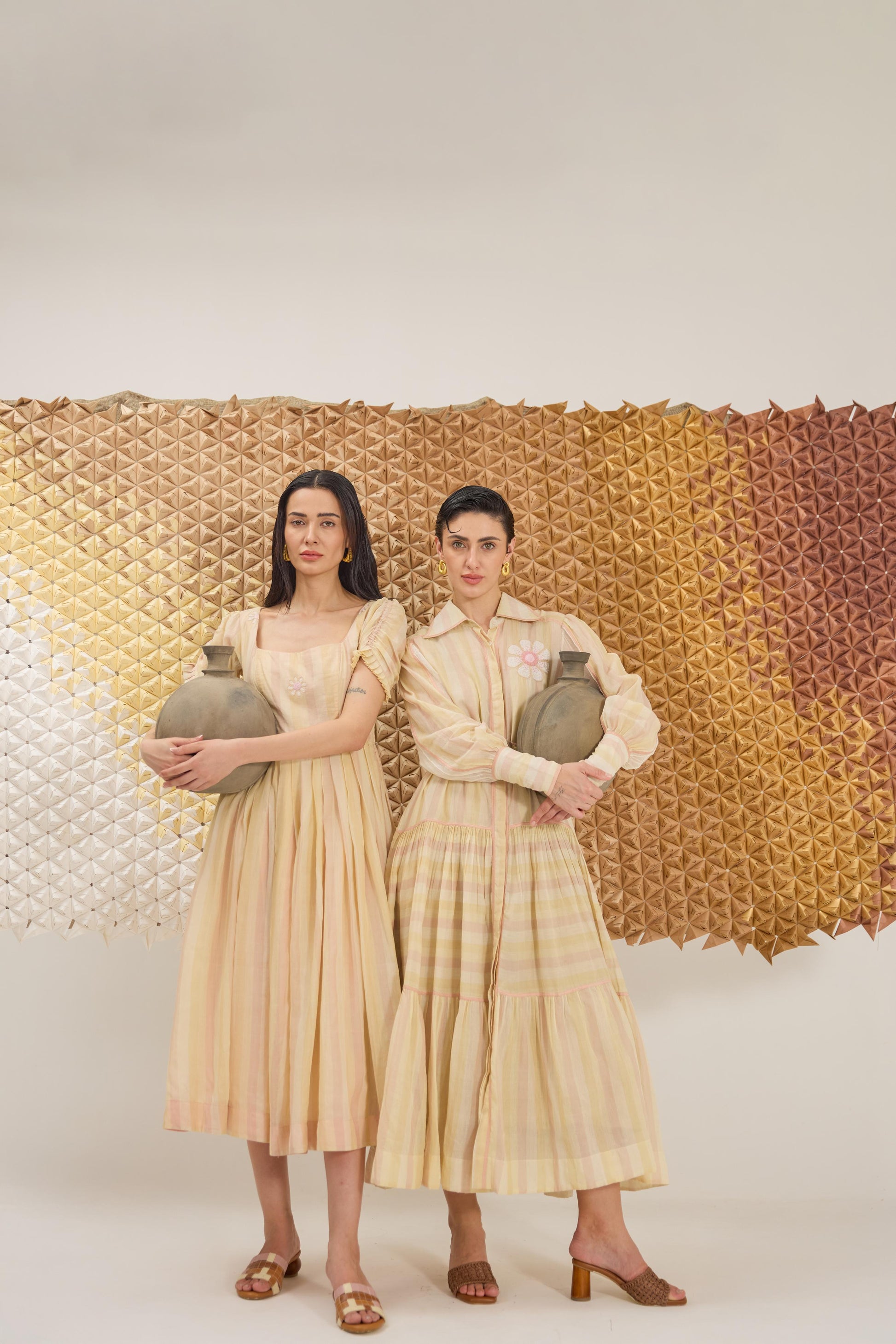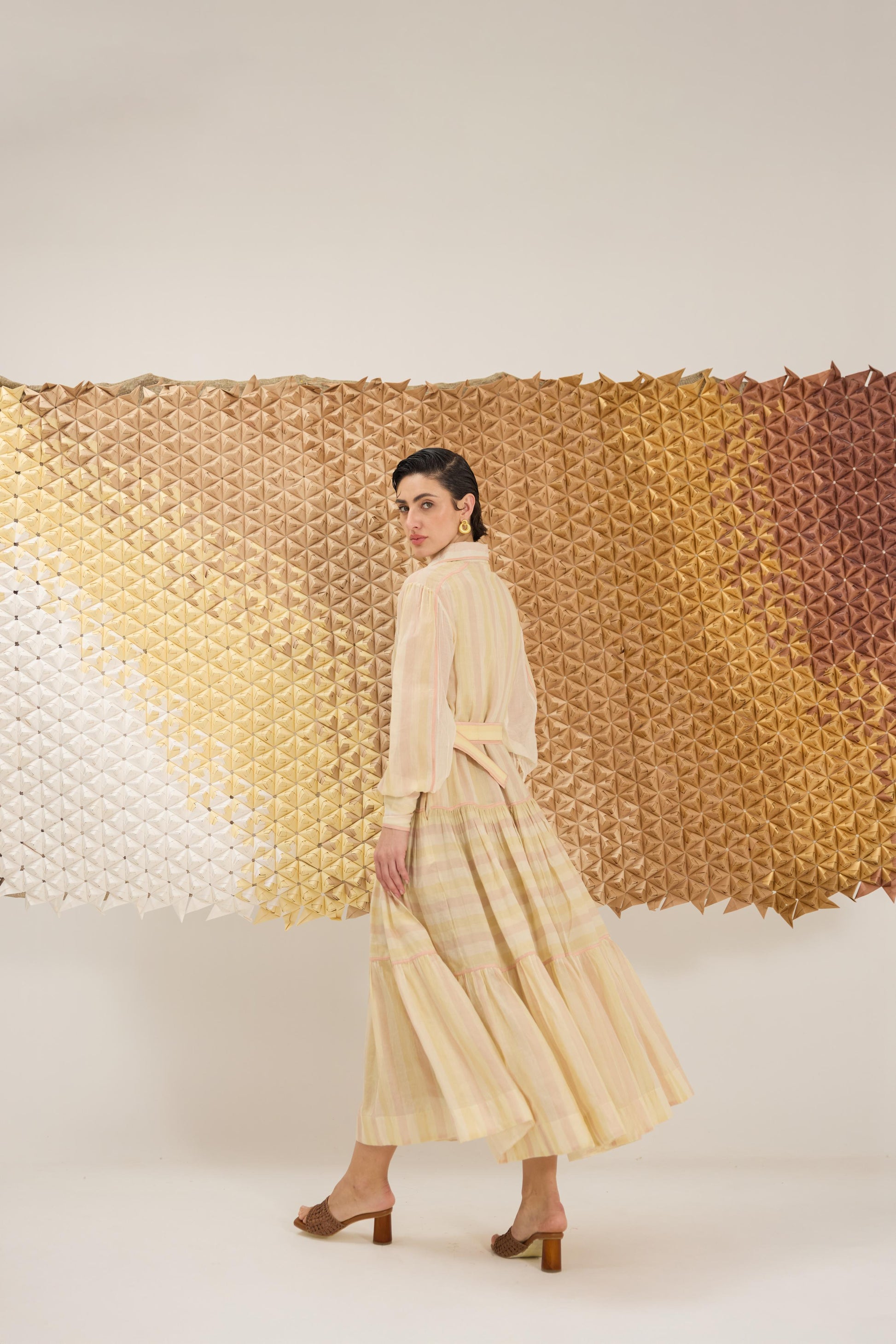 Crafted from hand woven Cotton Silk fabric this dress is a button down flowy dress with voluminous skirt resembling peony petals. Soft pastel shades like blush pink, pale white and soft peach create a romantic, ethereal vibe. Finished with a belt and hand embroidered flower this dress is an embodiment of grace and beauty.