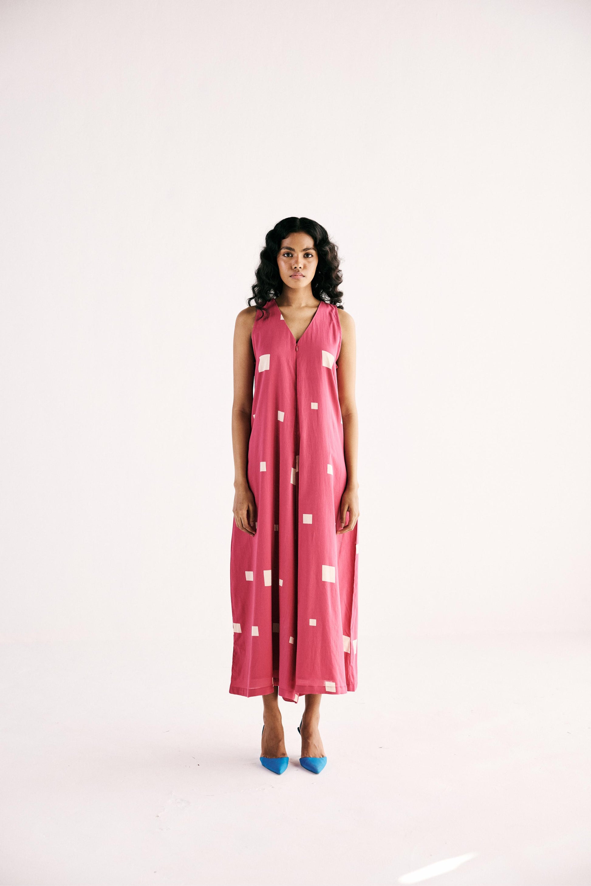 A pink printed jumpsuit with a front zipper opening and v neckline in classic A line silhouette. crafted in soft breathable cotton mul.