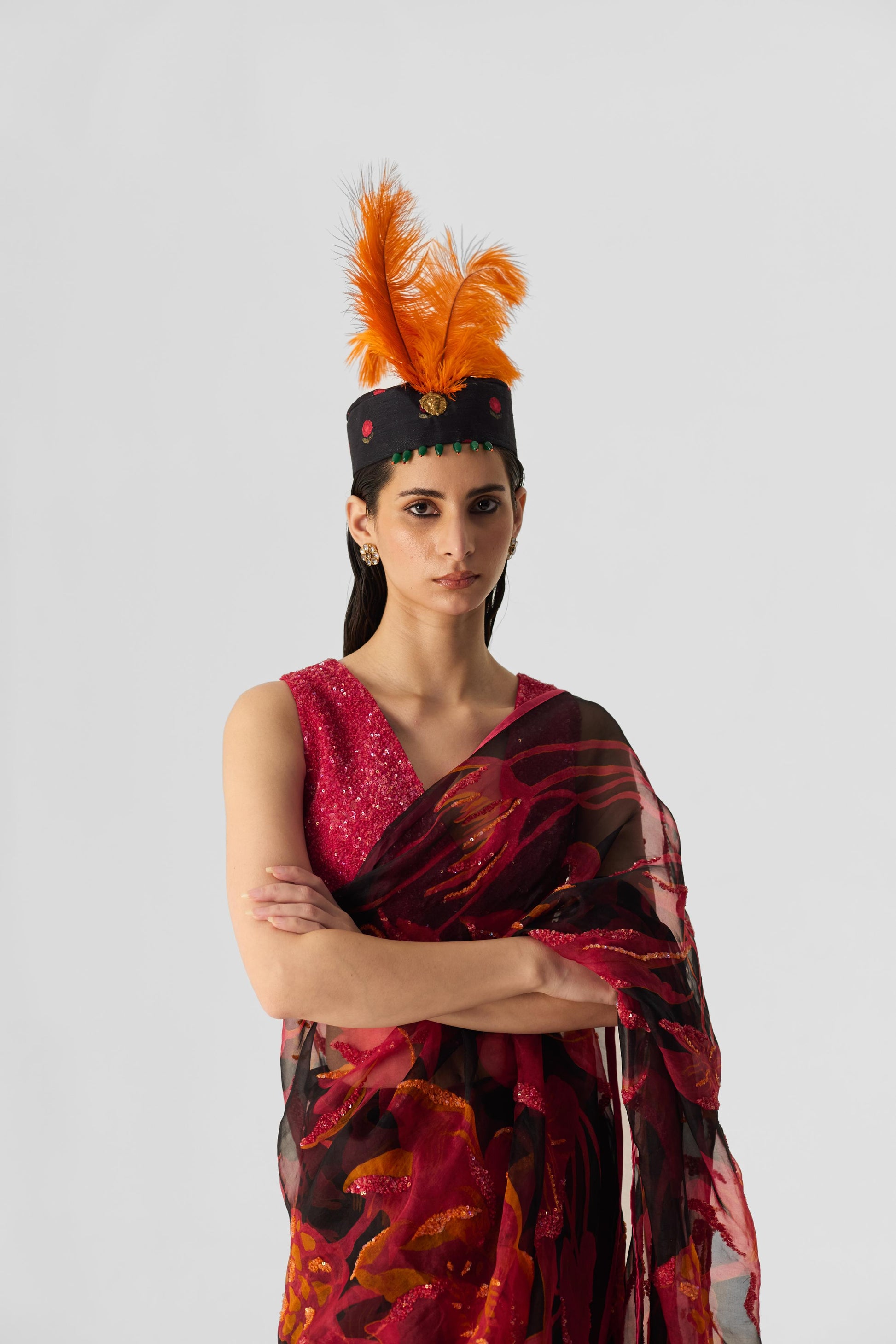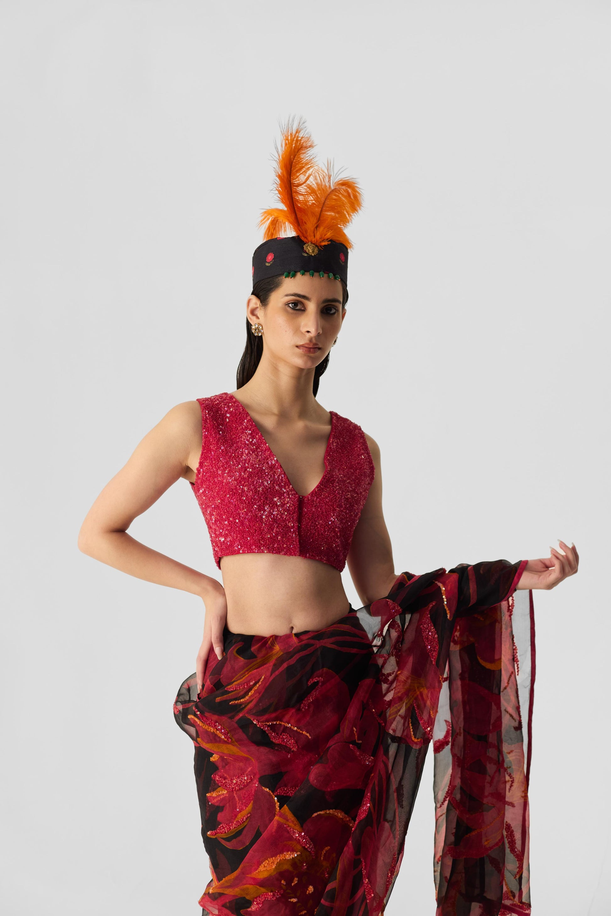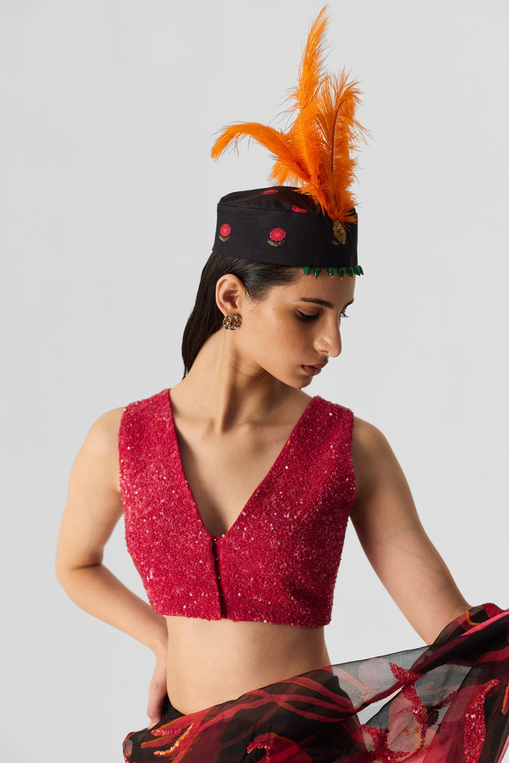 The V-Neck Blouse, beautifully crafted from luxurious crepe fabric. This stunning piece features full hand embroidery adorned with vibrant red and pink sequins, evoking a timeless vintage charm perfect for special occasions. Designed with a flattering V-neckline and a convenient front opening secured with hooks and eyes, this blouse seamlessly blends elegance and practicality.